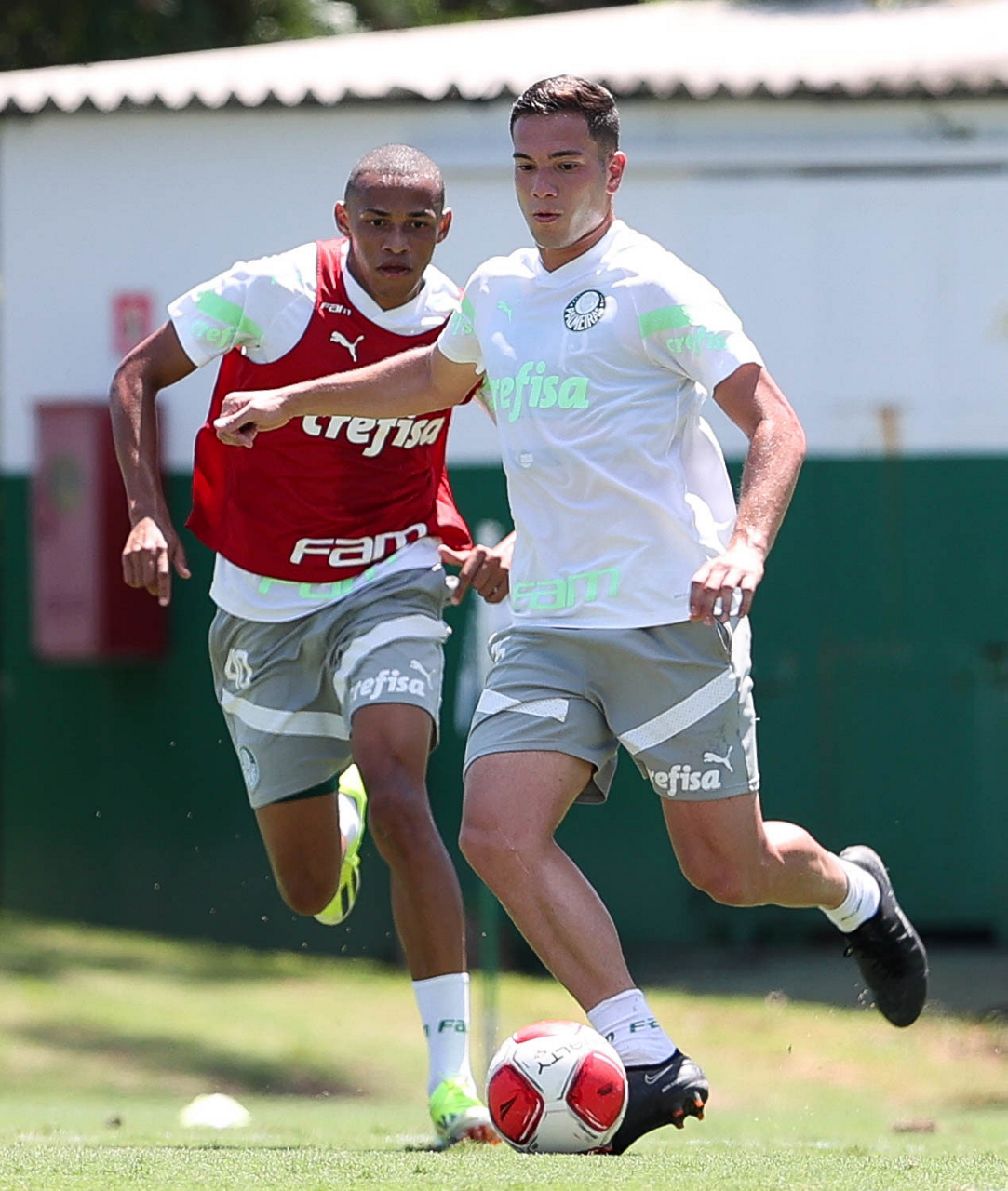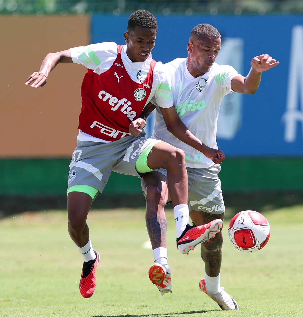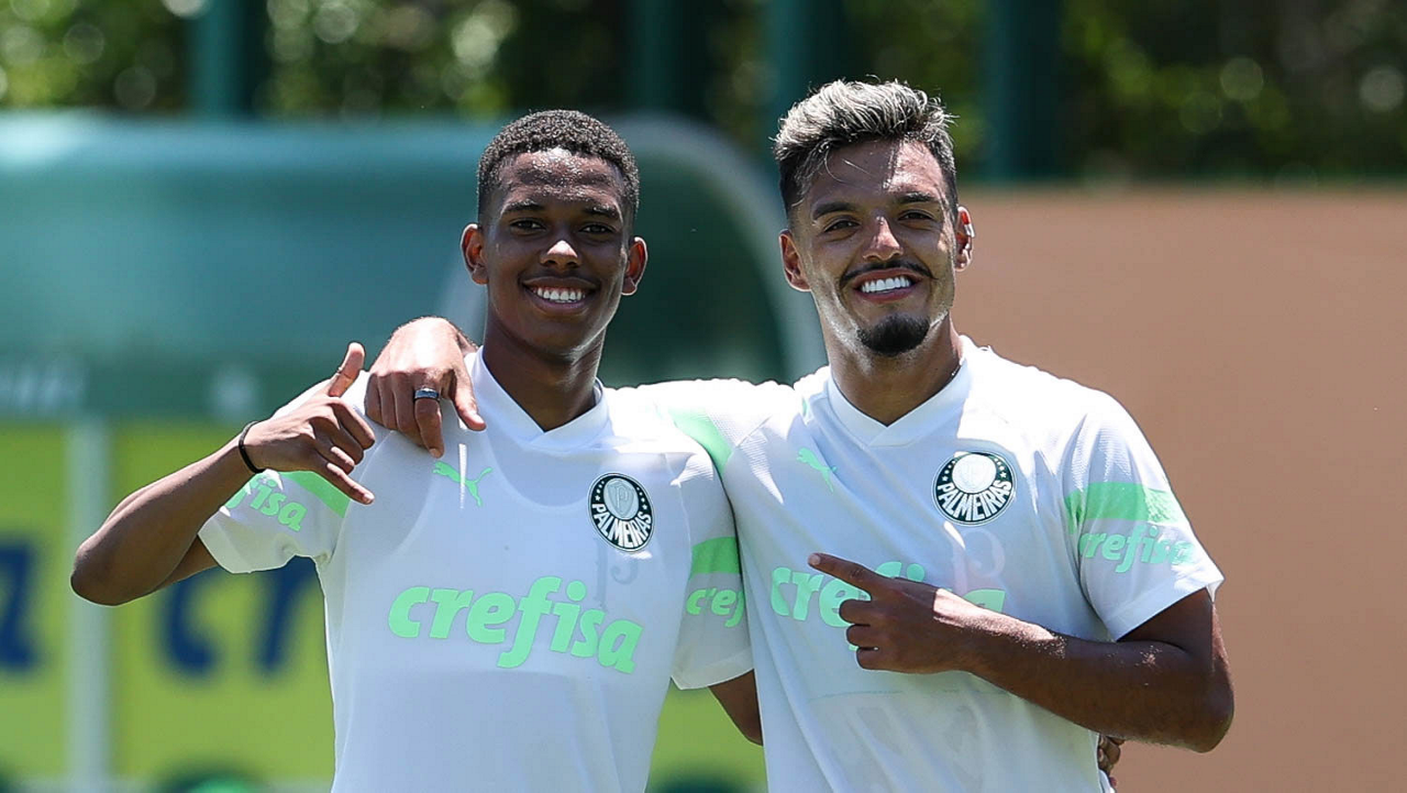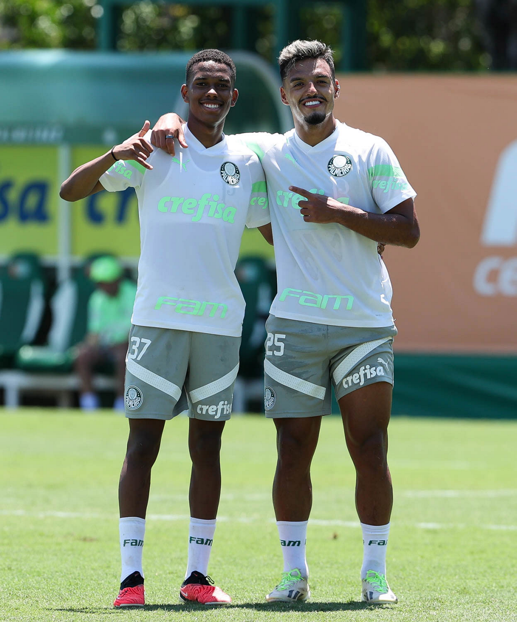 Os jogadores Estêvão e Gabriel Menino (D), da SE Palmeiras, durante treinamento, na Academia de Futebol. (Foto: Cesar Greco/Palmeiras/by Canon)