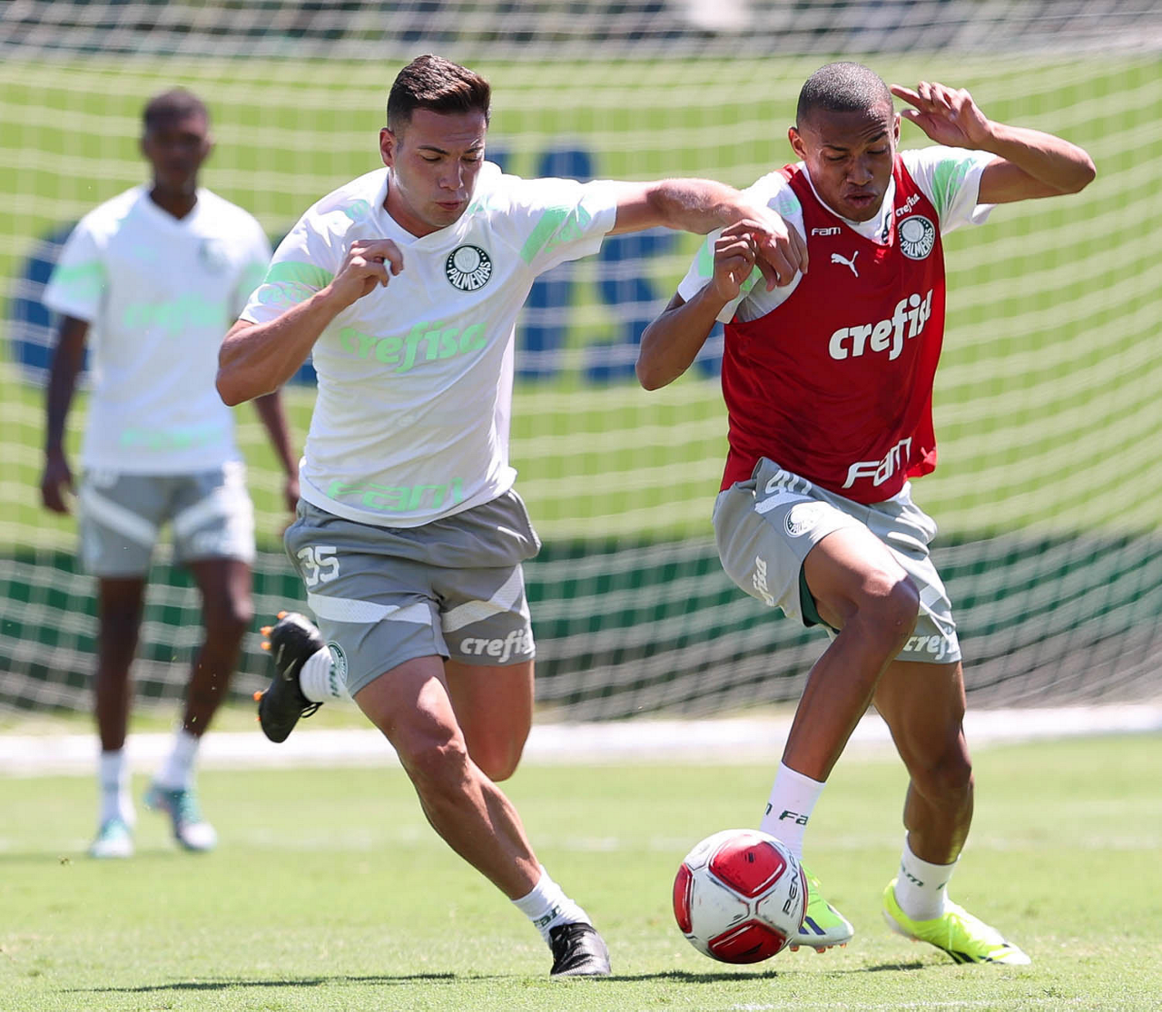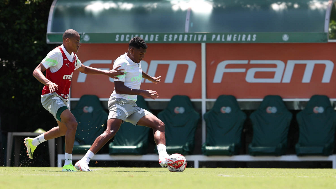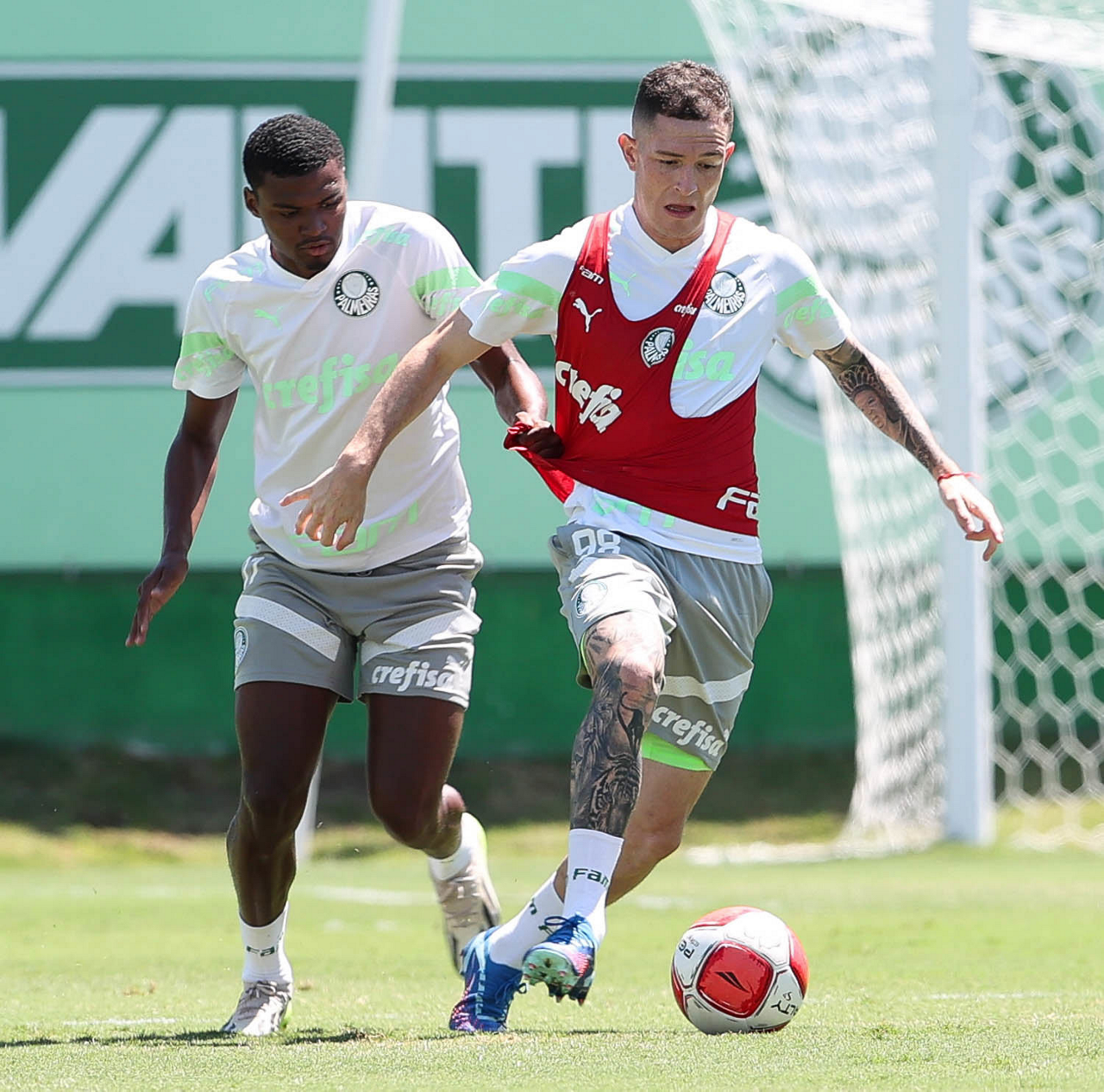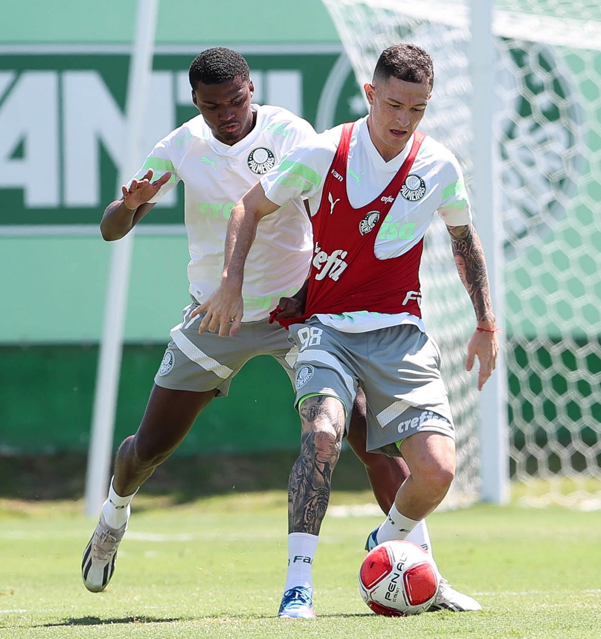 Os jogadores Estêvão e Gabriel Menino (D), da SE Palmeiras, durante treinamento, na Academia de Futebol. (Foto: Cesar Greco/Palmeiras/by Canon)