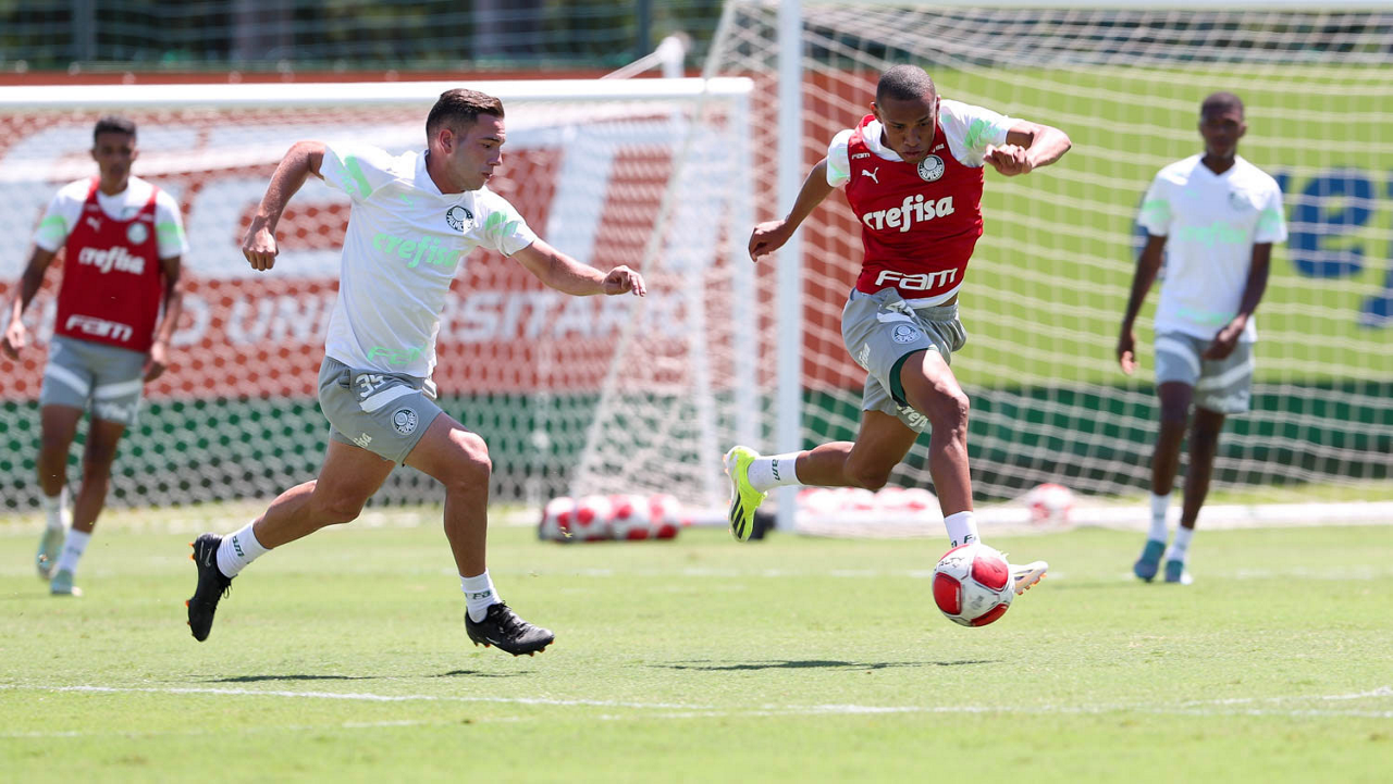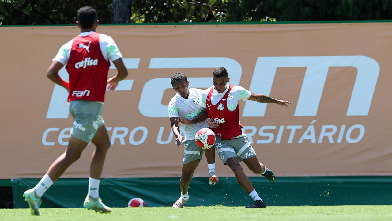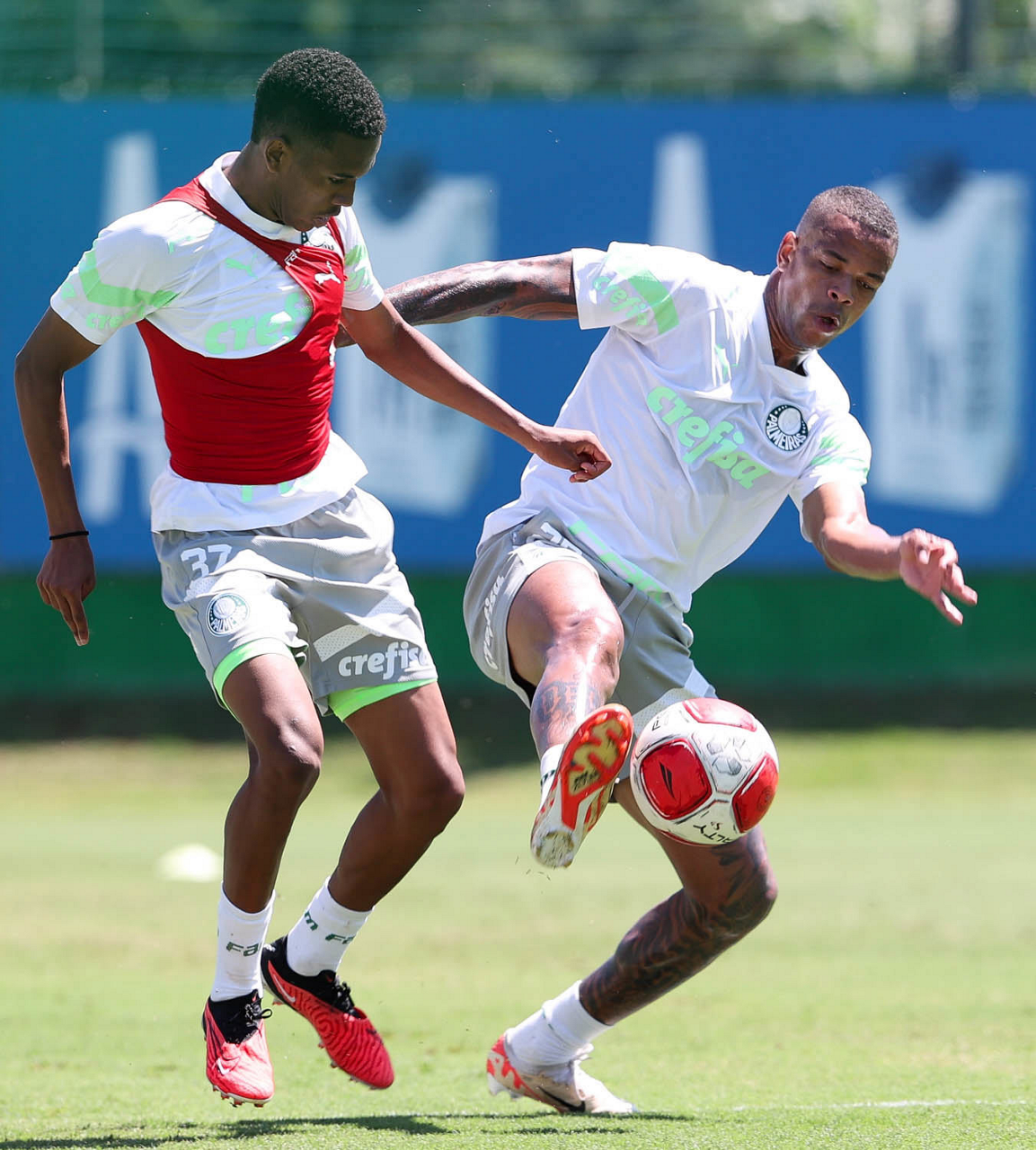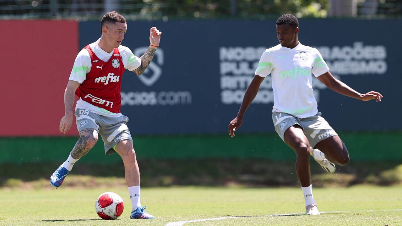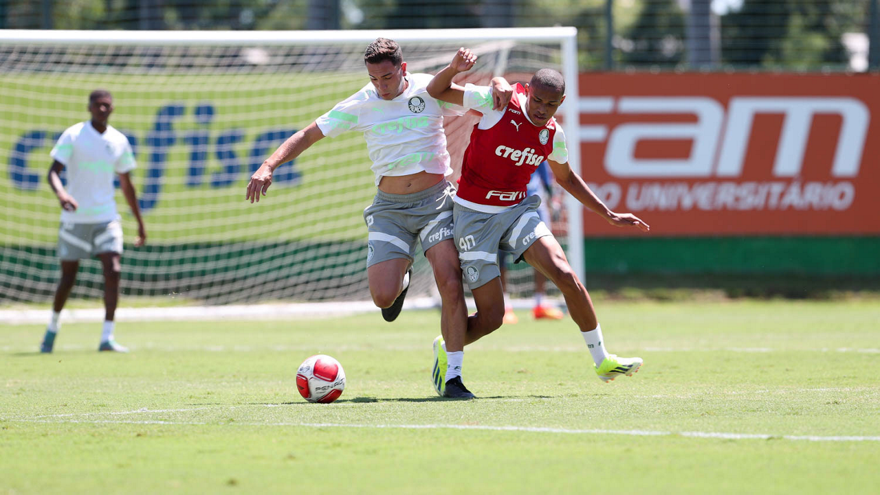 Os jogadores Estêvão e Gabriel Menino (D), da SE Palmeiras, durante treinamento, na Academia de Futebol. (Foto: Cesar Greco/Palmeiras/by Canon)