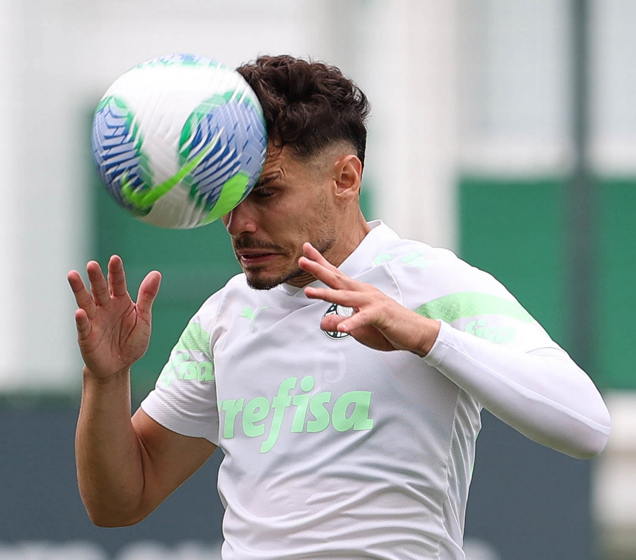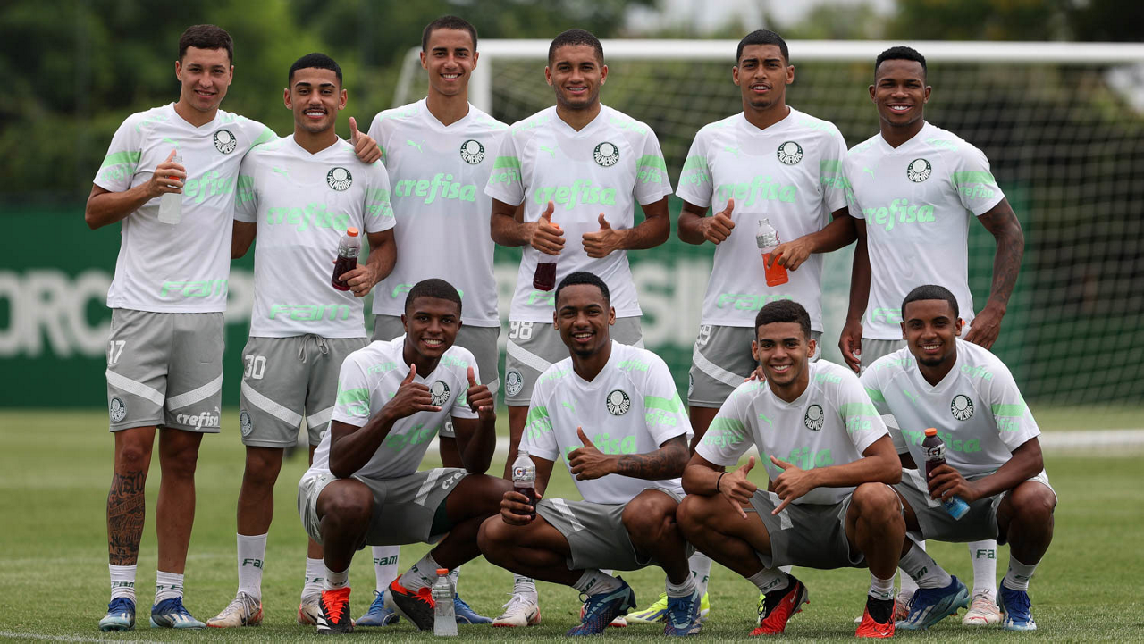 Os jogadores Vanderlan, Flaco López, Richard Ríos, Naves, Anibal Moreno, Jhonatan e Fabinho (E/D em pé) e Gustavo Gómez, Luis Guilherme, Joaquín Piquerez e Estêvão (E/D agachados), da SE Palmeiras, durante treinamento, na Academia de Futebol. (Foto: Cesar Greco/Palmeiras/by Canon)