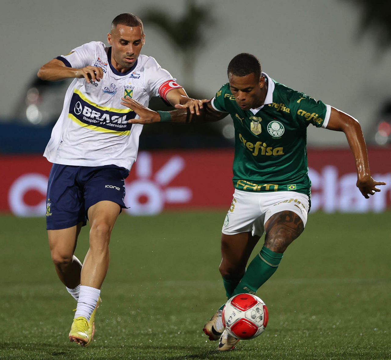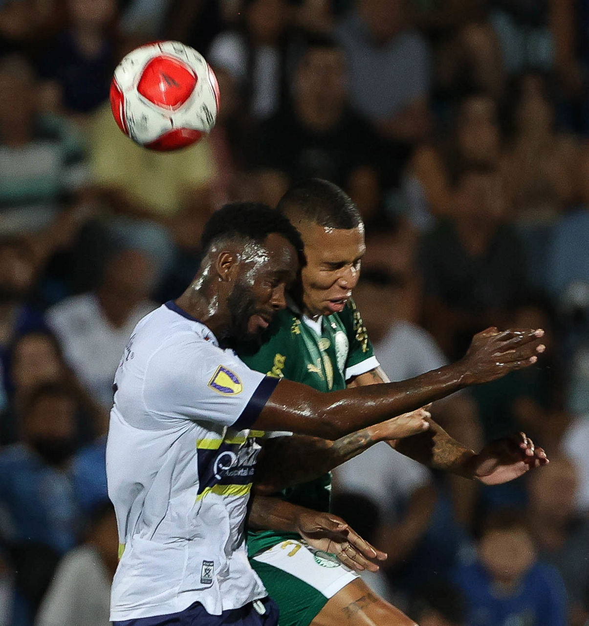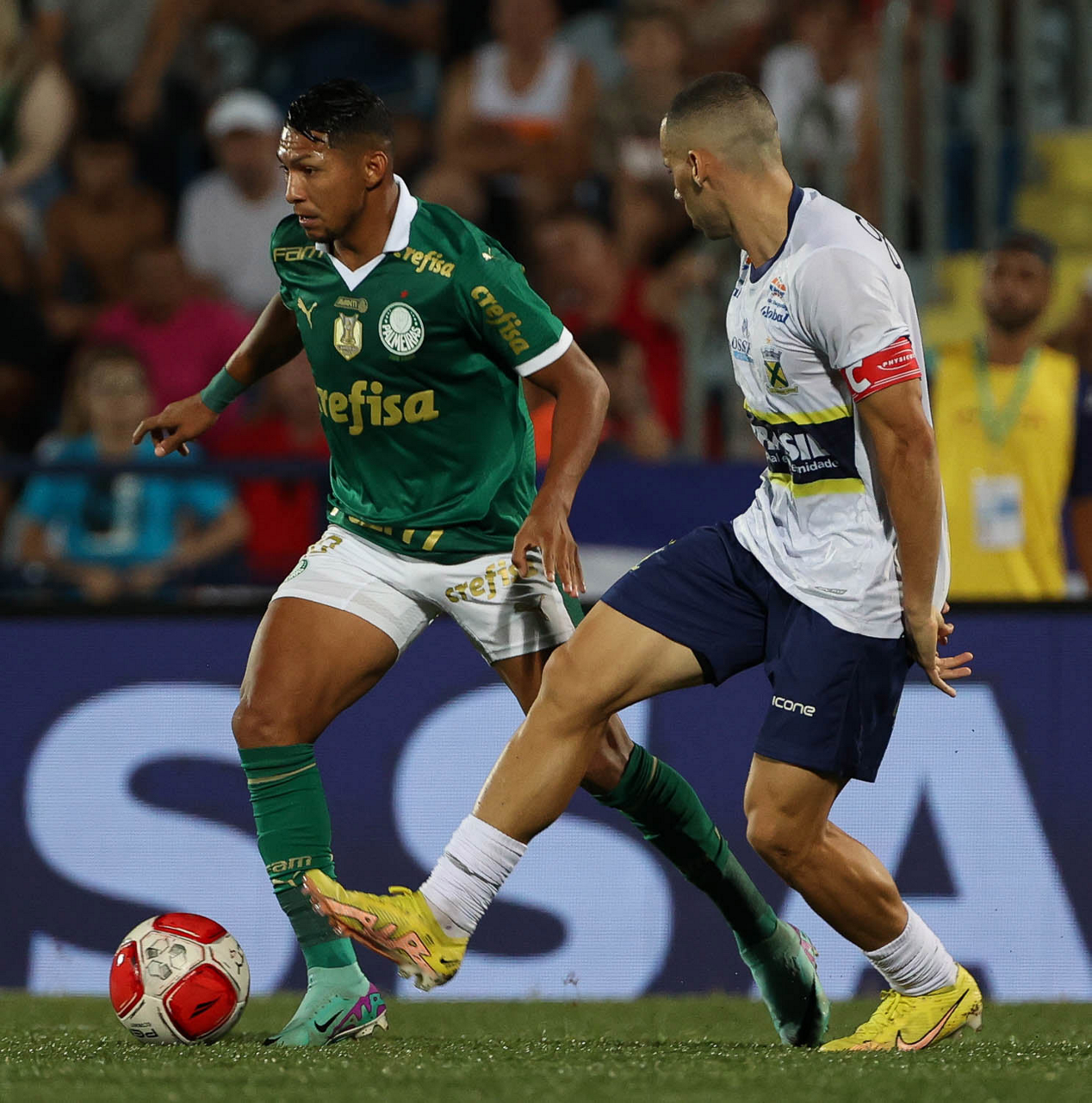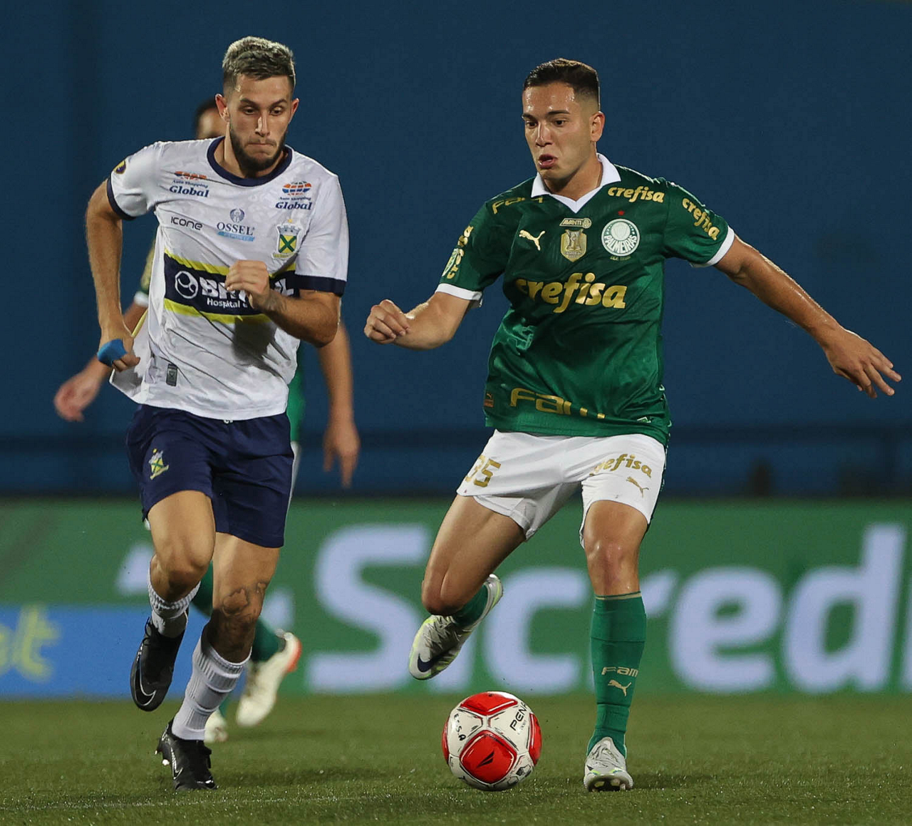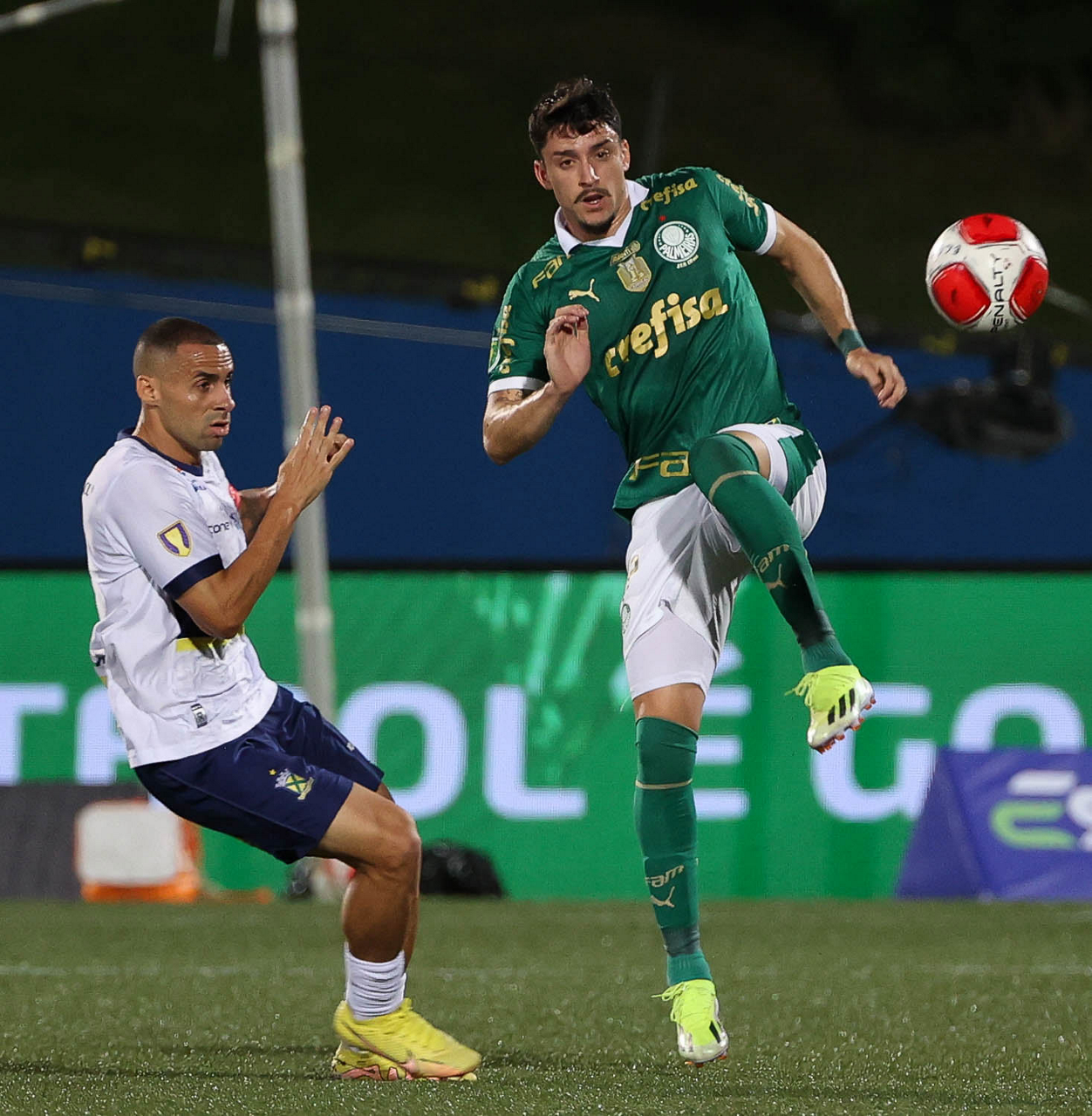 O jogador Richard Ríos, da SE Palmeiras, disputa bola com o jogador do EC Santo André, durante partida válida pela quinta rodada, do Campeonato Paulista, Série A1, no Estádio Bruno José Daniel. (Foto: Cesar Greco/Palmeiras/by Canon)