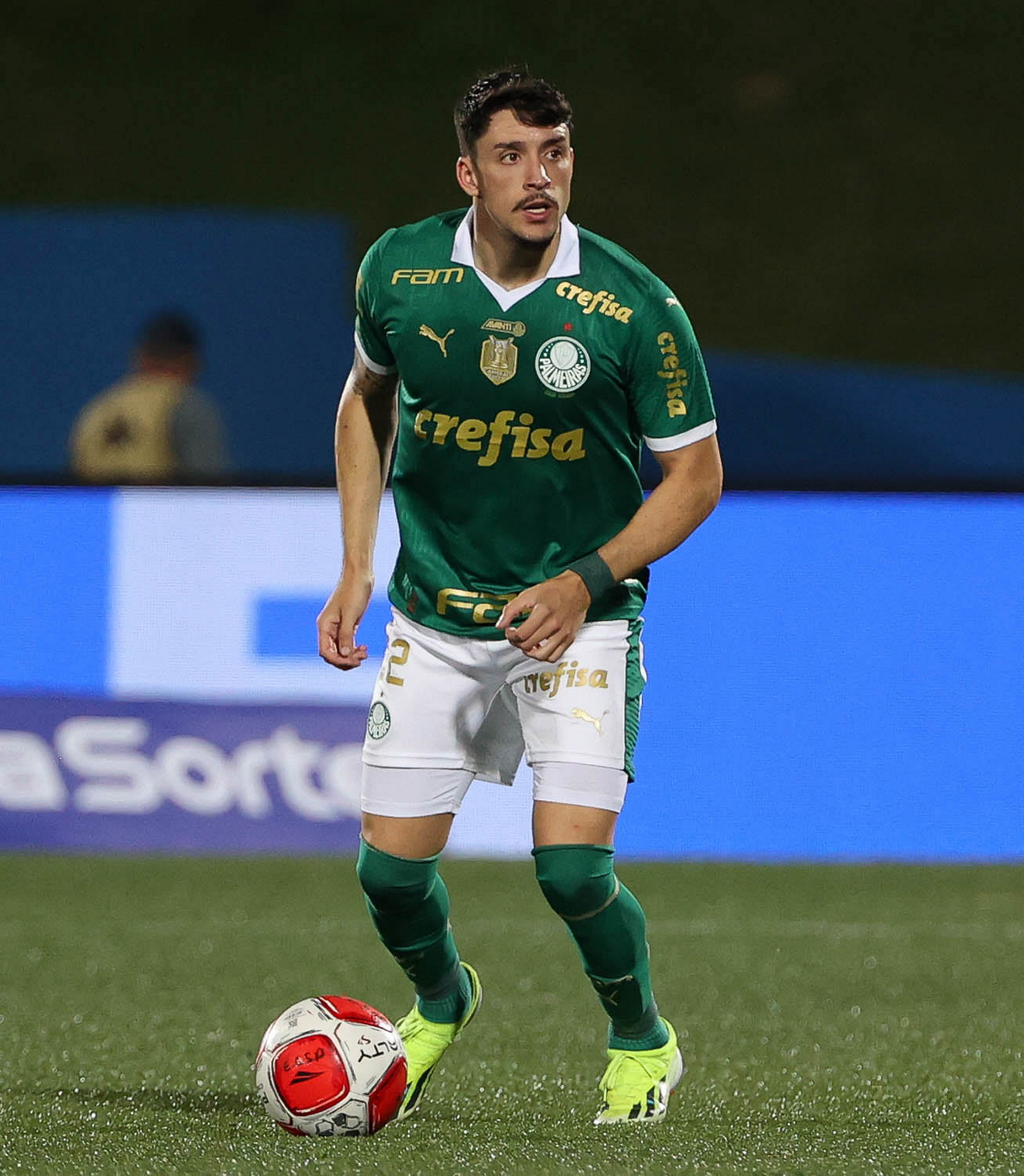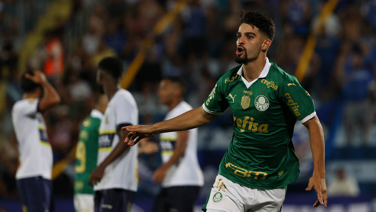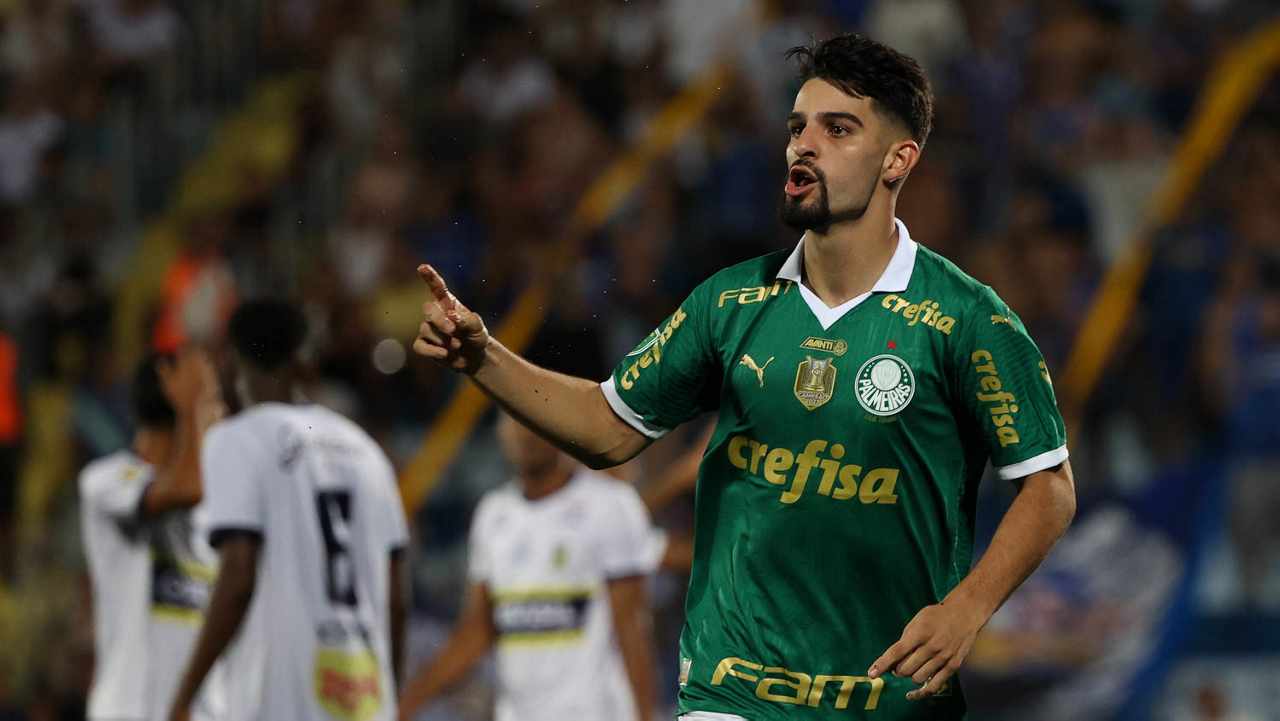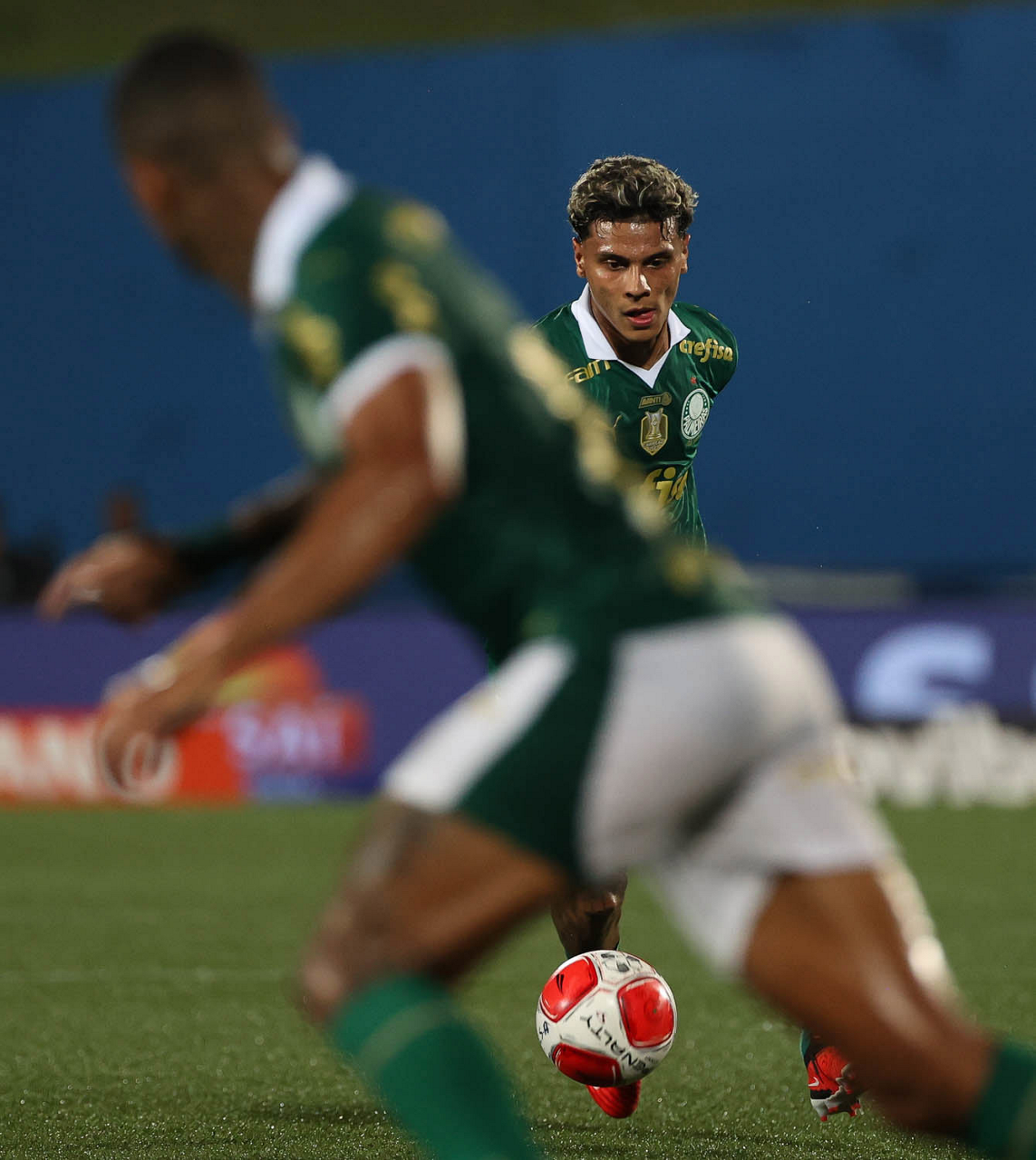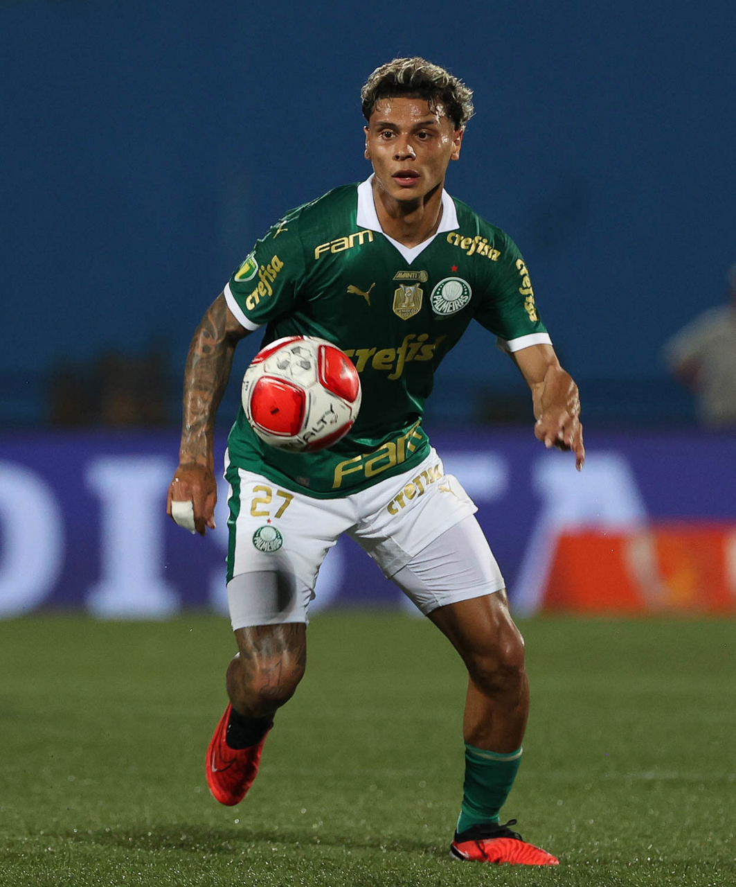 O jogador Richard Ríos, da SE Palmeiras, em jogo contra a equipe do EC Santo André, durante partida válida pela quinta rodada, do Campeonato Paulista, Série A1, no Estádio Bruno José Daniel. (Foto: Cesar Greco/Palmeiras/by Canon)