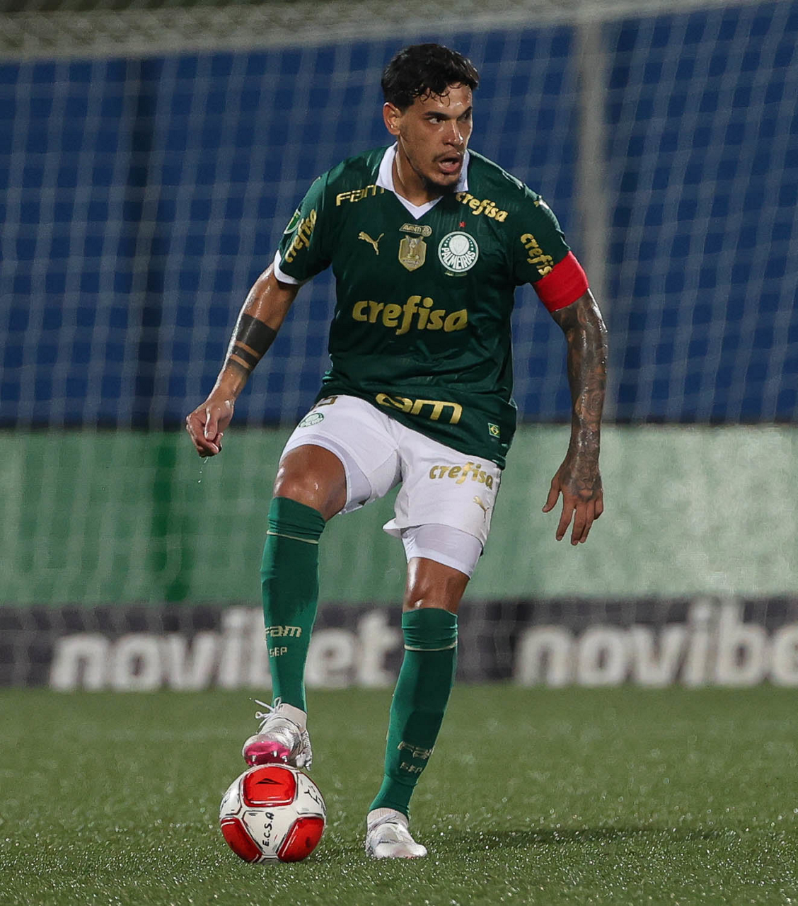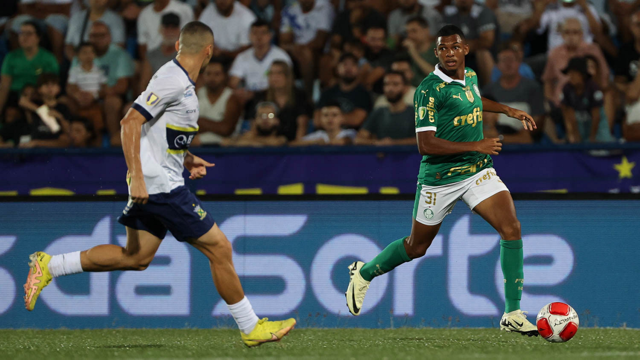 O jogador Gabriel Menino, da SE Palmeiras, em jogo contra a equipe do EC Santo André, durante partida válida pela quinta rodada, do Campeonato Paulista, Série A1, no Estádio Bruno José Daniel. (Foto: Cesar Greco/Palmeiras/by Canon)