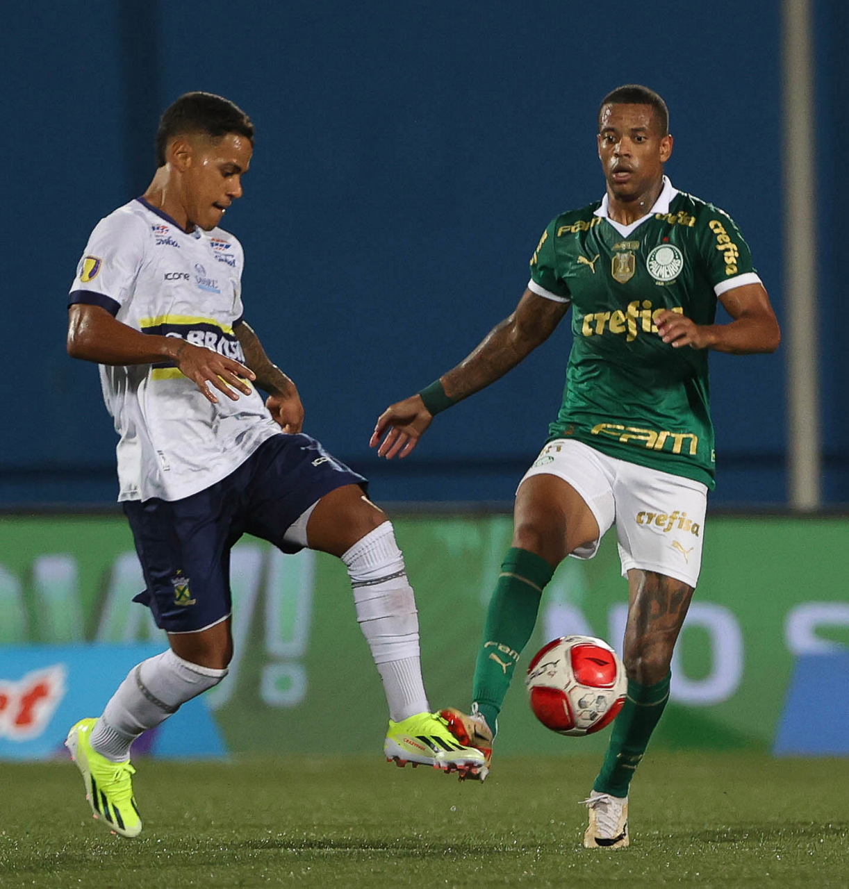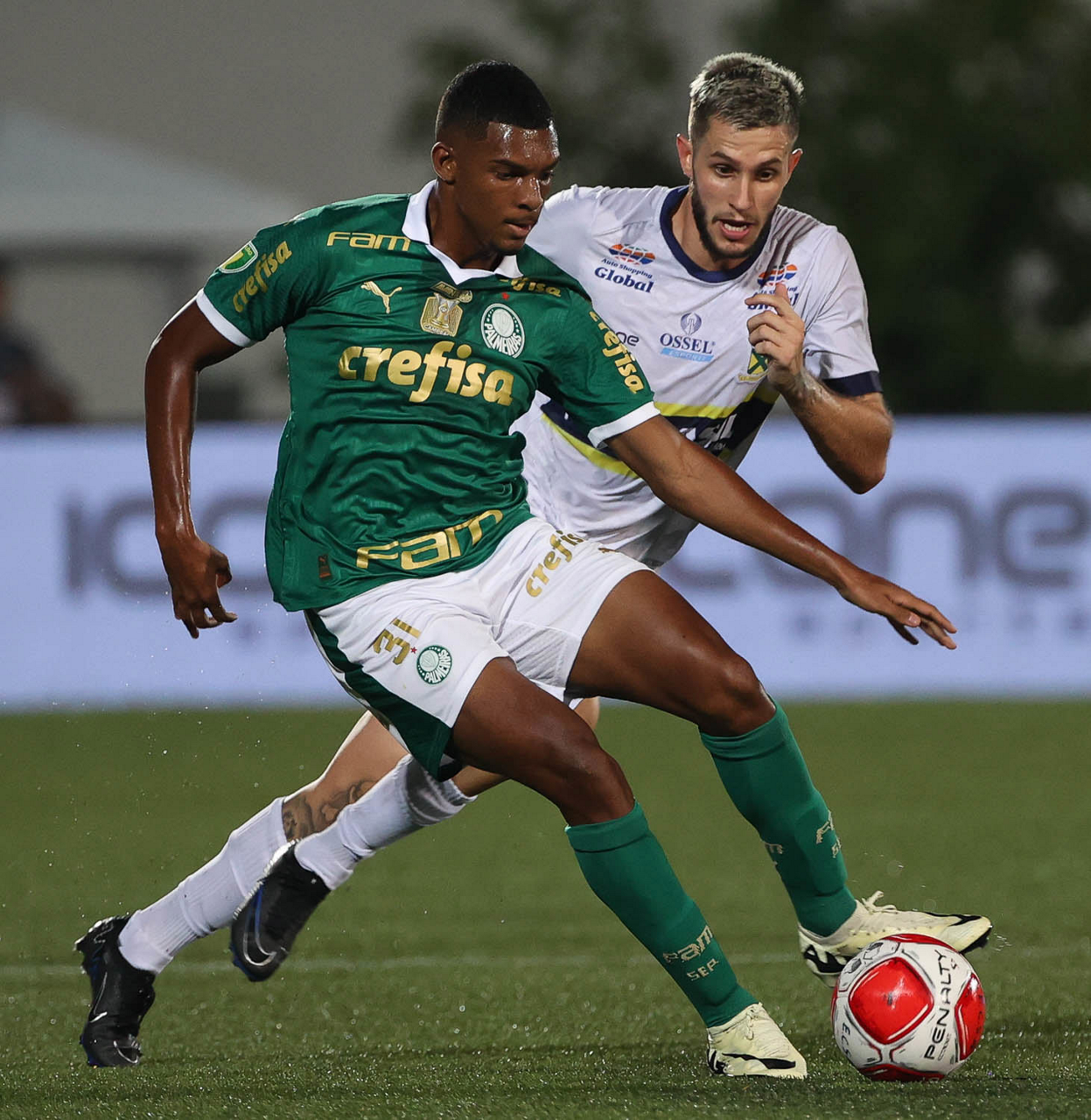 O jogador Gabriel Menino, da SE Palmeiras, disputa bola com o jogador do EC Santo André, durante partida válida pela quinta rodada, do Campeonato Paulista, Série A1, no Estádio Bruno José Daniel. (Foto: Cesar Greco/Palmeiras/by Canon)