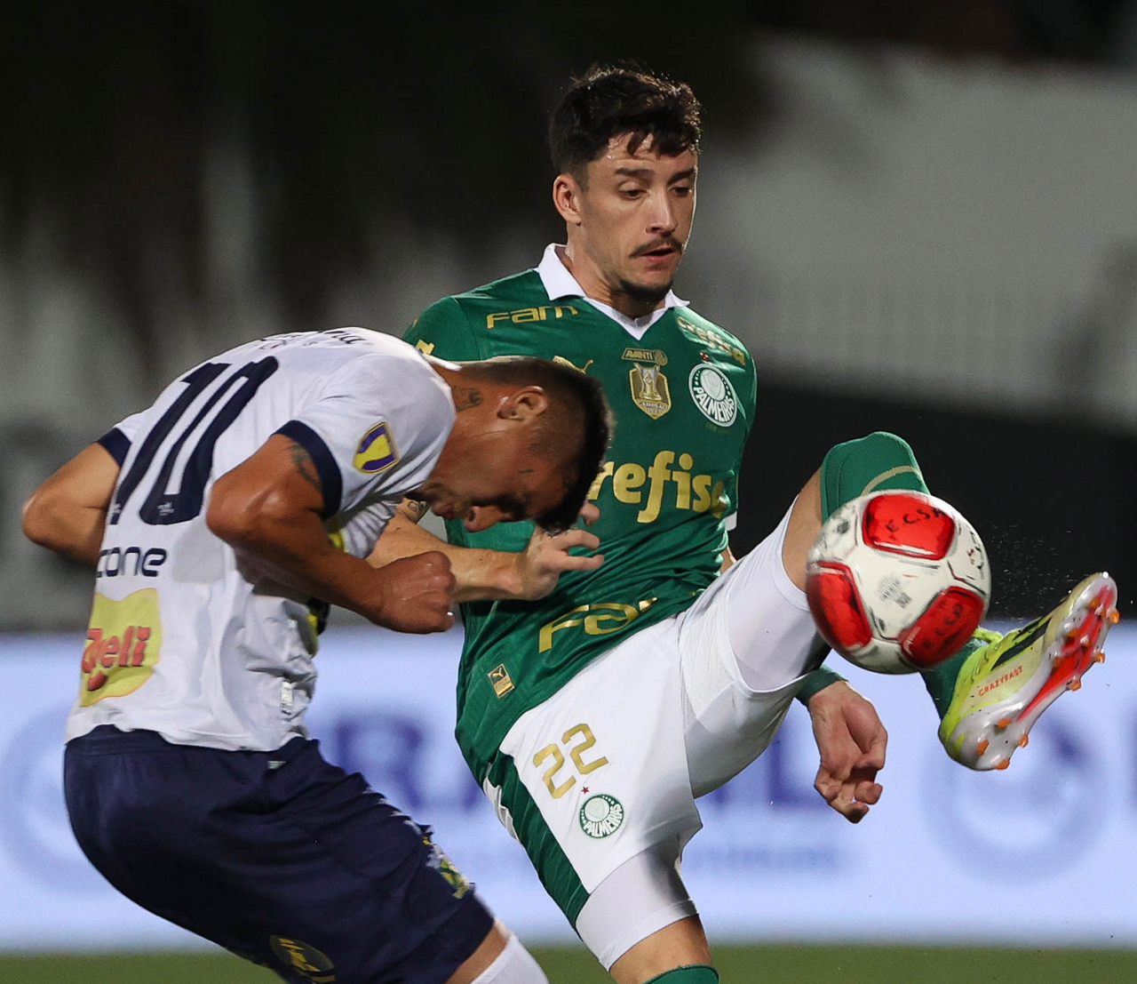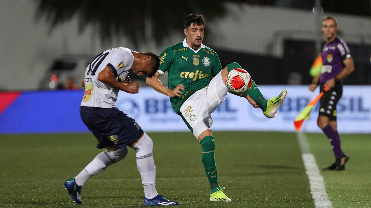 O jogador Joaquín Piquerez, da SE Palmeiras, disputa bola com o jogador do EC Santo André, durante partida válida pela quinta rodada, do Campeonato Paulista, Série A1, no Estádio Bruno José Daniel. (Foto: Cesar Greco/Palmeiras/by Canon)