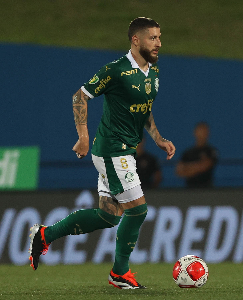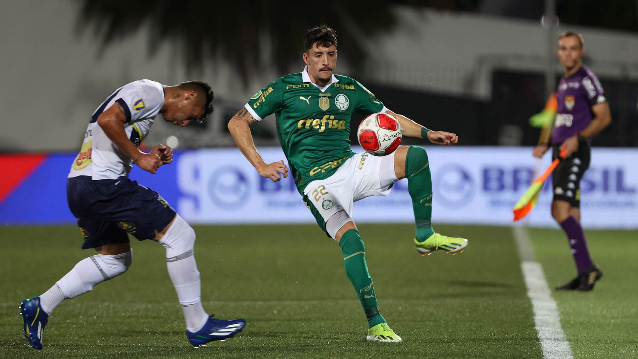 O jogador Joaquín Piquerez, da SE Palmeiras, em jogo contra a equipe do EC Santo André, durante partida válida pela quinta rodada, do Campeonato Paulista, Série A1, no Estádio Bruno José Daniel. (Foto: Cesar Greco/Palmeiras/by Canon)