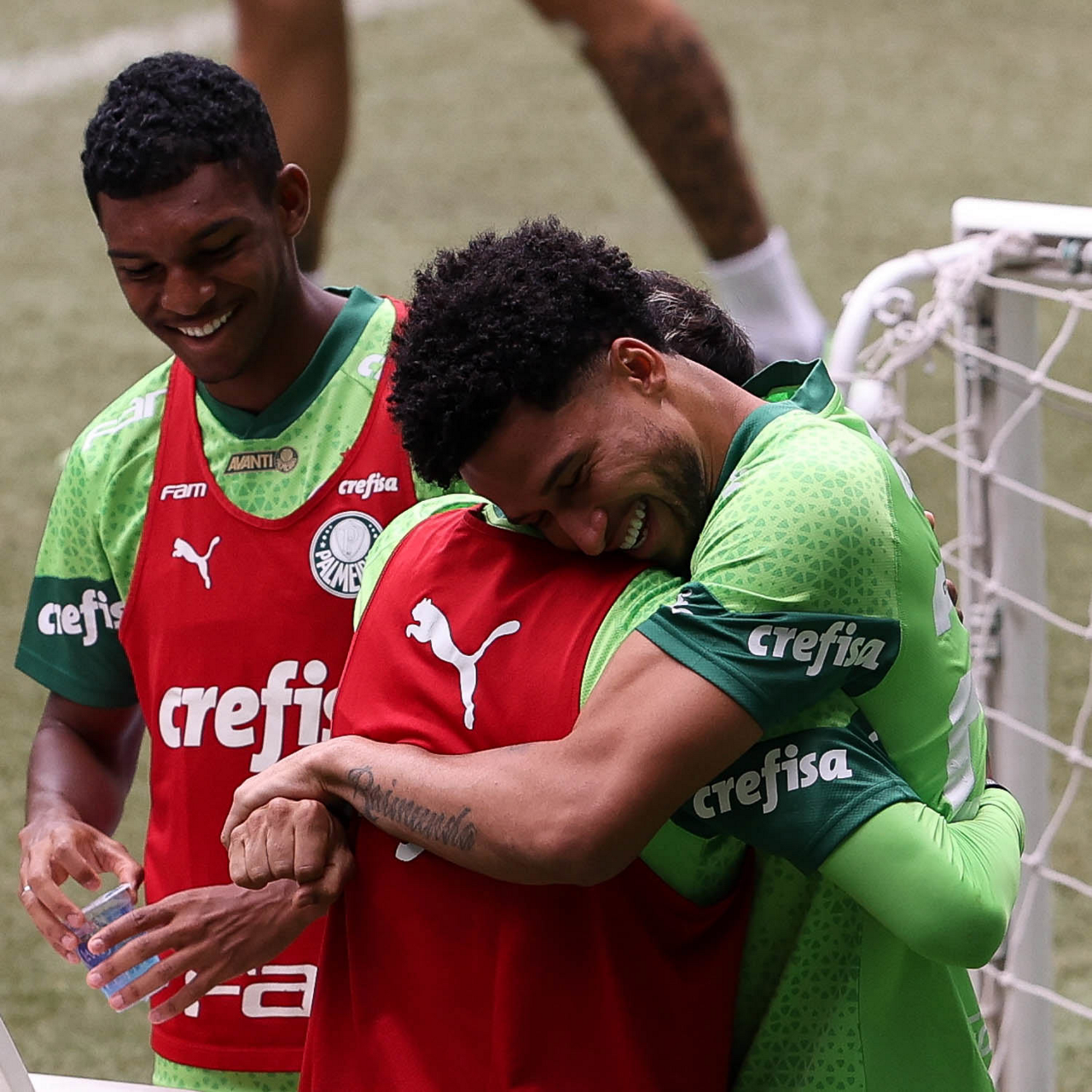 O goleiro Weverton e o jogador Gabriel Menino (D), da SE Palmeiras, durante treinamento, na arena Allianz Parque. (Foto: Cesar Greco/Palmeiras/by Canon)