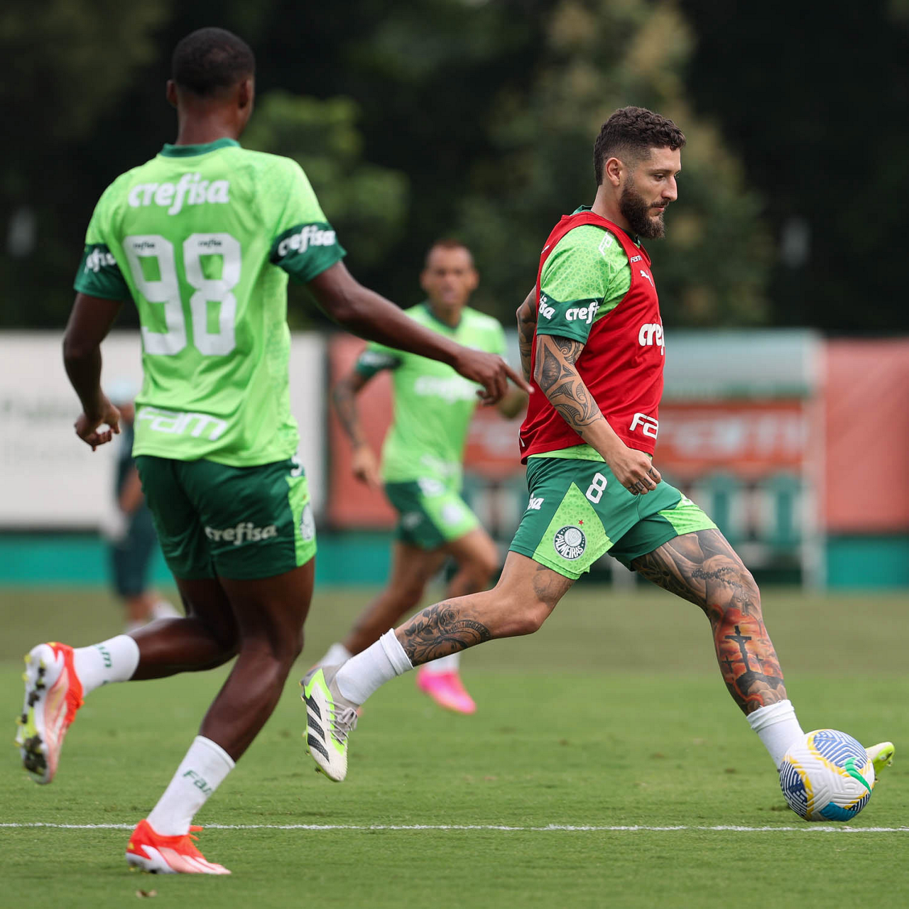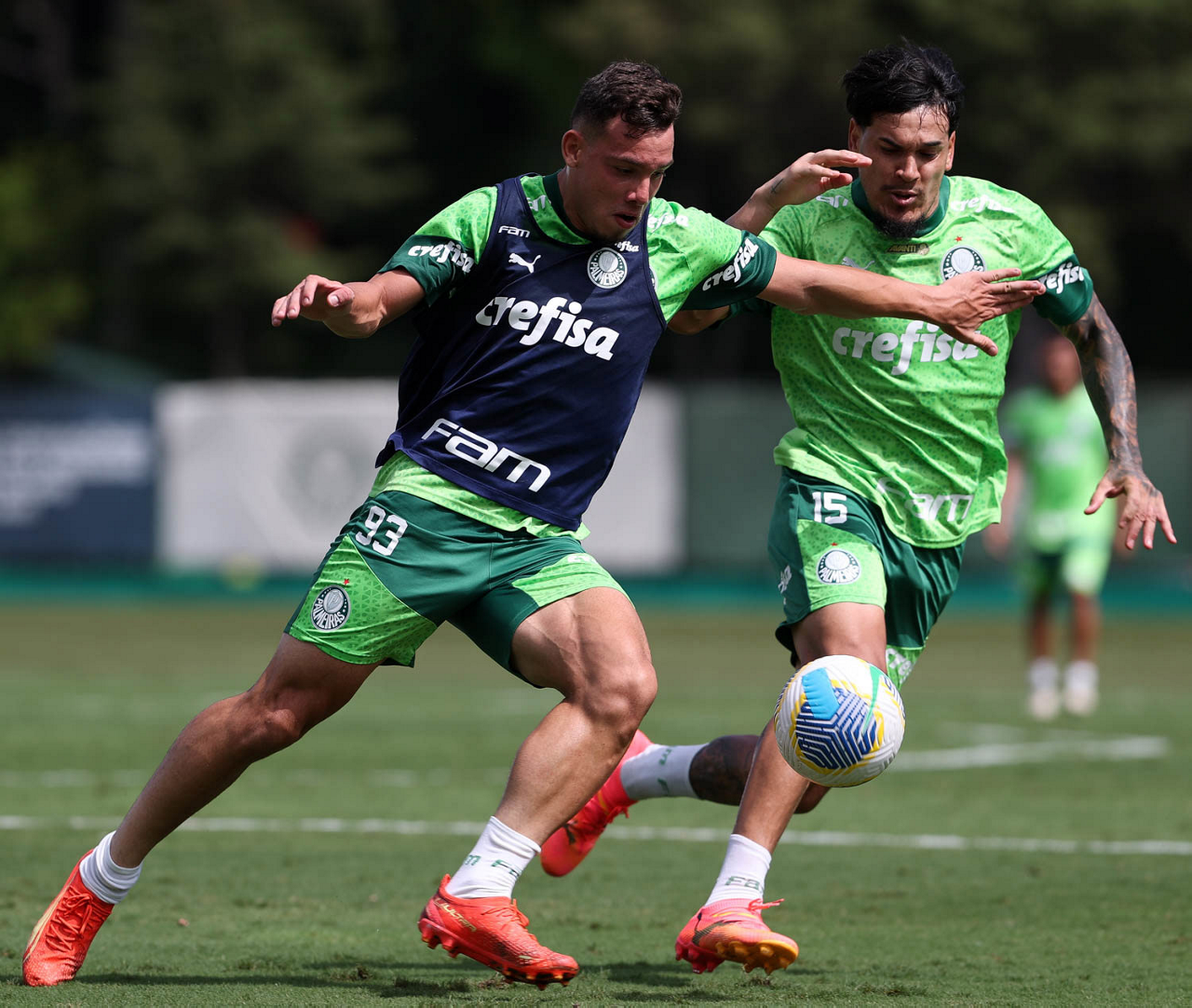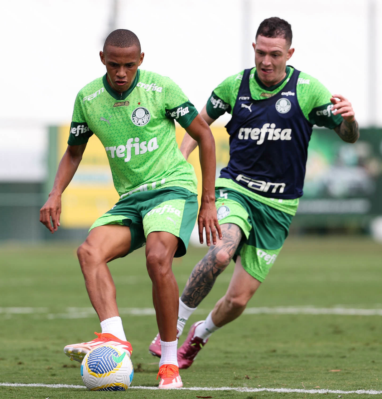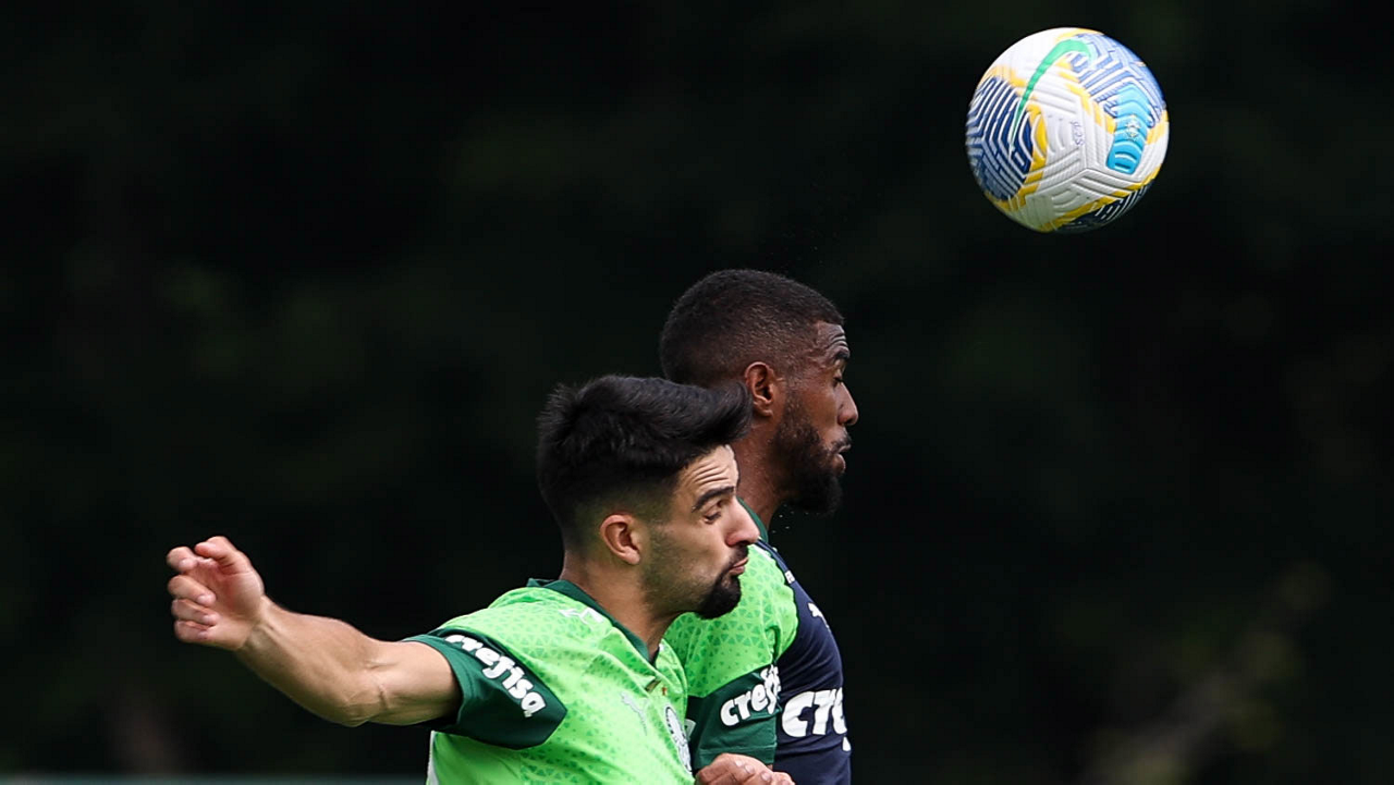 O jogador Flaco López (E), da SE Palmeiras, durante treinamento, na Academia de Futebol. (Foto: Cesar Greco/Palmeiras/by Canon)