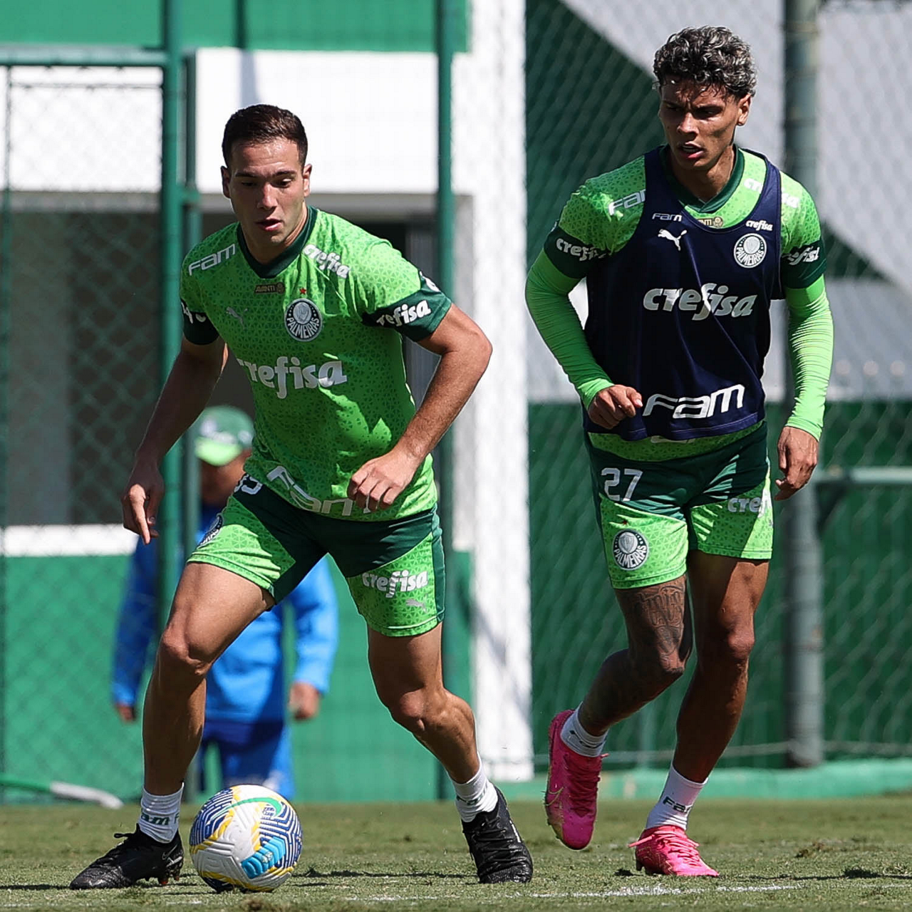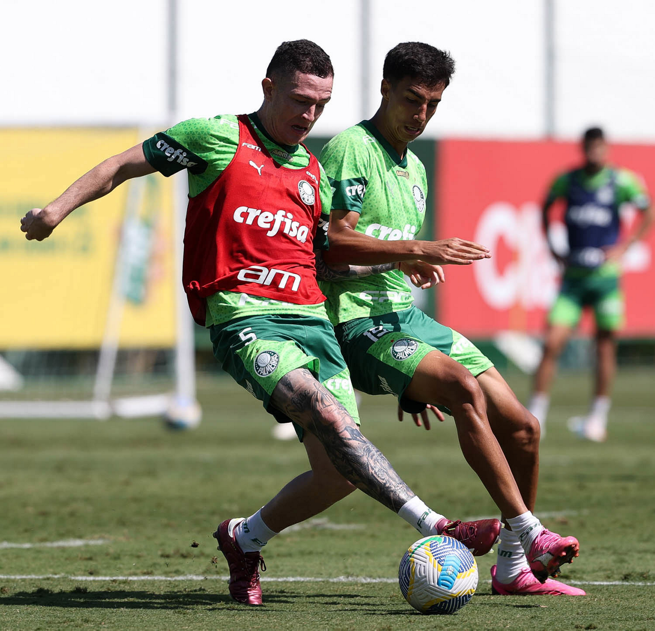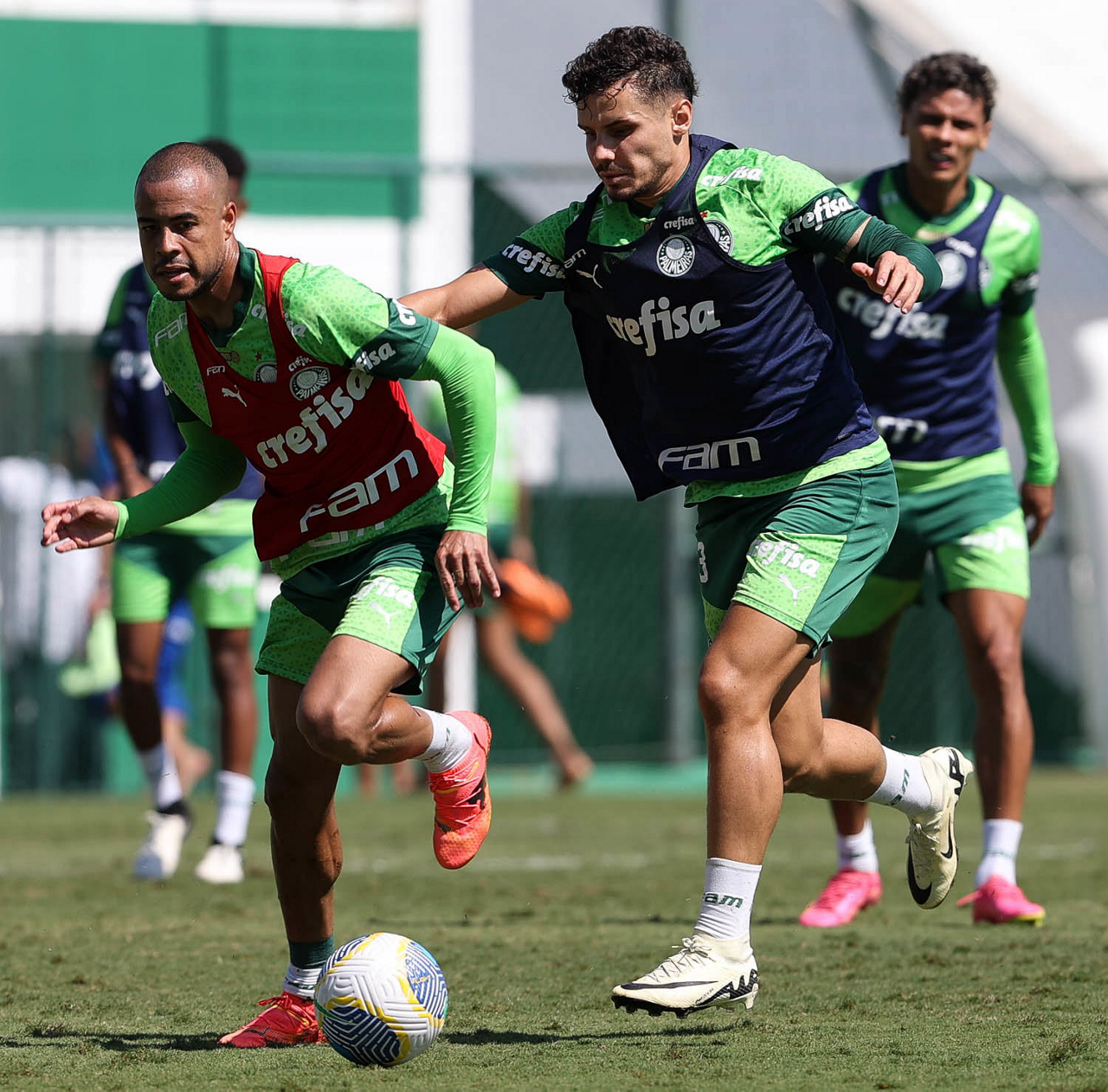 Os jogadores Fabinho e Richard Ríos (D), da SE Palmeiras, durante treinamento, na Academia de Futebol. (Foto: Cesar Greco/Palmeiras/by Canon)