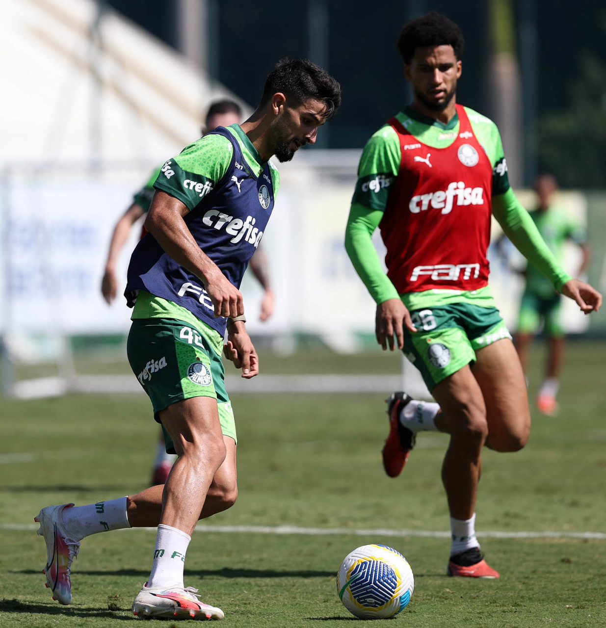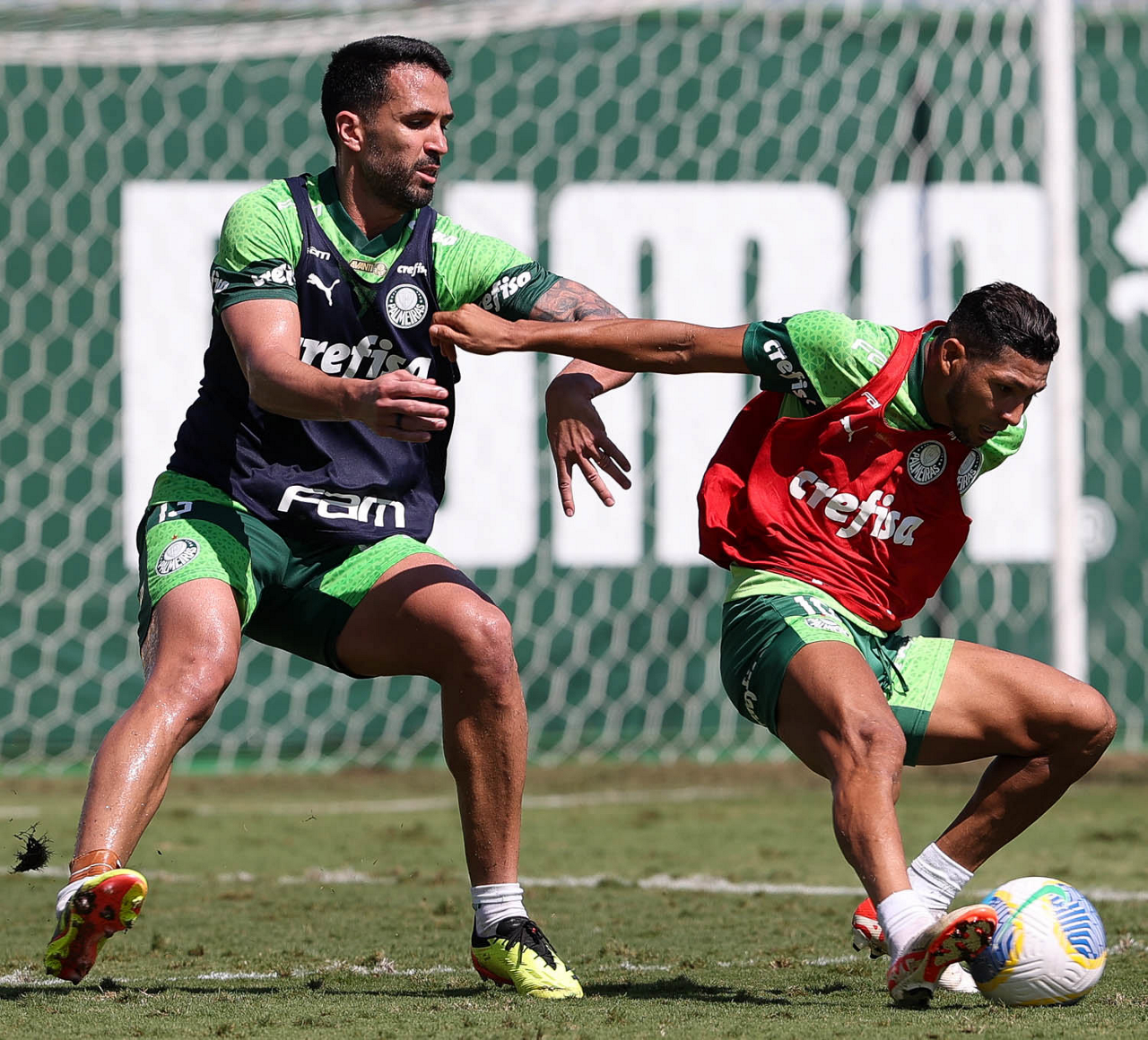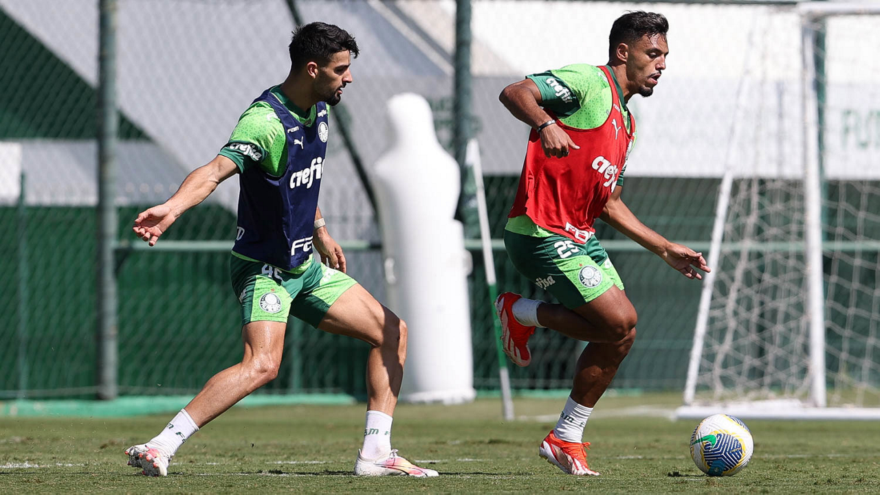Os jogadores Fabinho e Richard Ríos (D), da SE Palmeiras, durante treinamento, na Academia de Futebol. (Foto: Cesar Greco/Palmeiras/by Canon)