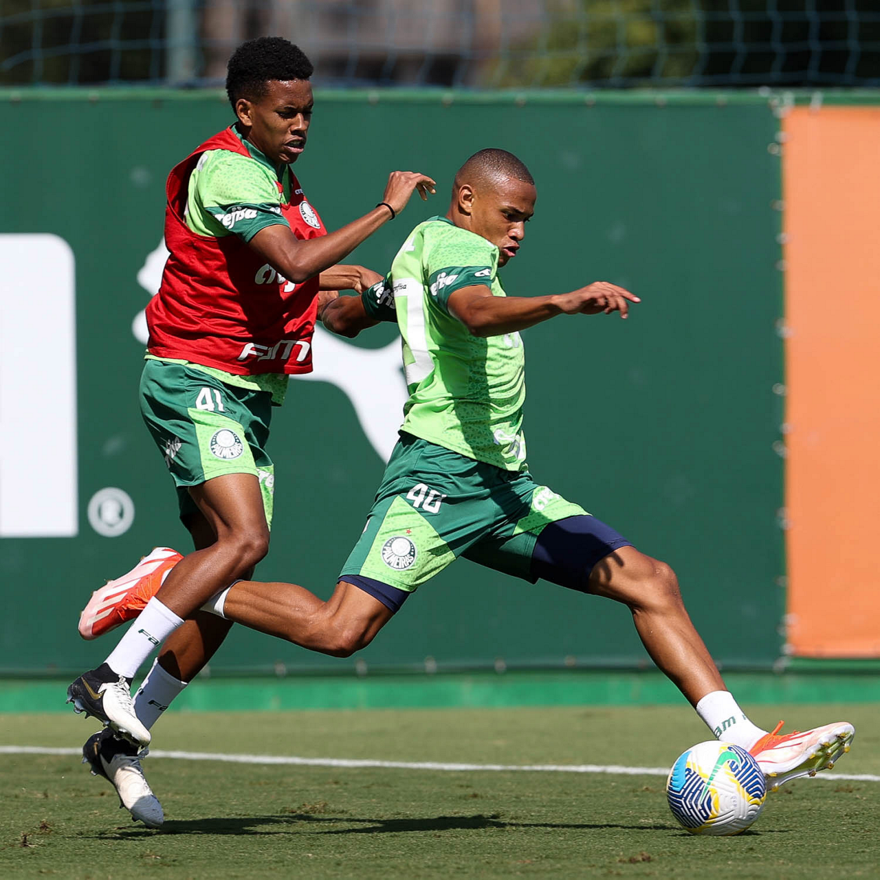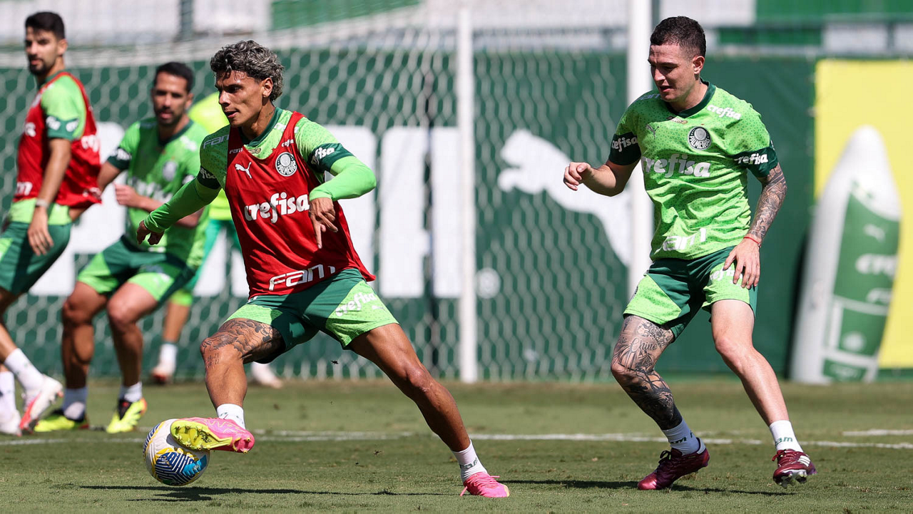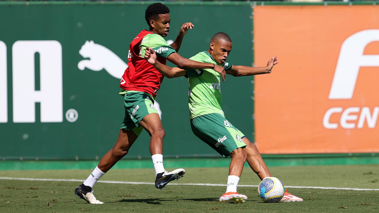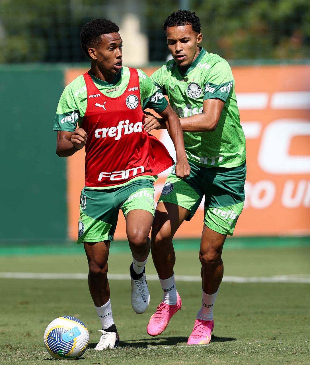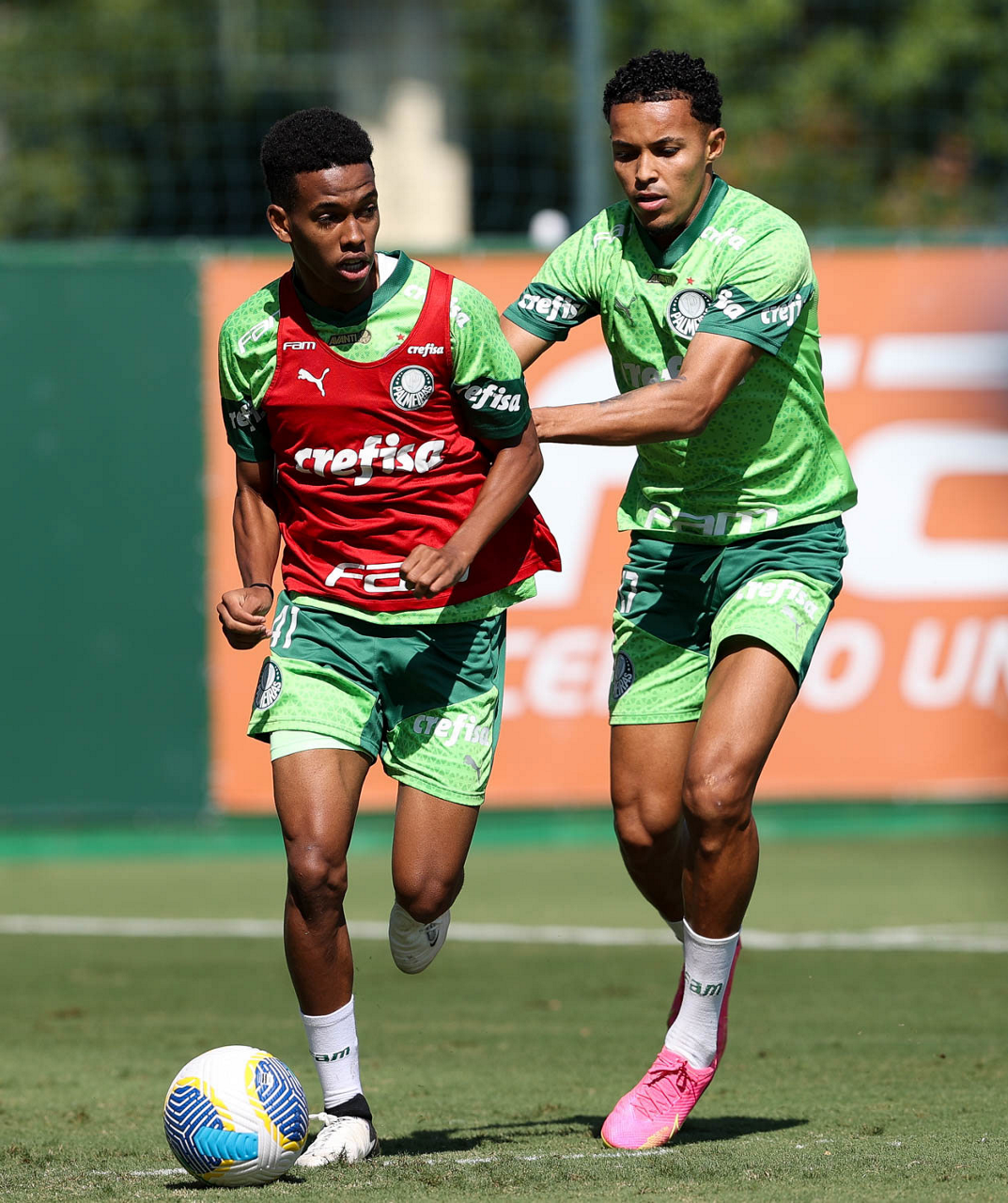 Os jogadores Endrick e Joaquín Piquerez (D), da SE Palmeiras, durante treinamento, na Academia de Futebol. (Foto: Cesar Greco/Palmeiras/by Canon)