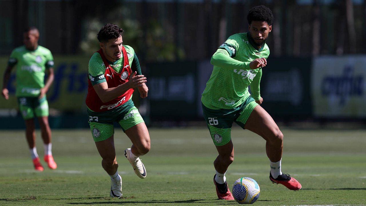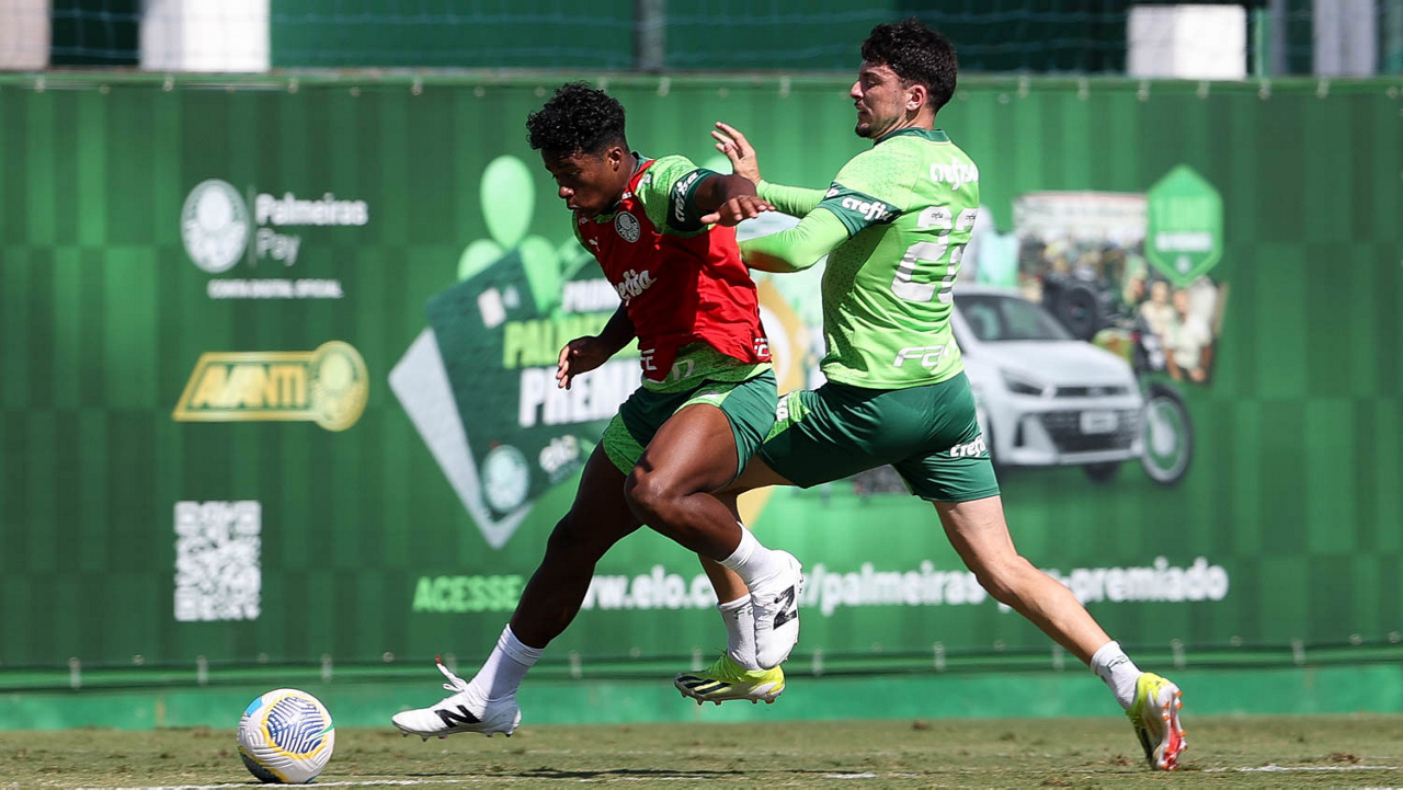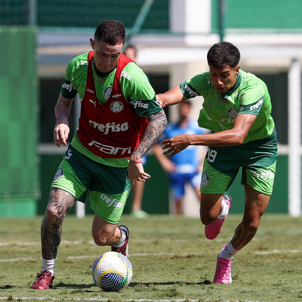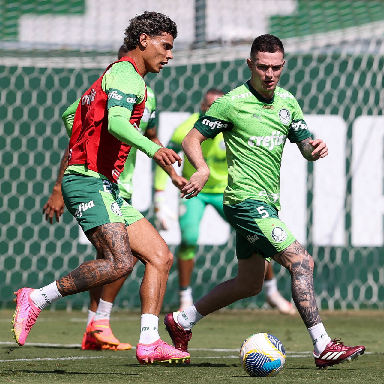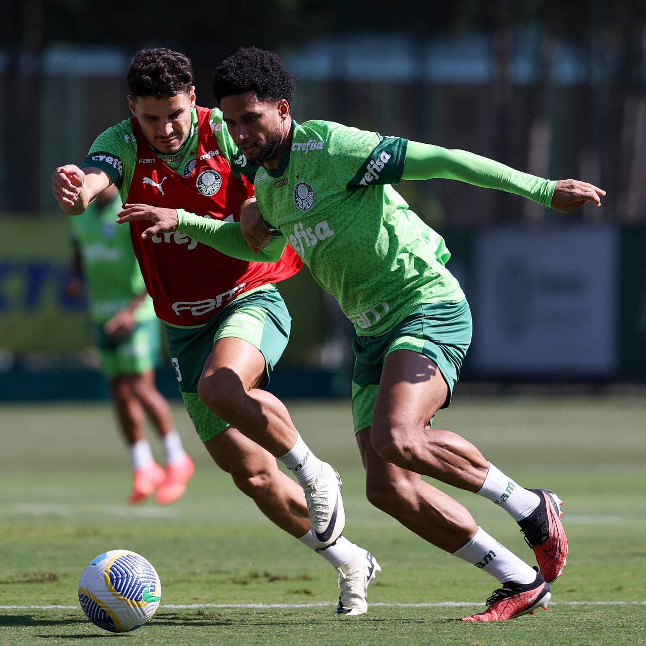 Os jogadores Endrick e Joaquín Piquerez (D), da SE Palmeiras, durante treinamento, na Academia de Futebol. (Foto: Cesar Greco/Palmeiras/by Canon)