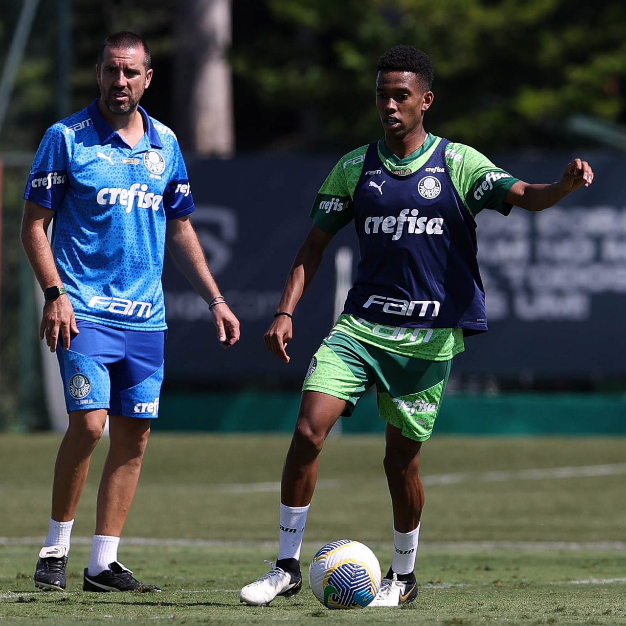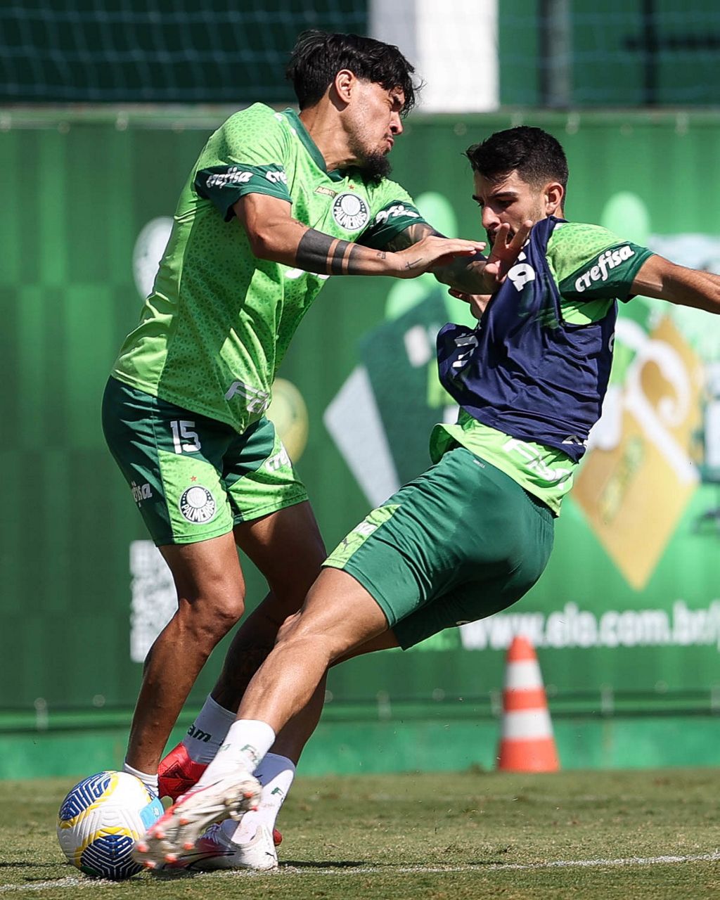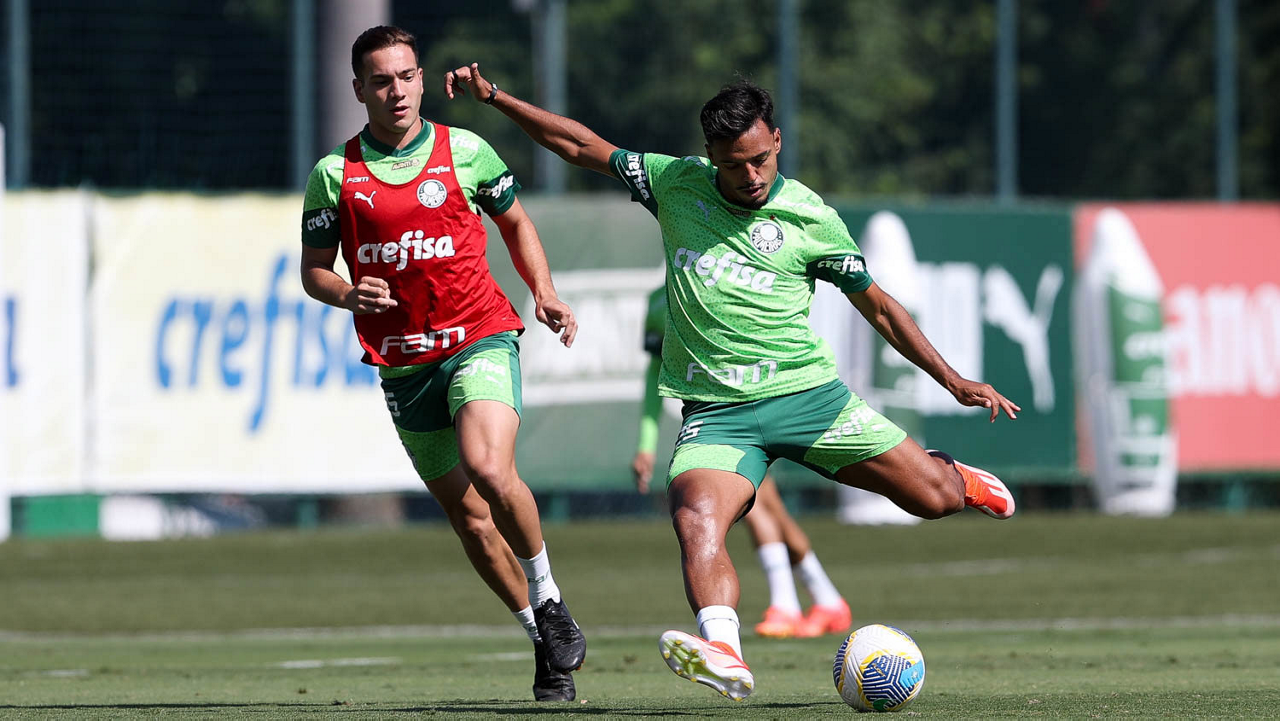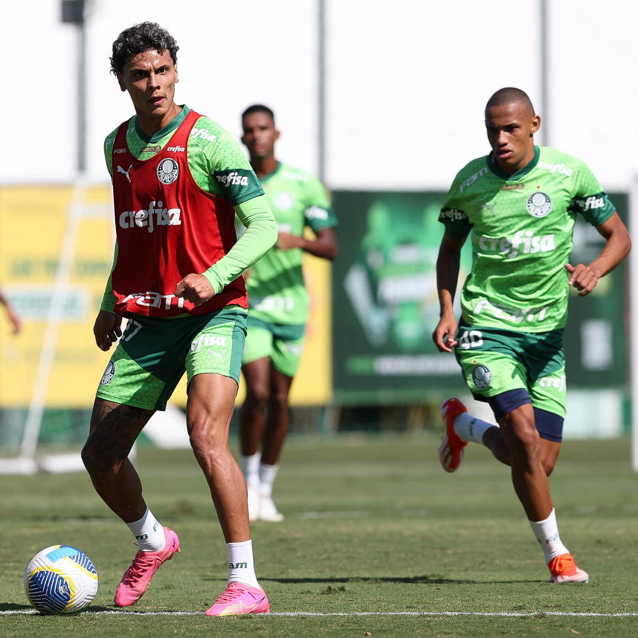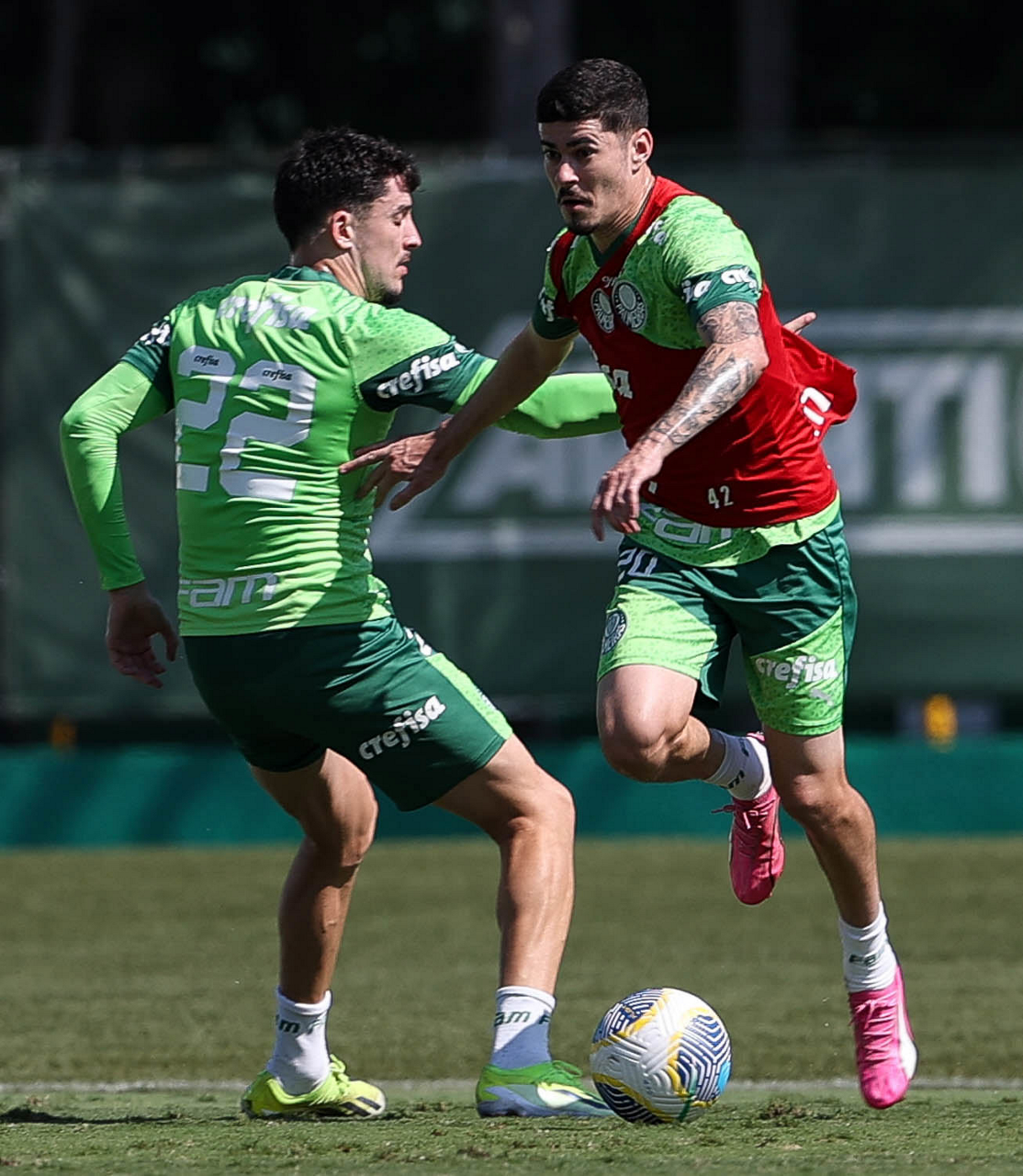 Os jogadores Endrick e Joaquín Piquerez (D), da SE Palmeiras, durante treinamento, na Academia de Futebol. (Foto: Cesar Greco/Palmeiras/by Canon)