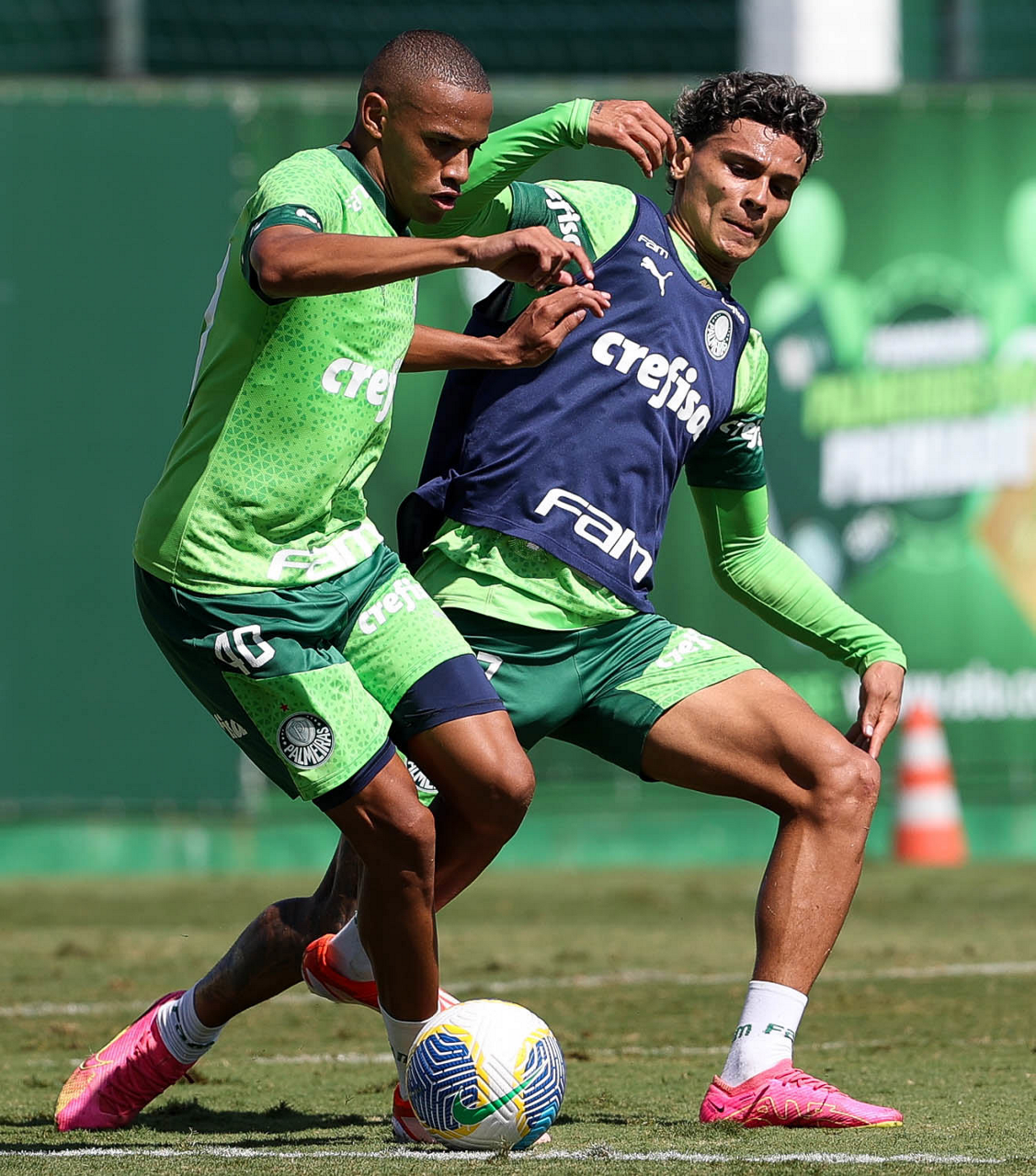 Os jogadores Richard Ríos e Anibal Moreno (D), da SE Palmeiras, durante treinamento, na Academia de Futebol. (Foto: Cesar Greco/Palmeiras/by Canon)