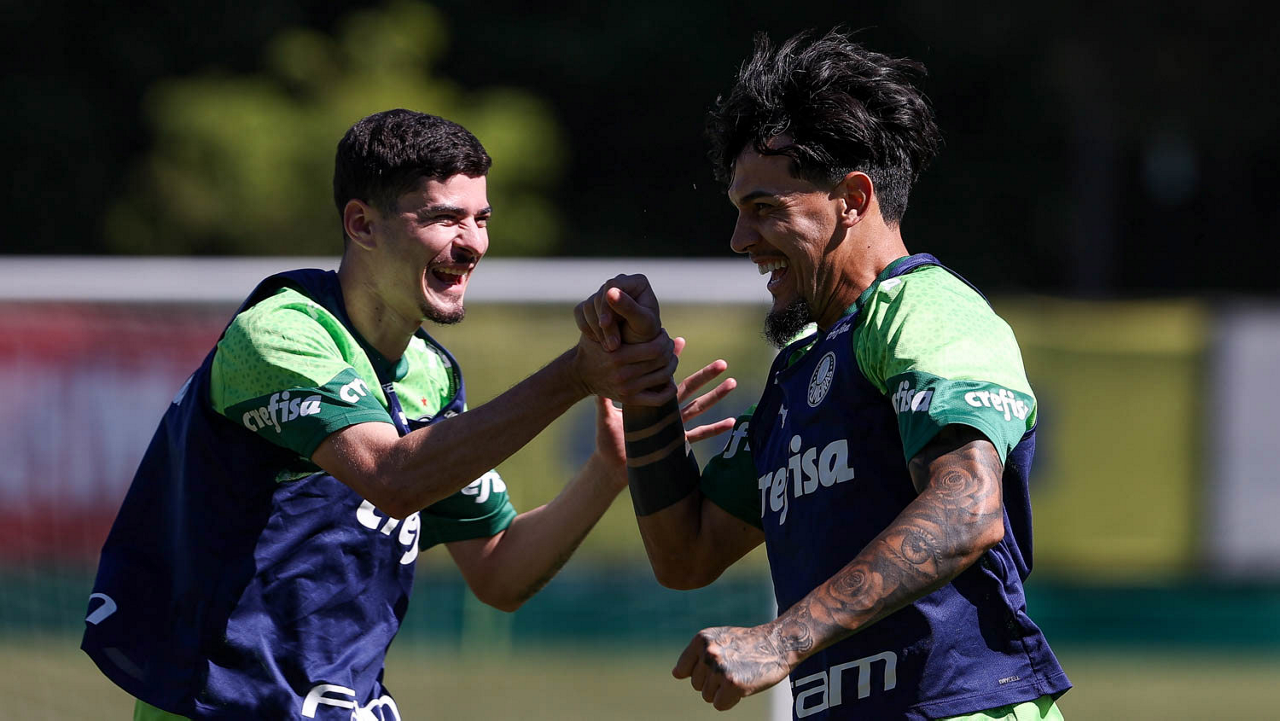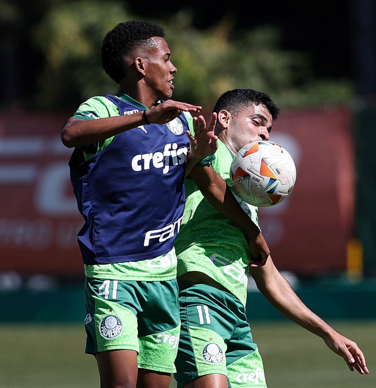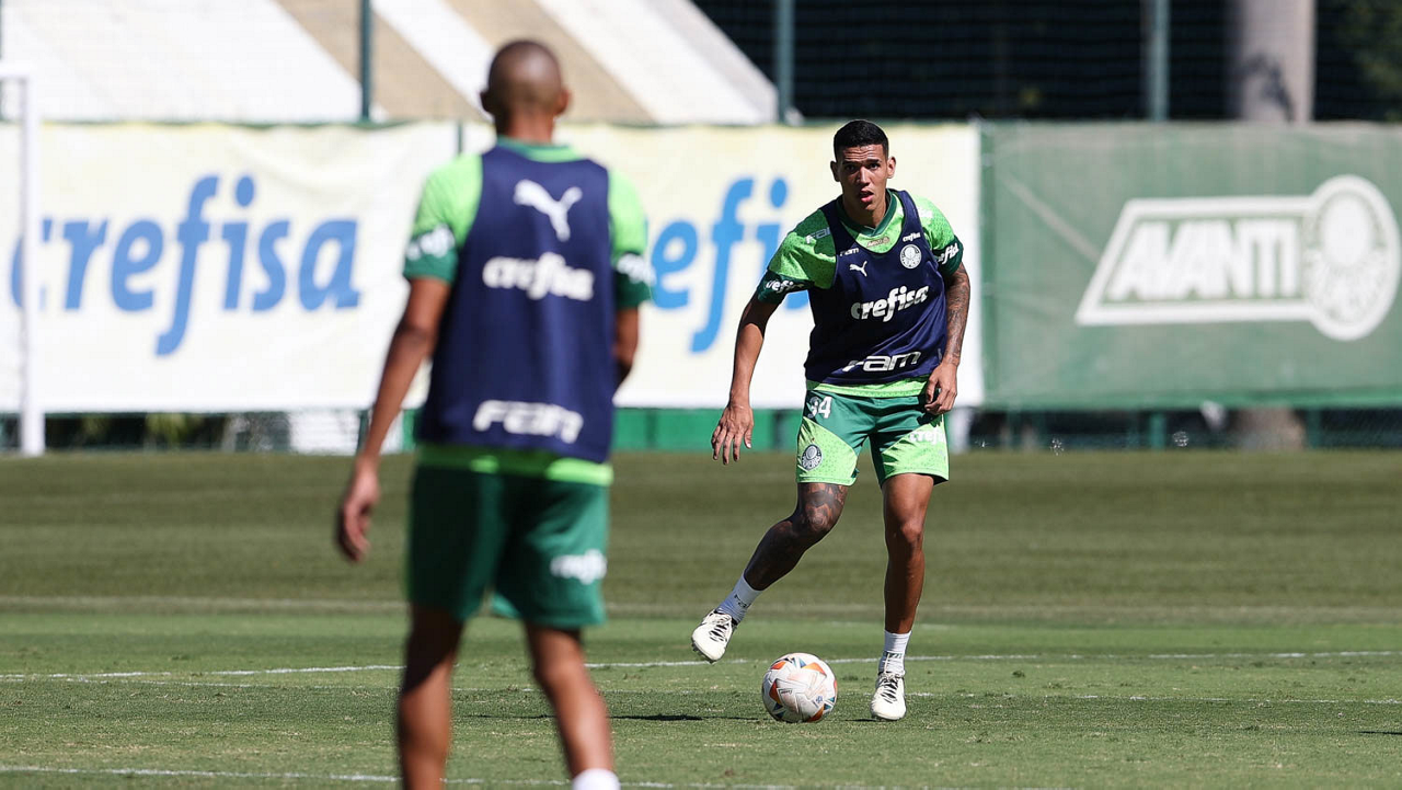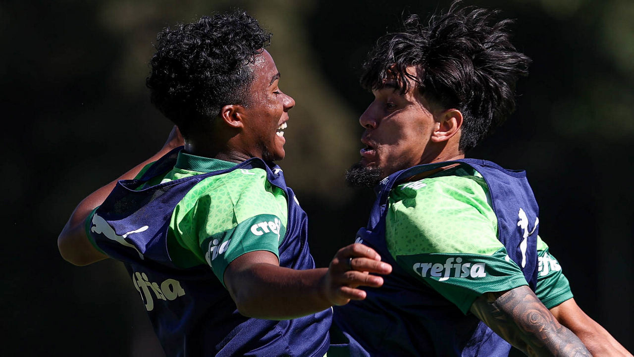 Os jogadores Endrick e Gustavo Gómez (D), da SE Palmeiras, durante treinamento, na Academia de Futebol. (Foto: Cesar Greco/Palmeiras/by Canon)