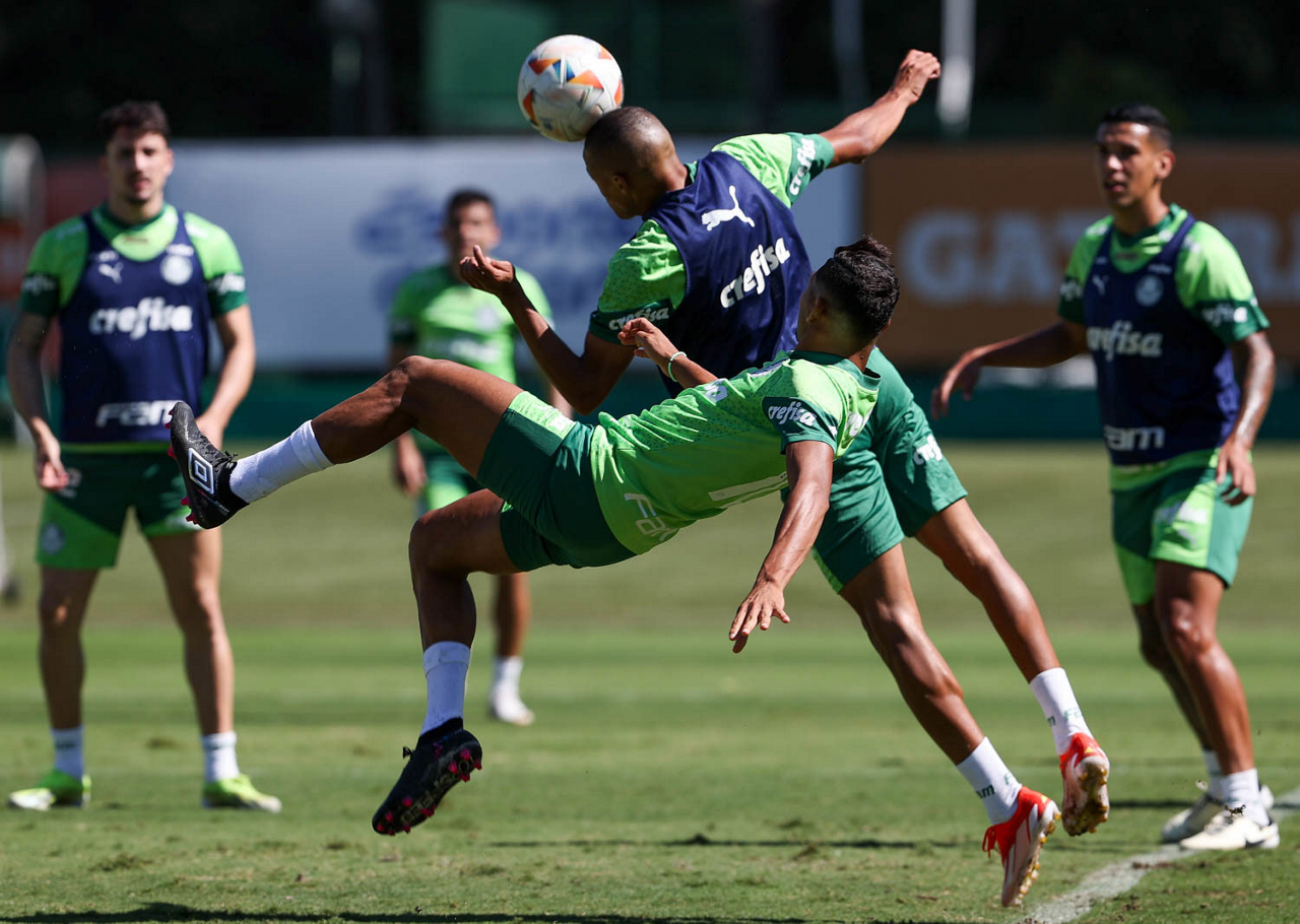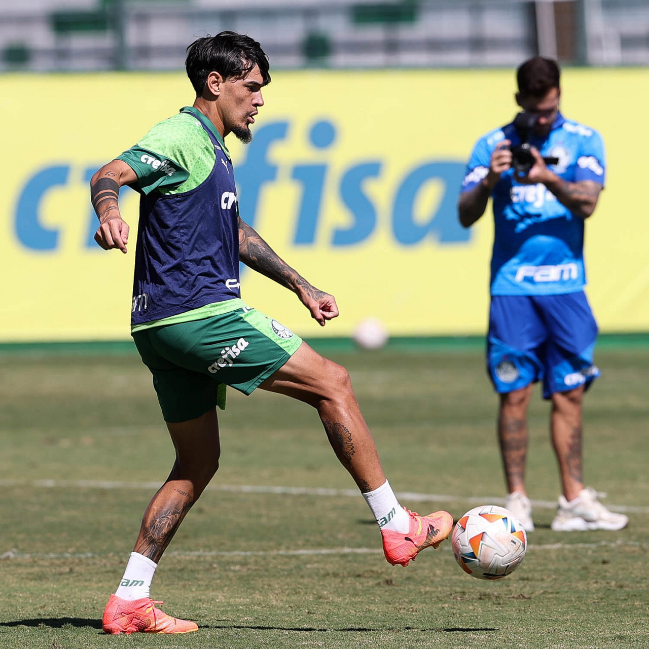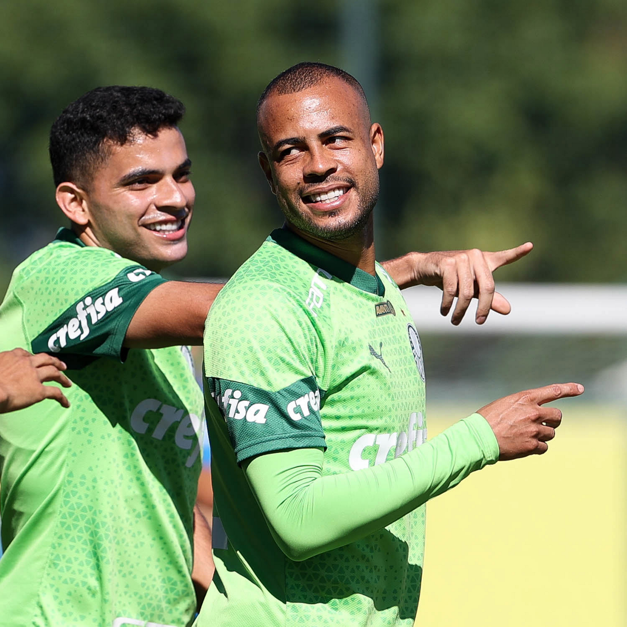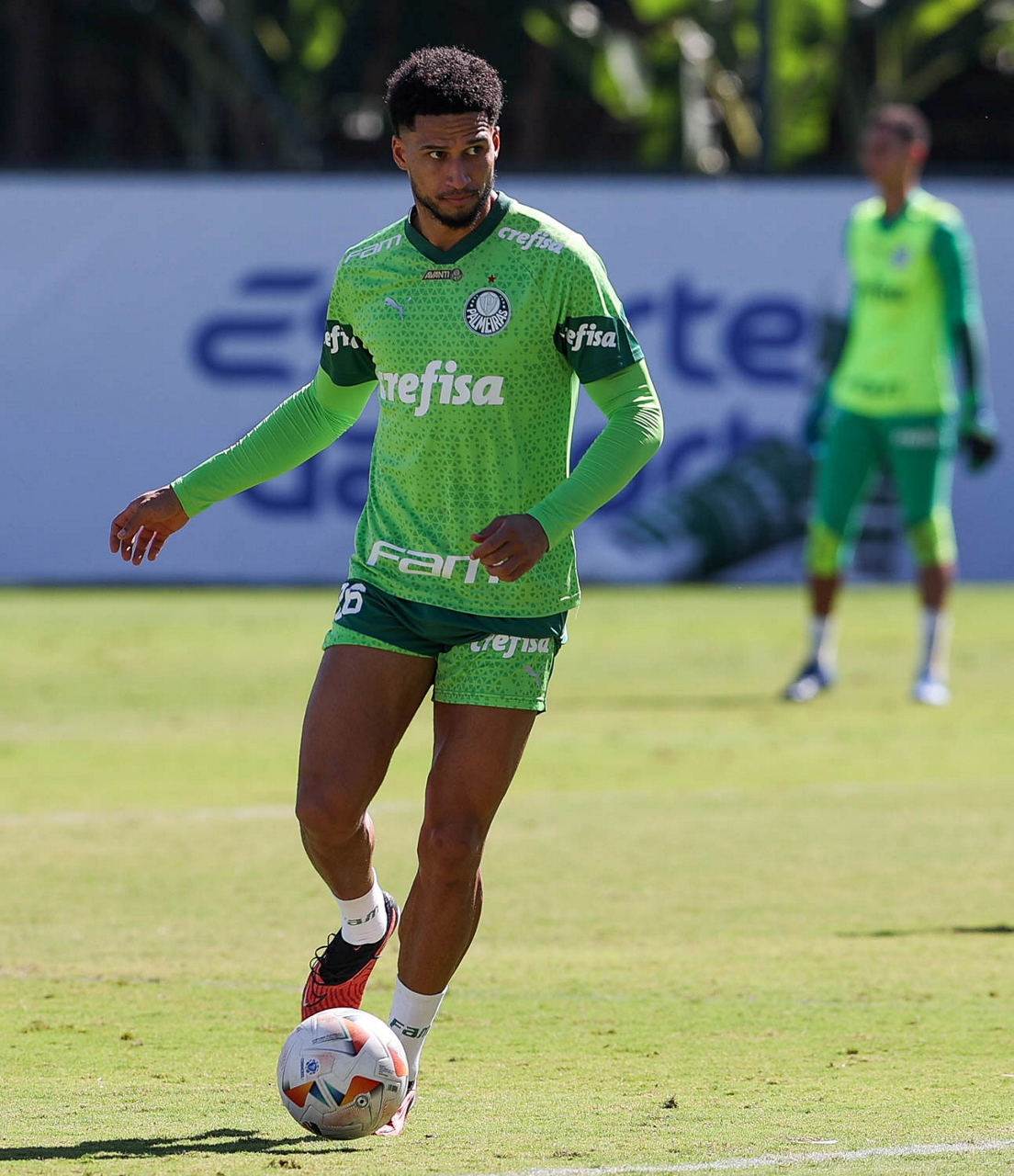 Os jogadores Endrick e Gustavo Gómez (D), da SE Palmeiras, durante treinamento, na Academia de Futebol. (Foto: Cesar Greco/Palmeiras/by Canon)