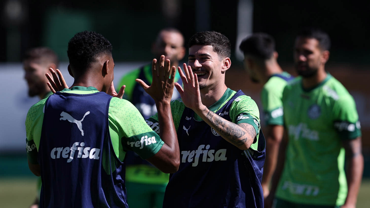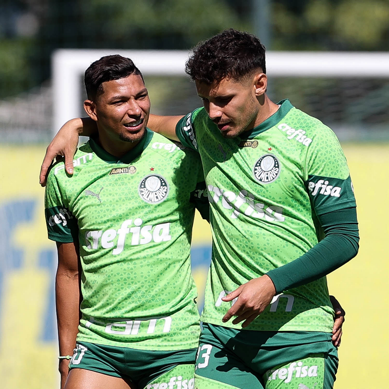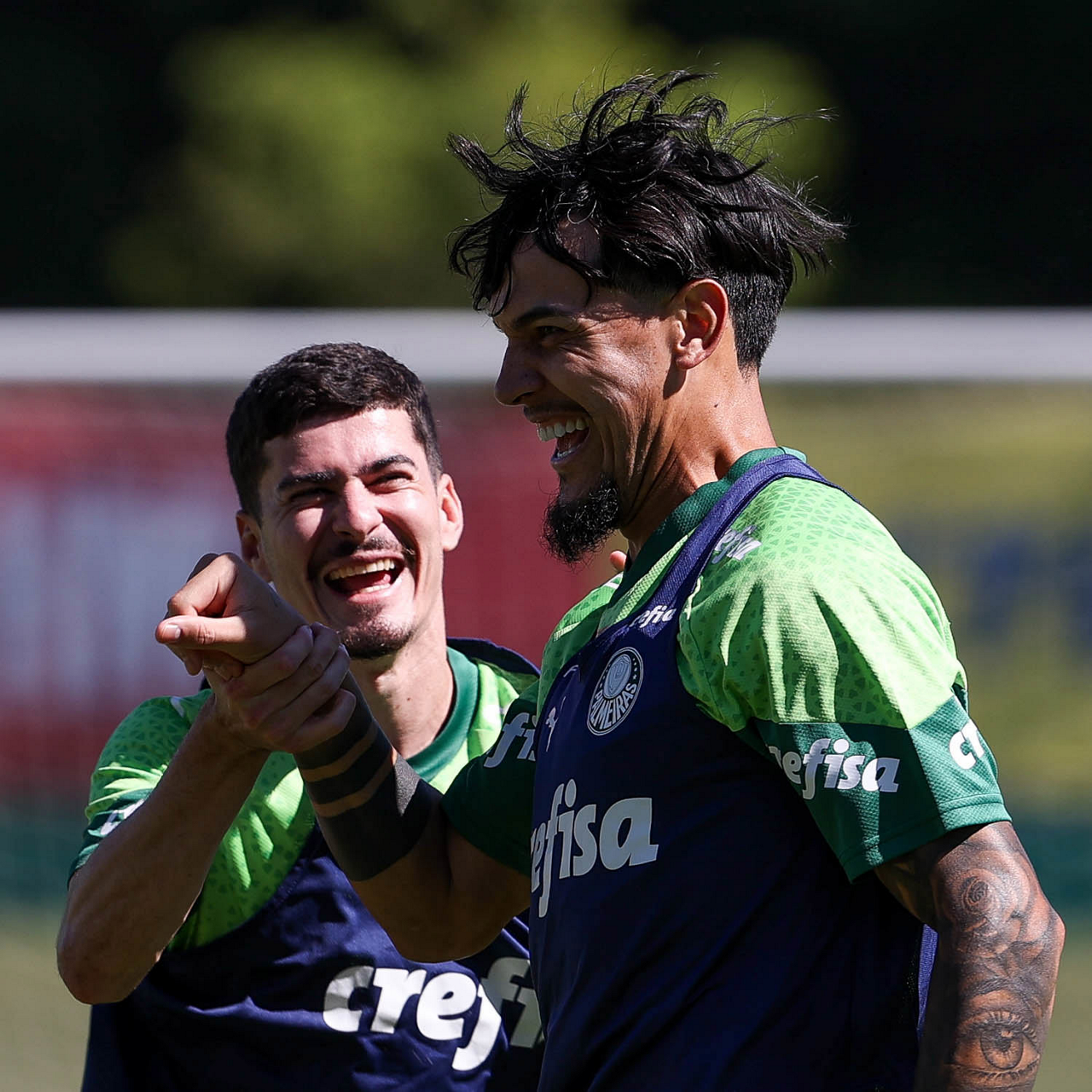 Os jogadores Bruno Rodrigues e Richard Ríos (D), da SE Palmeiras, durante treinamento, na Academia de Futebol. (Foto: Cesar Greco/Palmeiras/by Canon)