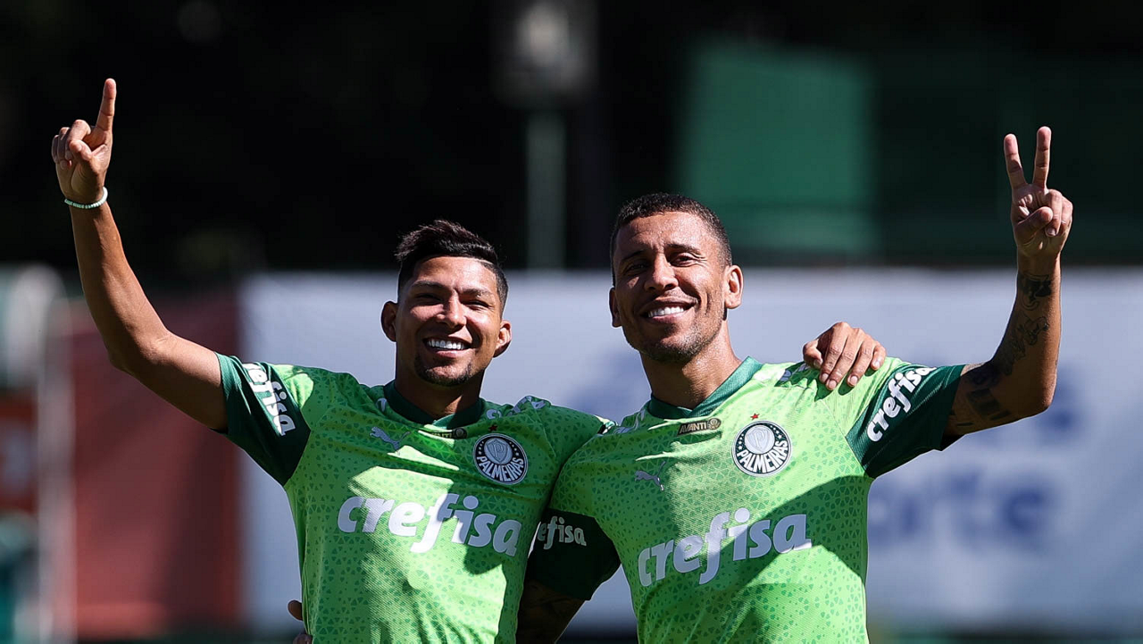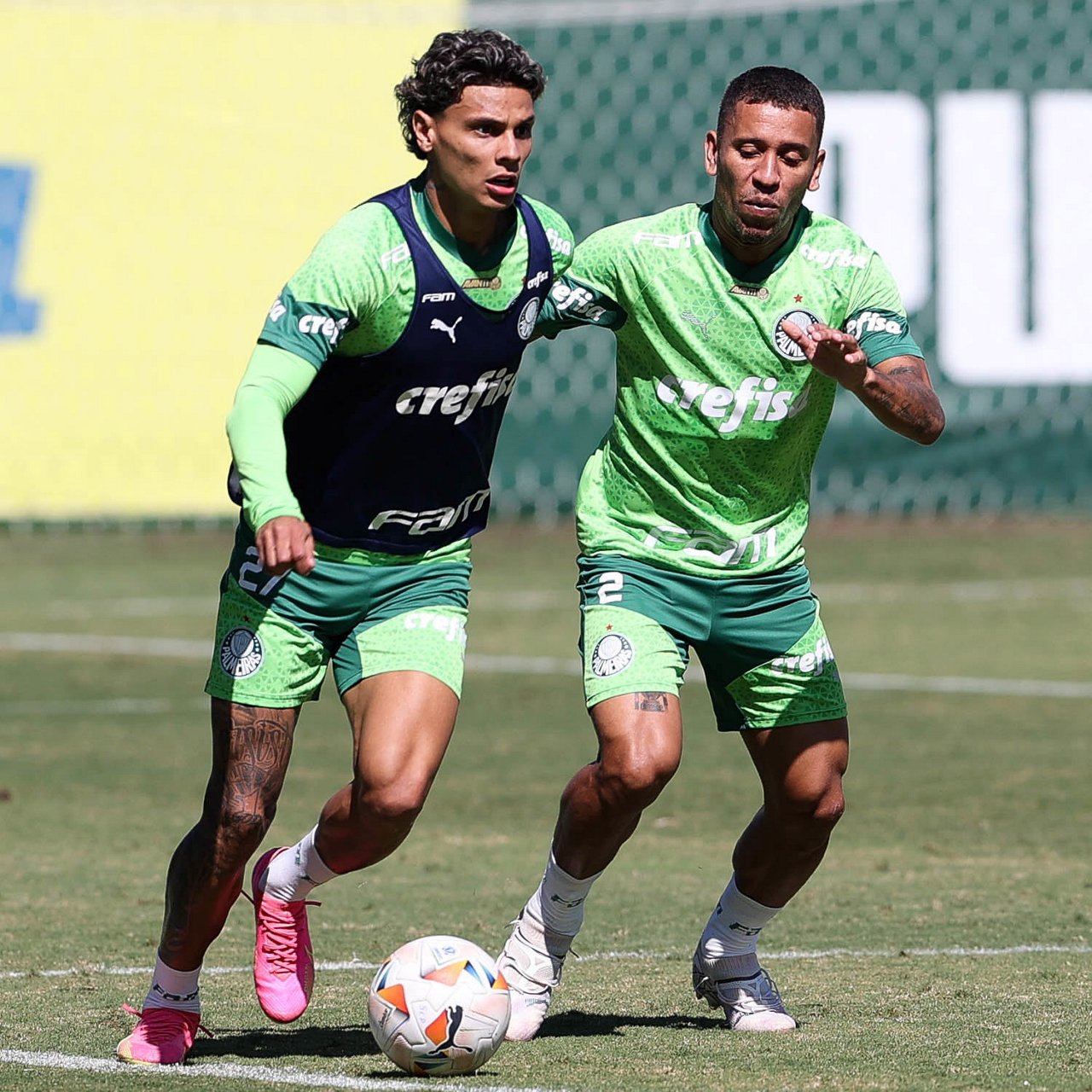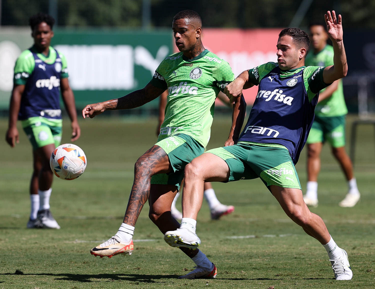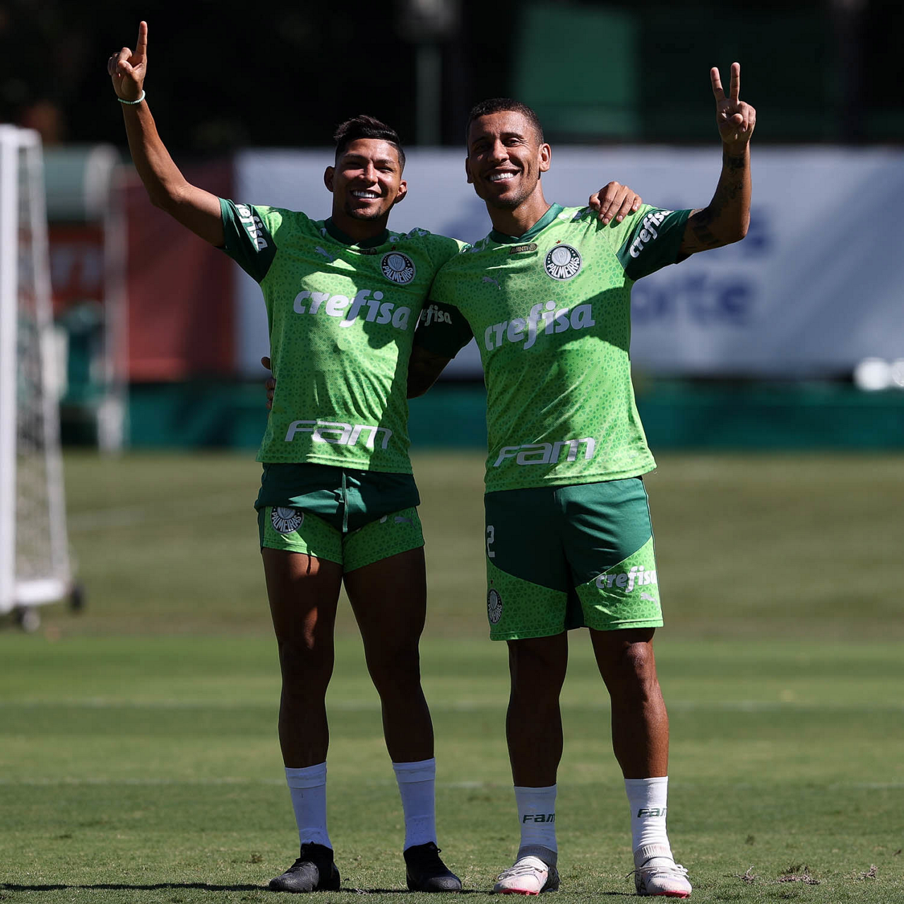 Os jogadores Richard Ríos e Marcos Rocha (D), da SE Palmeiras, durante treinamento, na Academia de Futebol. (Foto: Cesar Greco/Palmeiras/by Canon)