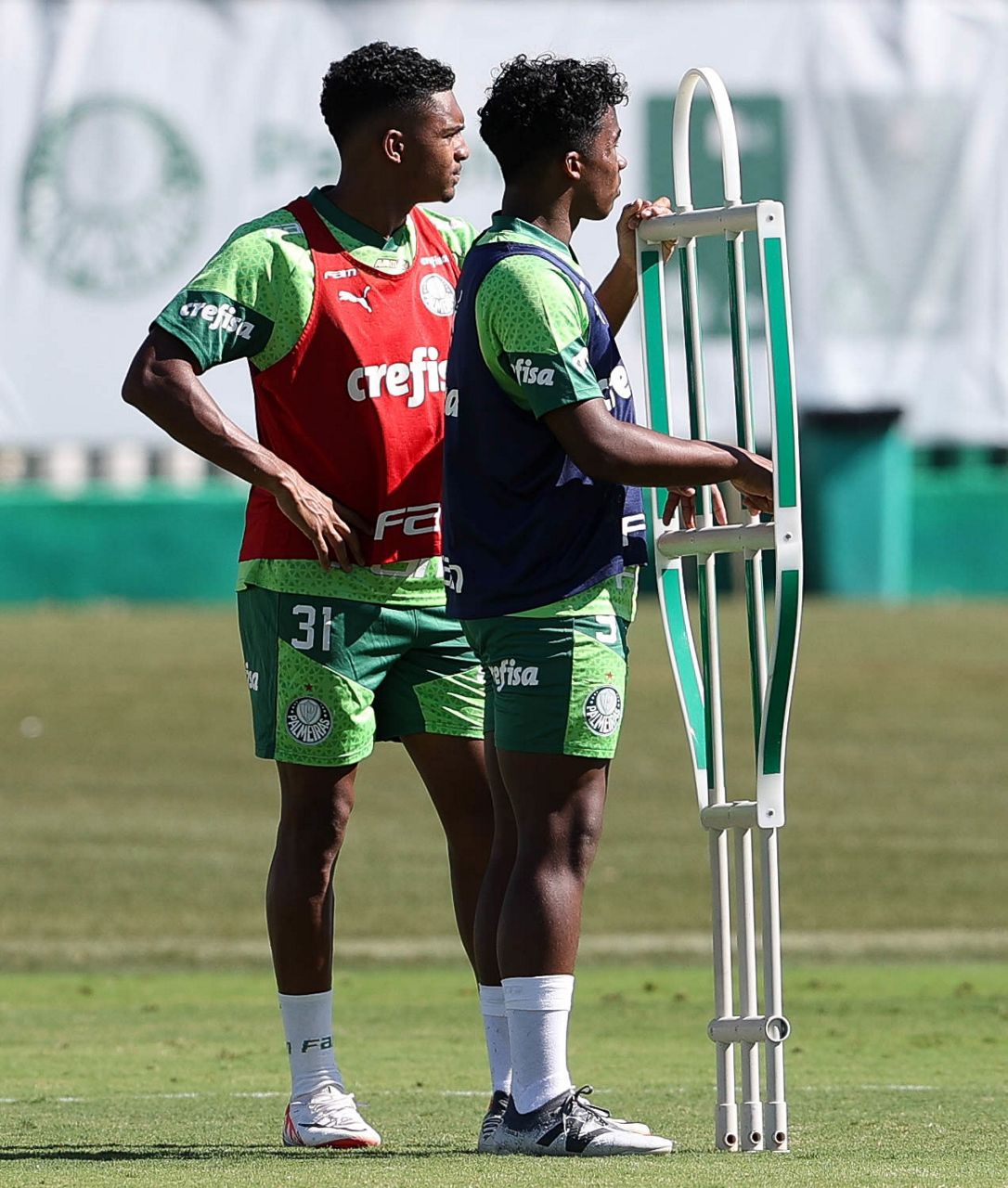 Os jogadores Luis Guilherme e Endrick (D), da SE Palmeiras, durante treinamento, na Academia de Futebol. (Foto: Cesar Greco/Palmeiras/by Canon)