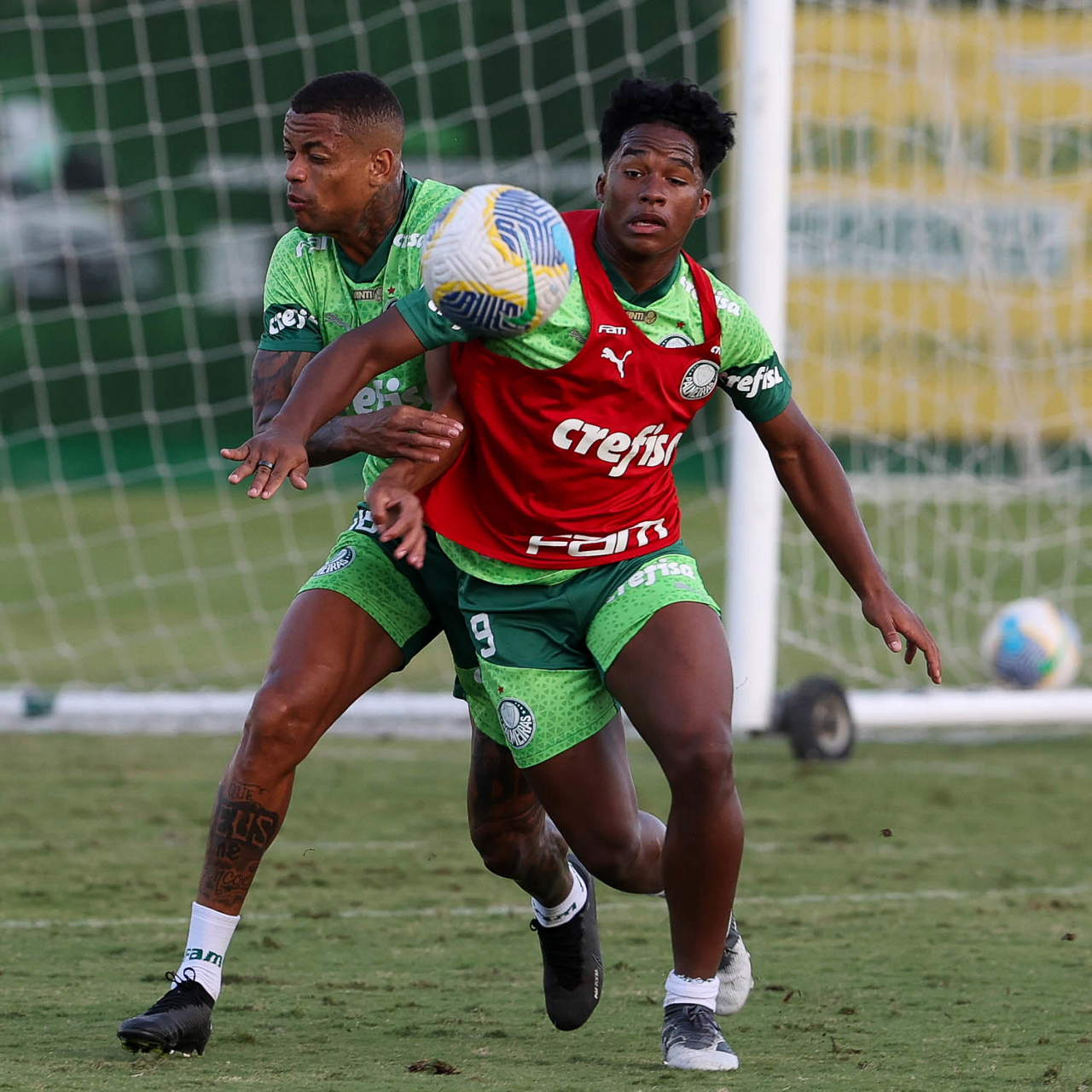 Os jogadores Endrick e Lázaro (D), da SE Palmeiras, durante treinamento, na Academia de Futebol. (Foto: Cesar Greco/Palmeiras/by Canon)