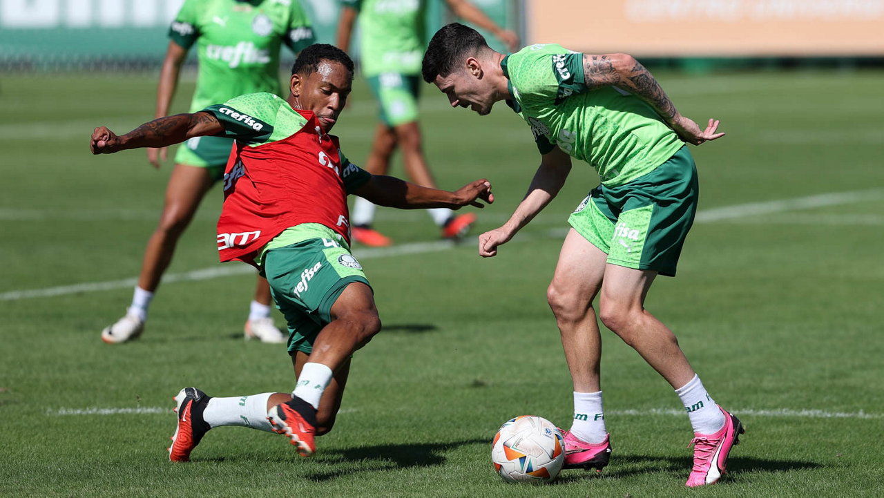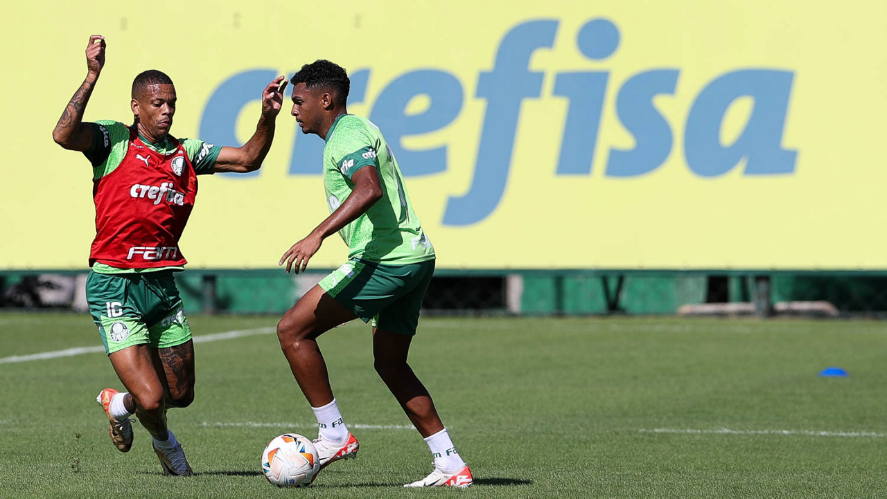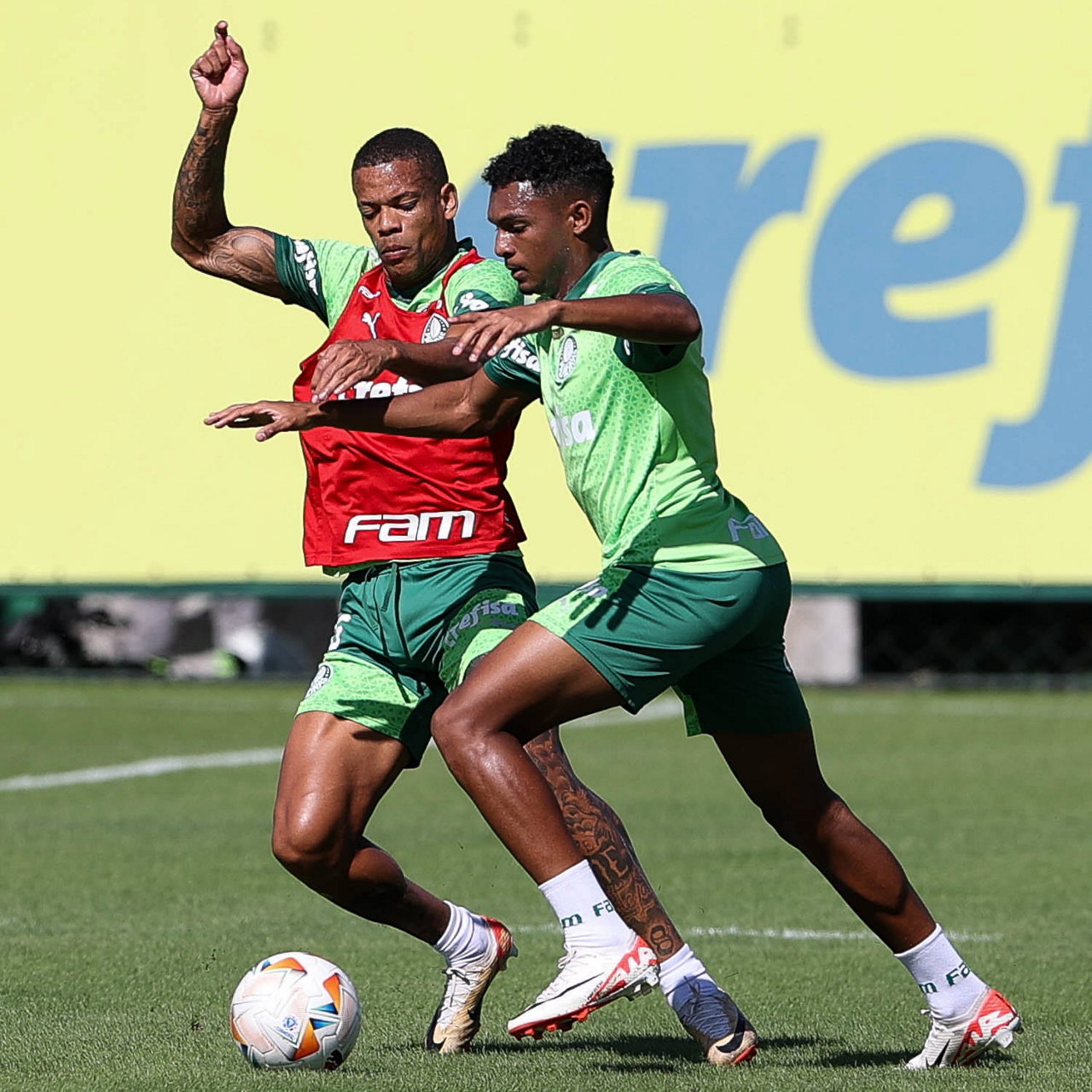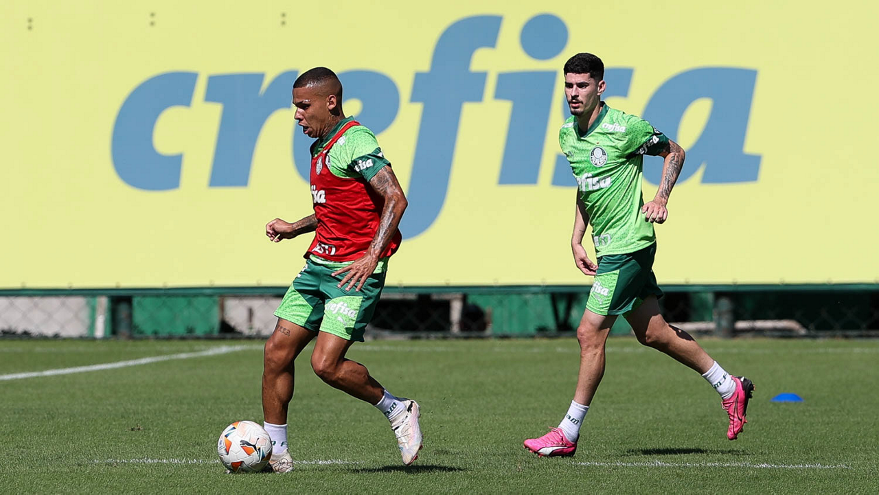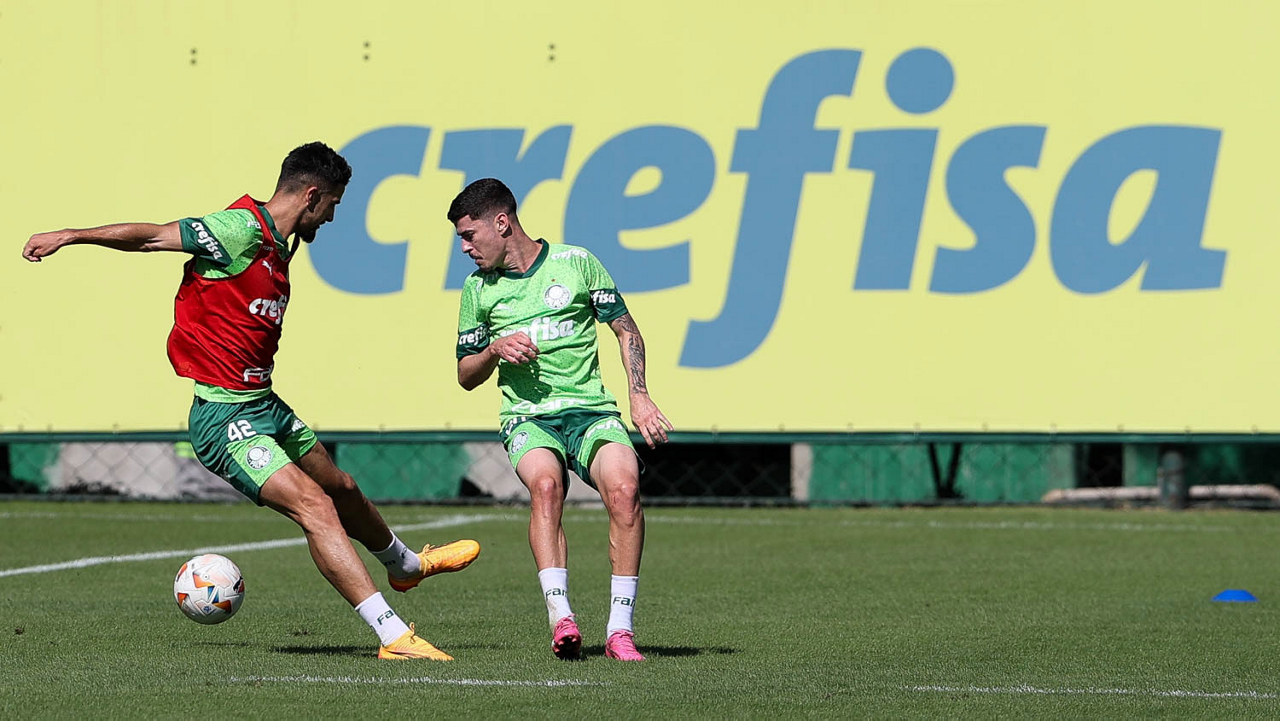 Os jogadores Fabinho e Richard Ríos (D), da SE Palmeiras, durante treinamento, na Academia de Futebol. (Foto: Cesar Greco/Palmeiras/by Canon)
