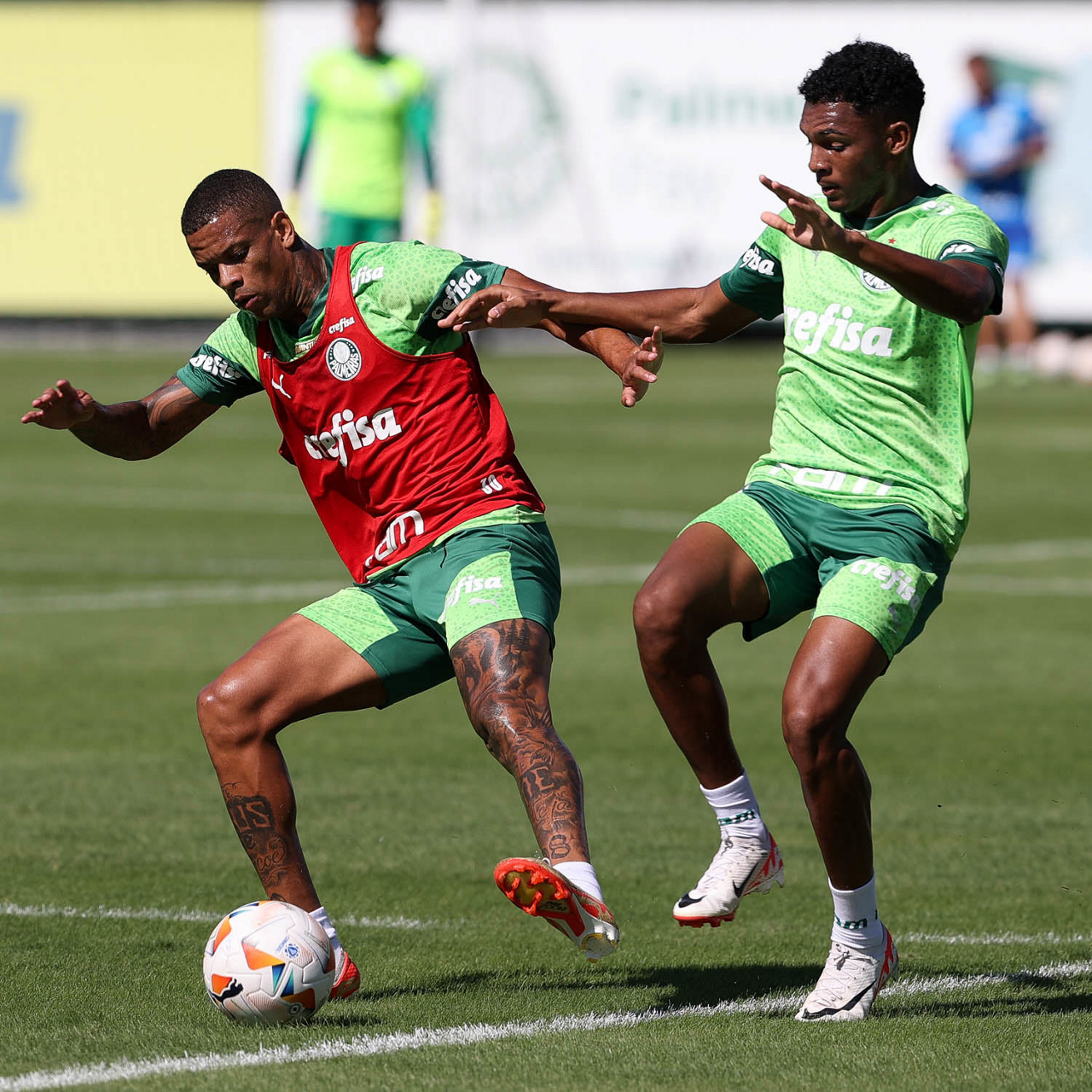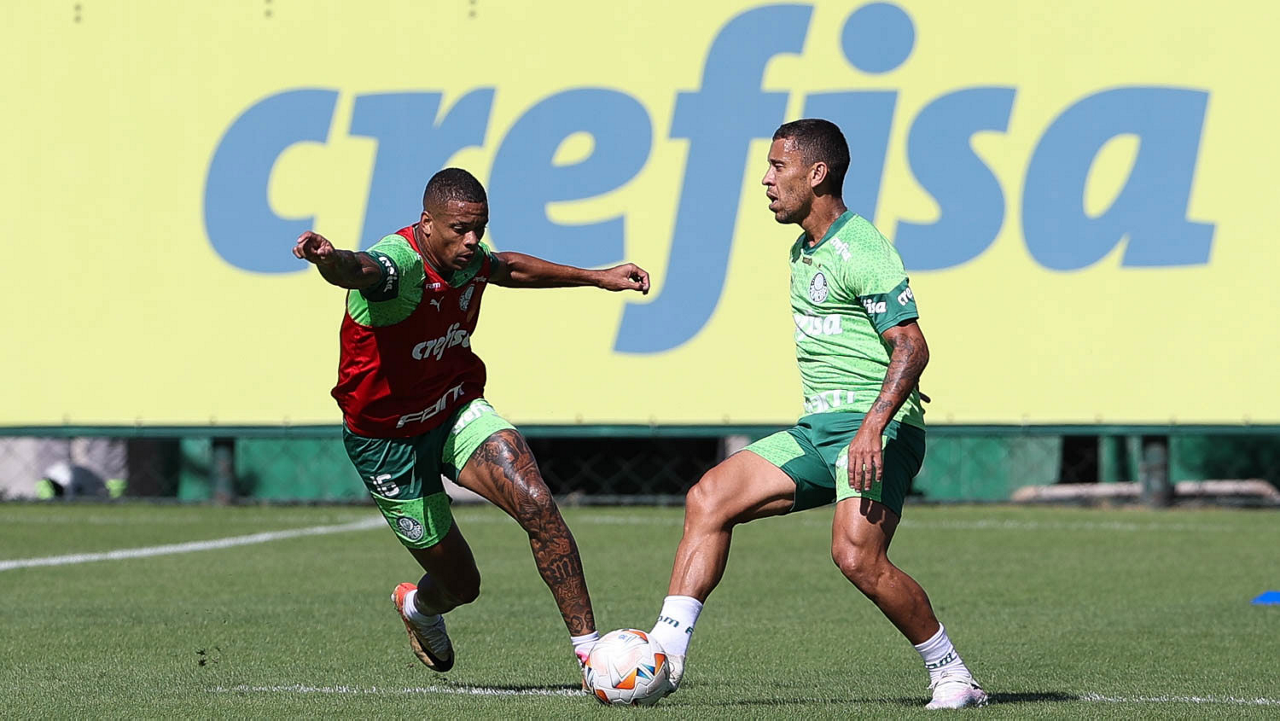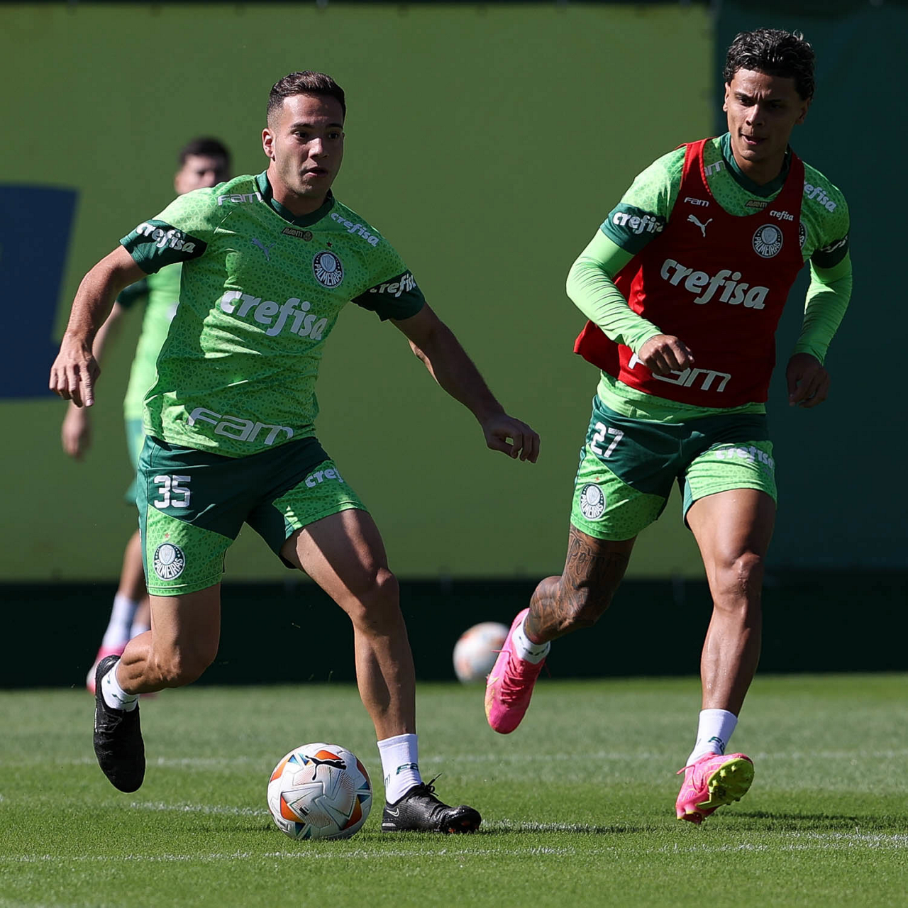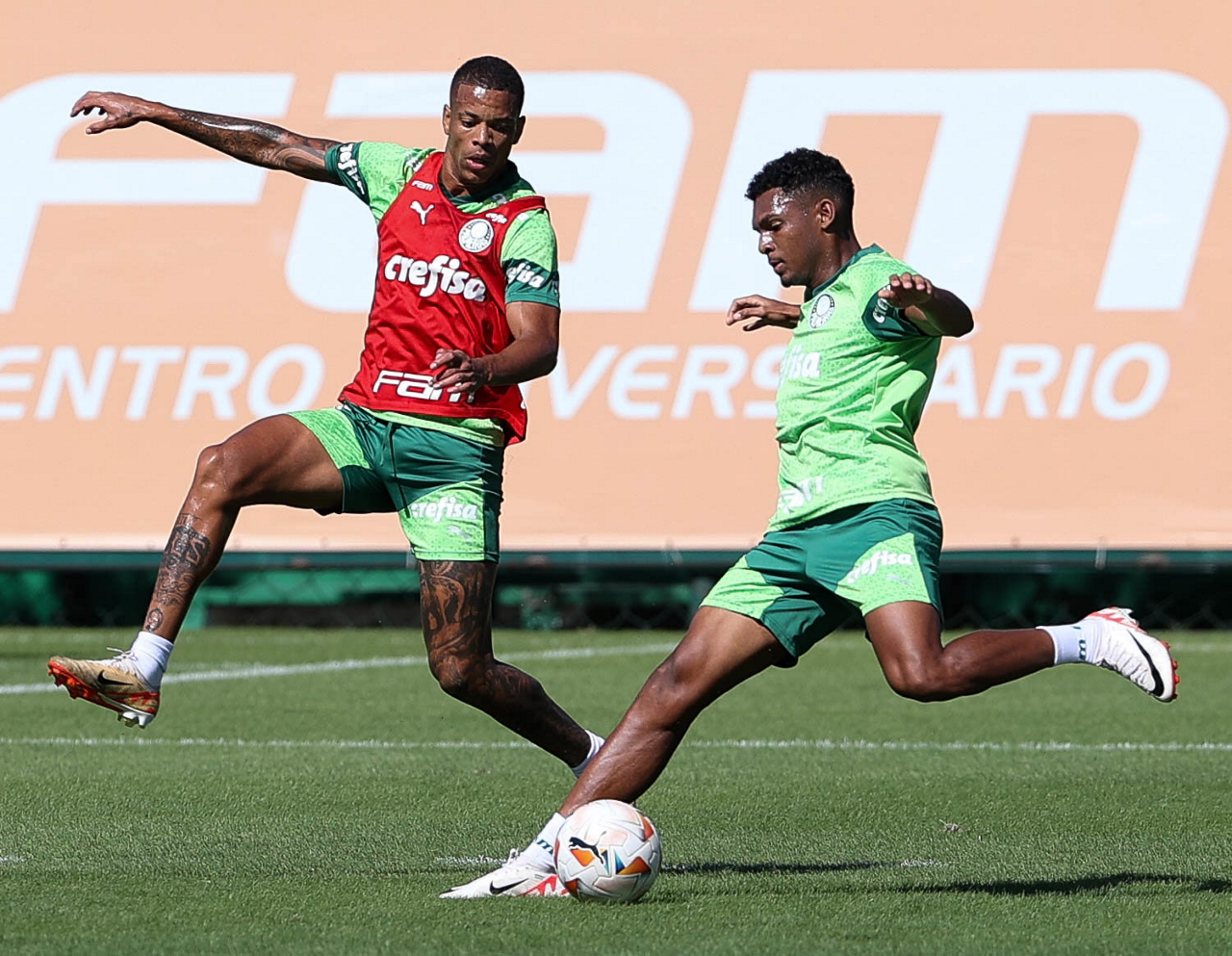 Os jogadores Fabinho e Richard Ríos (D), da SE Palmeiras, durante treinamento, na Academia de Futebol. (Foto: Cesar Greco/Palmeiras/by Canon)