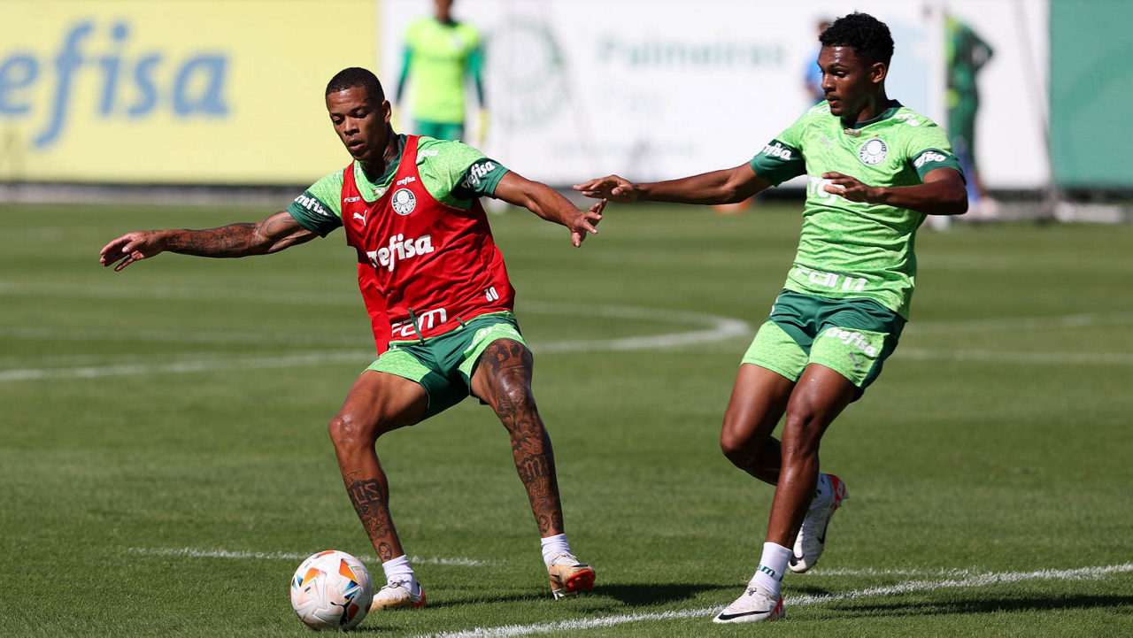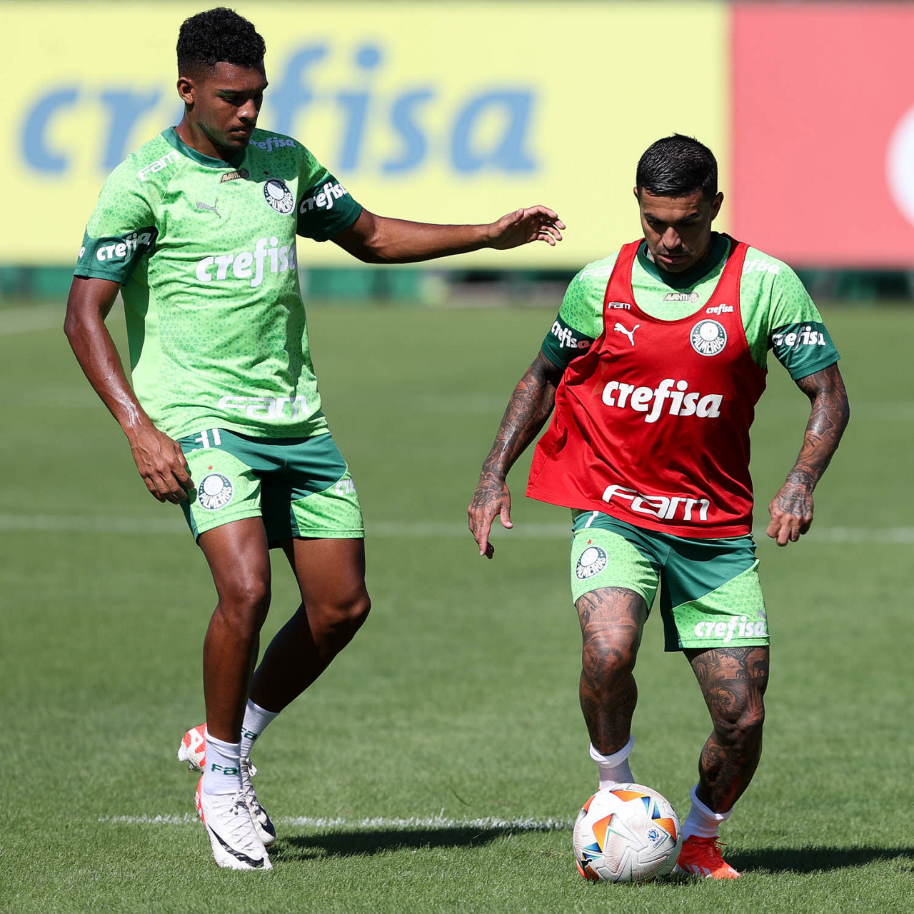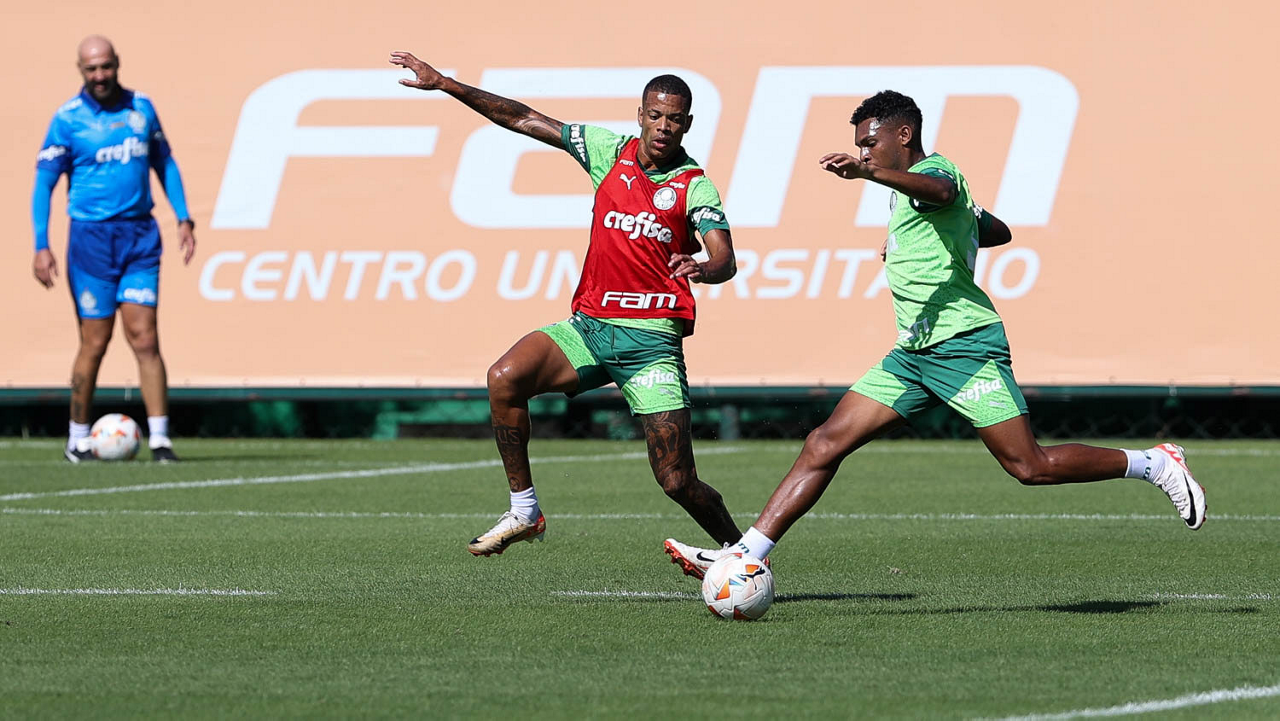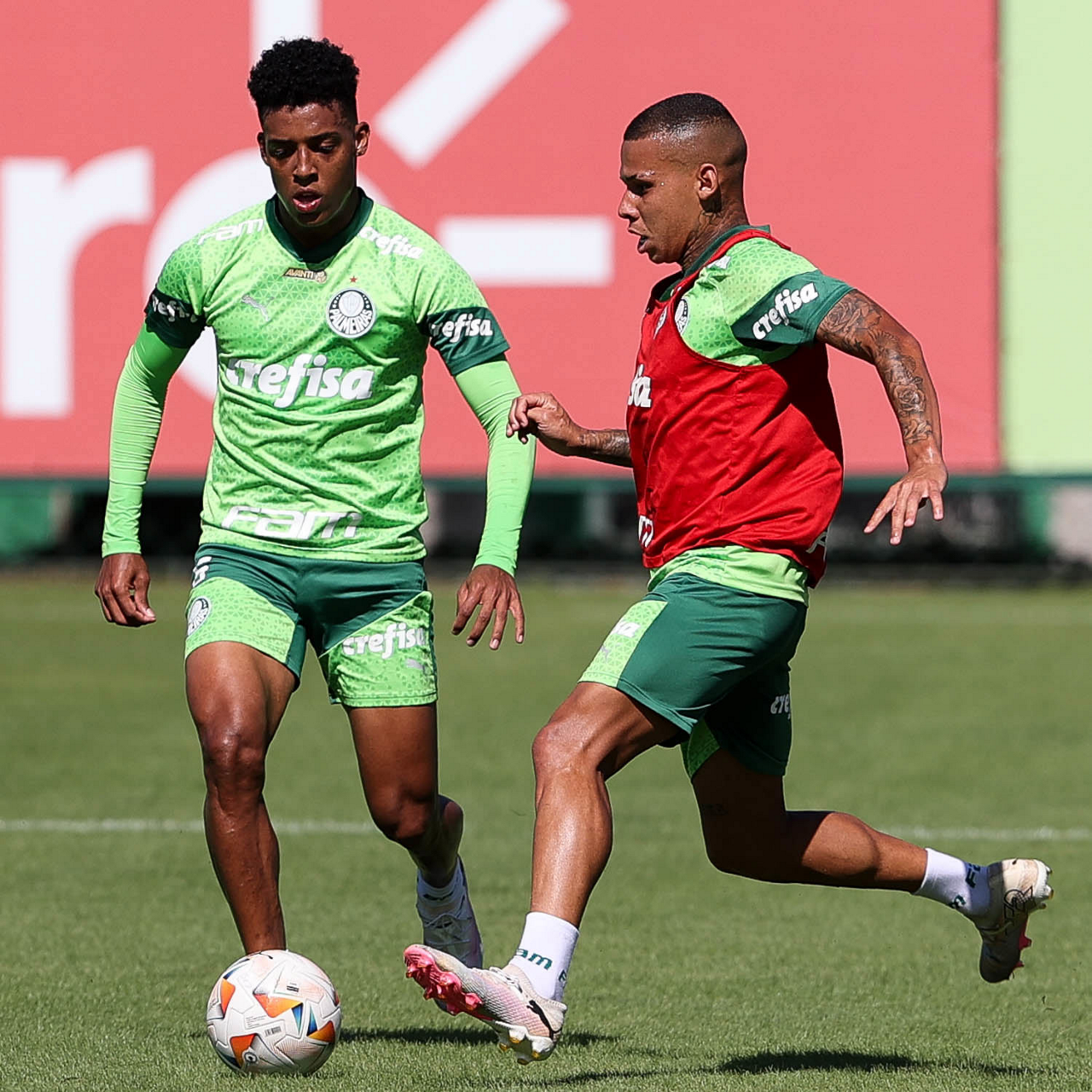 Os jogadores Fabinho e Richard Ríos (D), da SE Palmeiras, durante treinamento, na Academia de Futebol. (Foto: Cesar Greco/Palmeiras/by Canon)