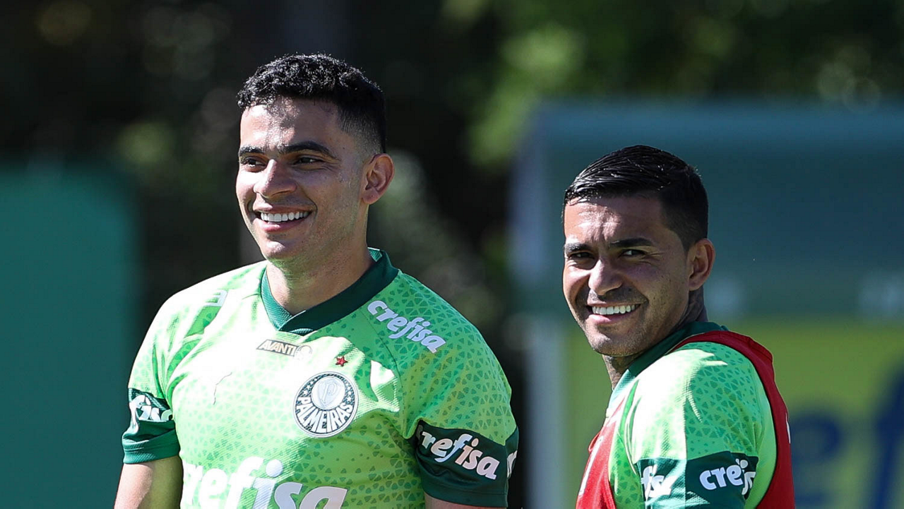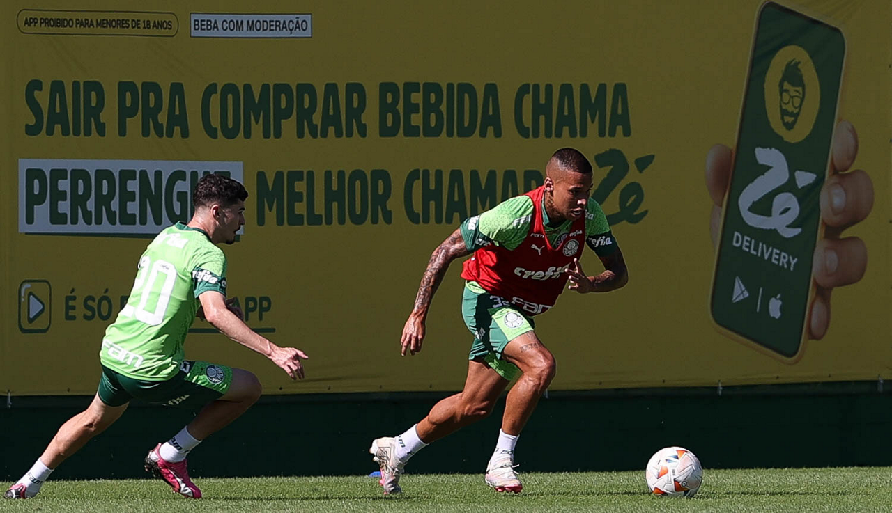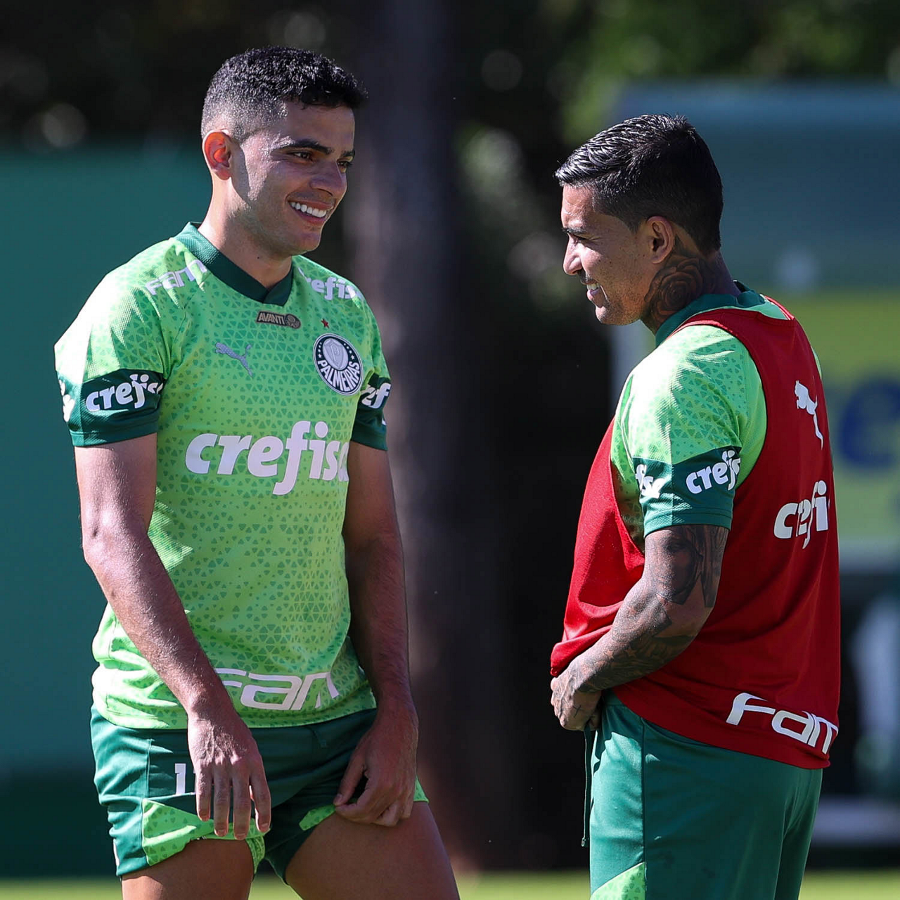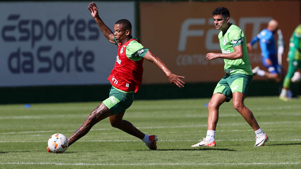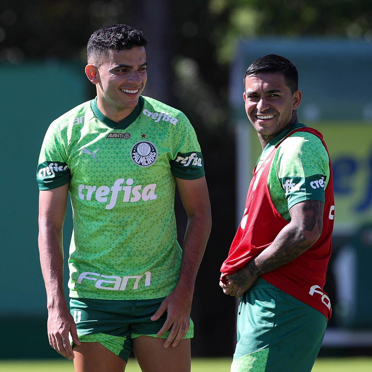 Os jogadores Fabinho e Richard Ríos (D), da SE Palmeiras, durante treinamento, na Academia de Futebol. (Foto: Cesar Greco/Palmeiras/by Canon)