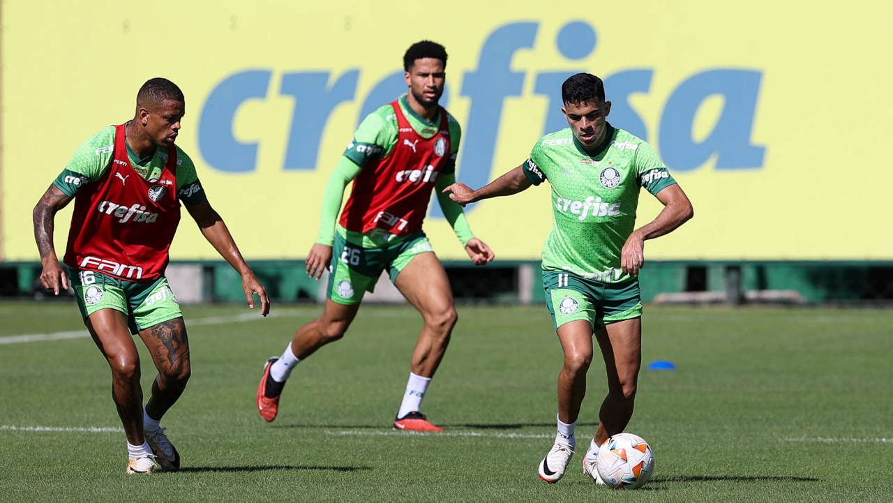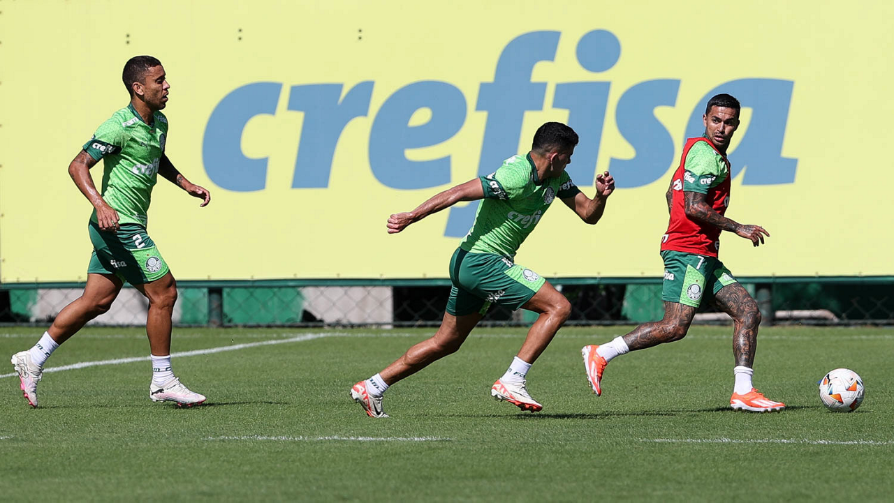 Os jogadores Marcos Rocha, Bruno Rodrigues e Dudu (E/D), da SE Palmeiras, durante treinamento, na Academia de Futebol. (Foto: Cesar Greco/Palmeiras/by Canon)
