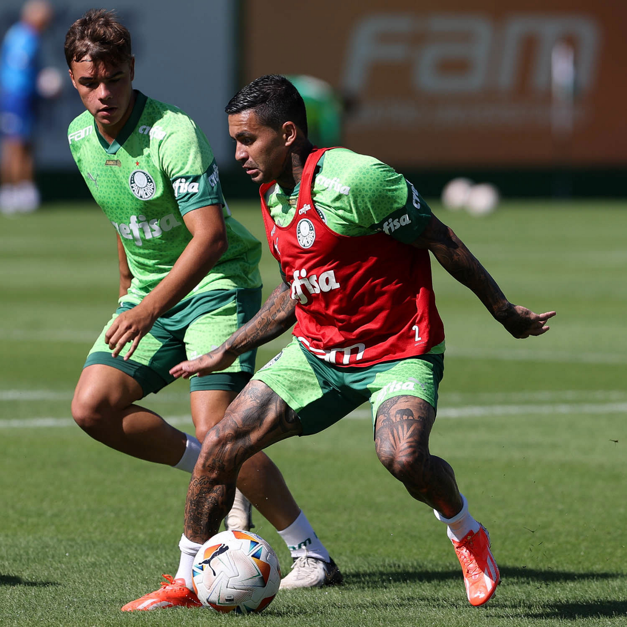 Os jogadores Luis Guilherme e Dudu (D), da SE Palmeiras, durante treinamento, na Academia de Futebol. (Foto: Cesar Greco/Palmeiras/by Canon)