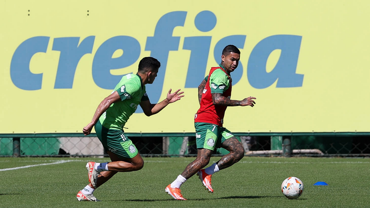 Os jogadores Bruno Rodrigues e Dudu (D), da SE Palmeiras, durante treinamento, na Academia de Futebol. (Foto: Cesar Greco/Palmeiras/by Canon)