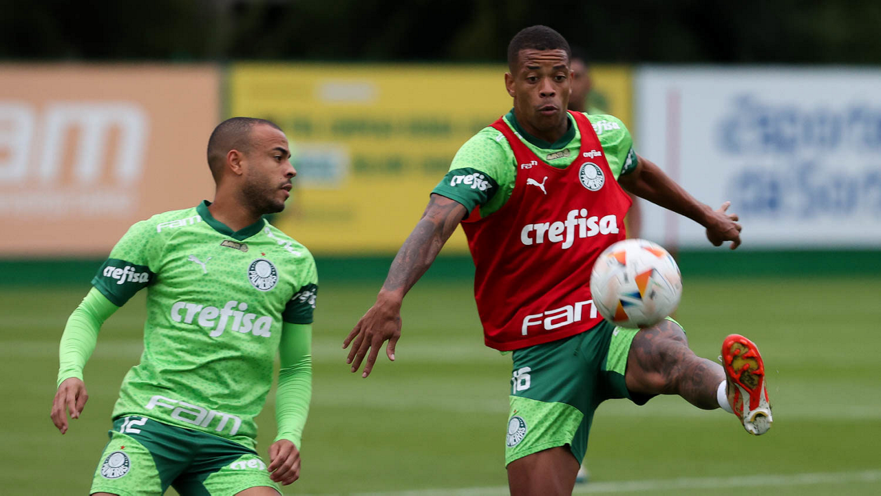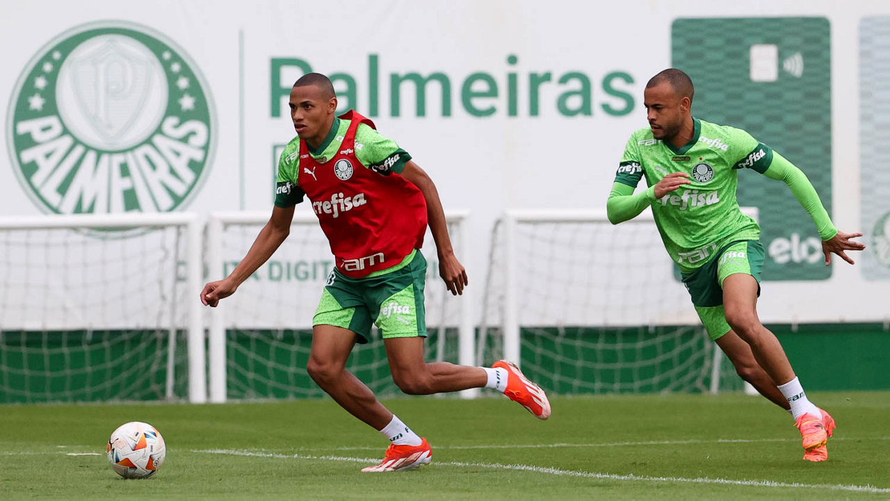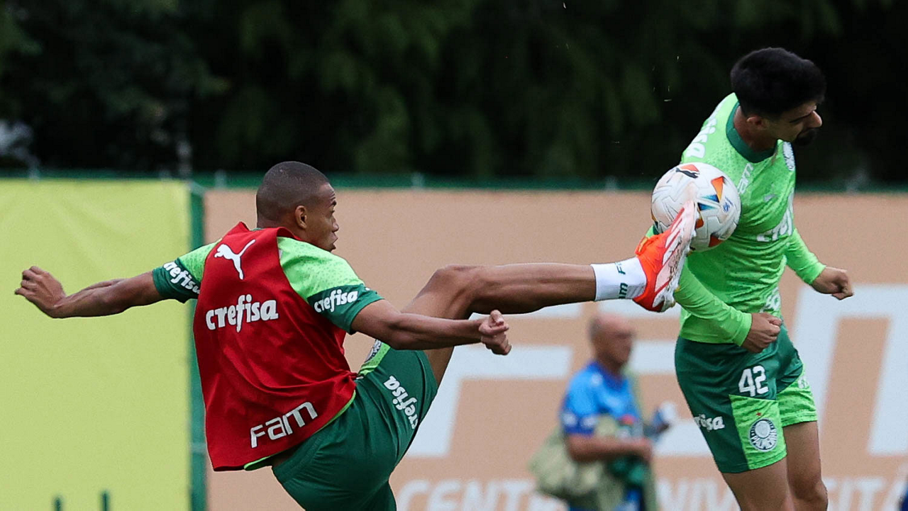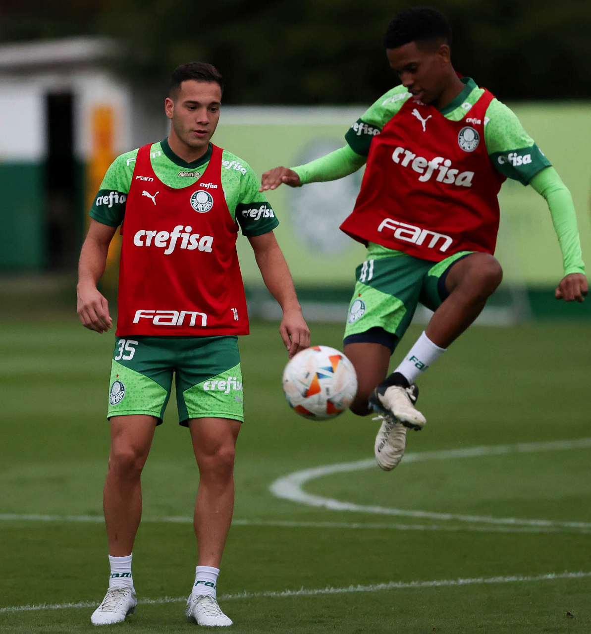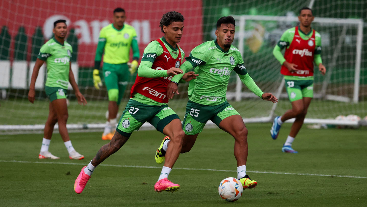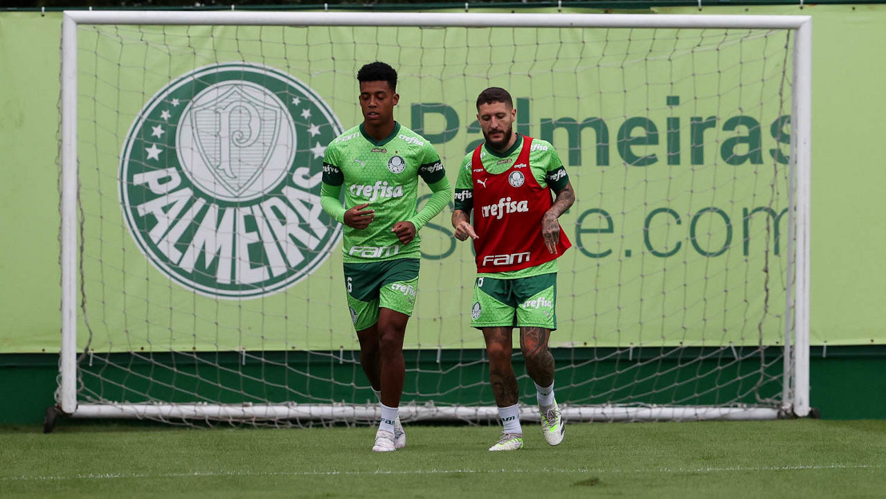 Os jogadores Gabriel Menino e Richard Ríos (D), da SE Palmeiras, durante treinamento, na Academia de Futebol. (Foto: Cesar Greco/Palmeiras/by Canon)
