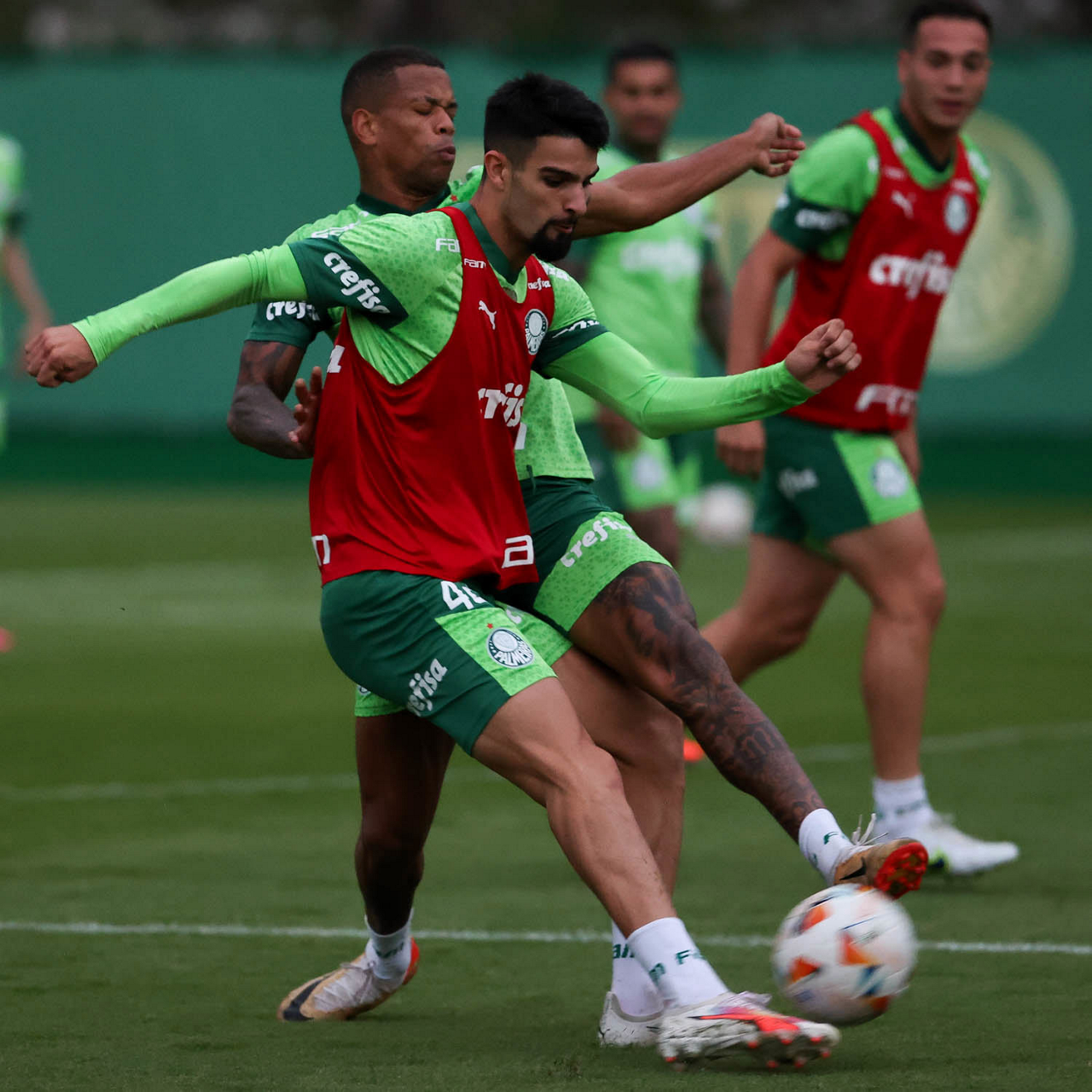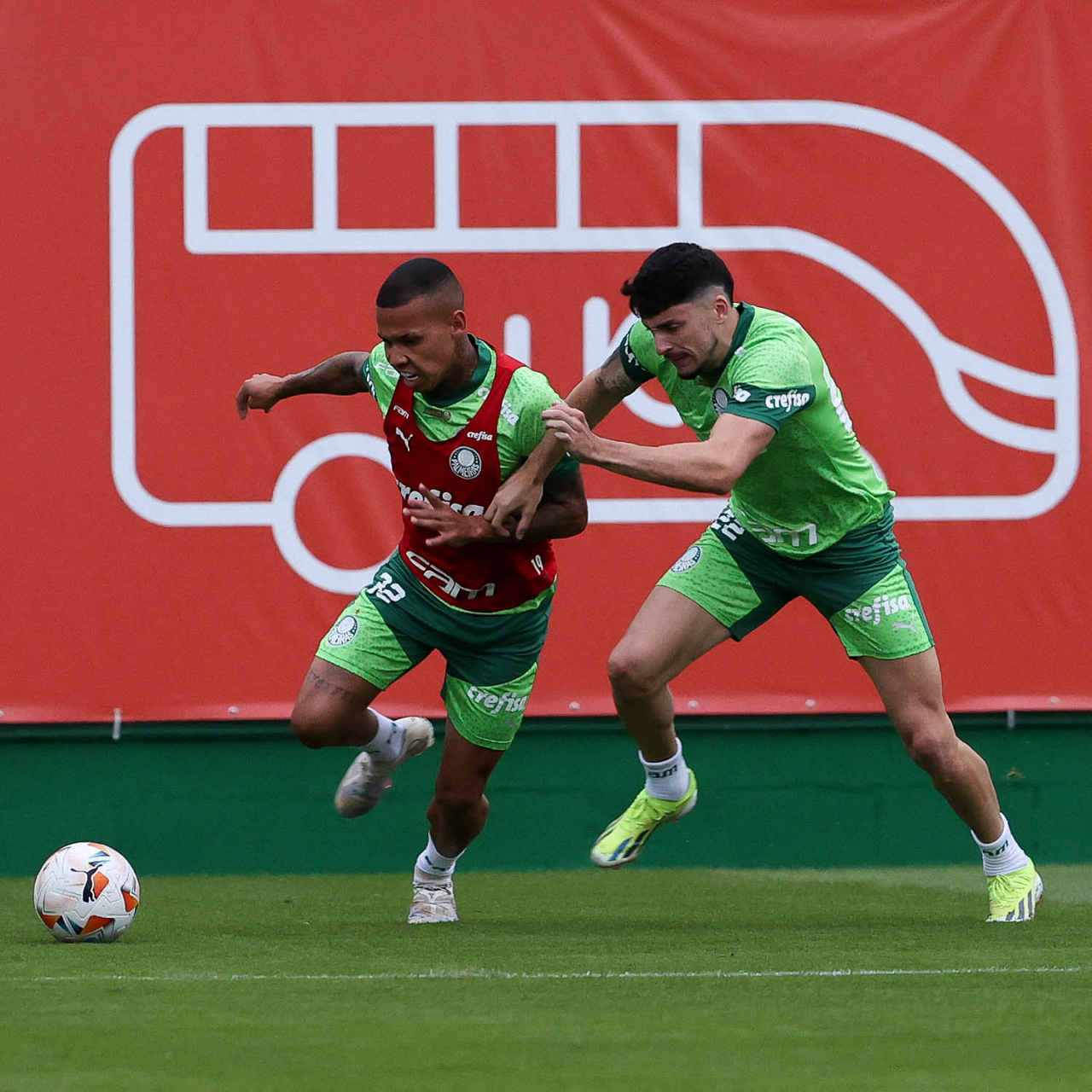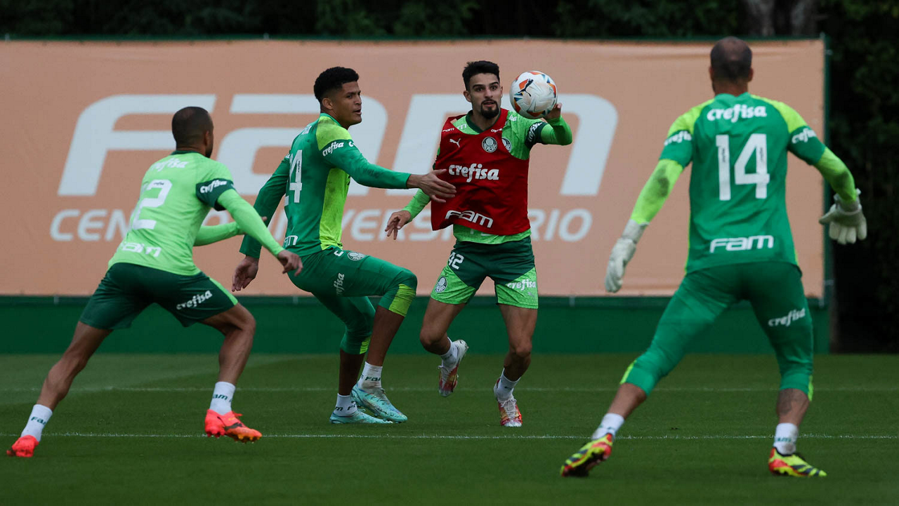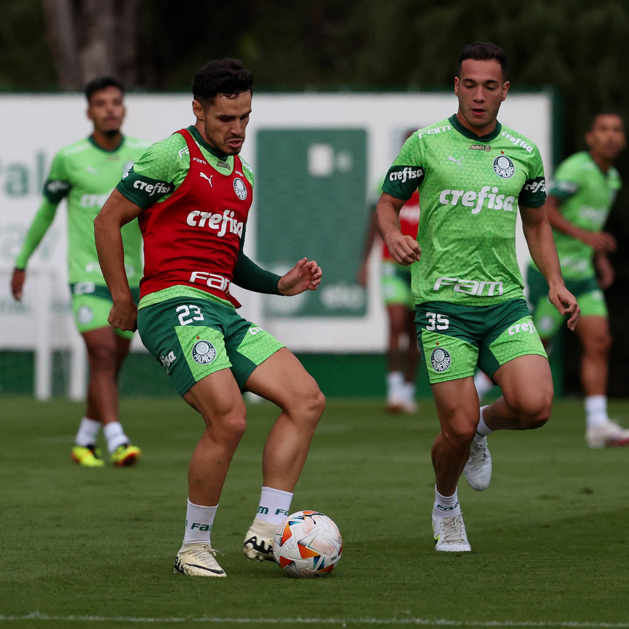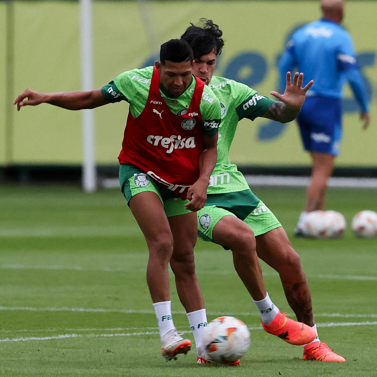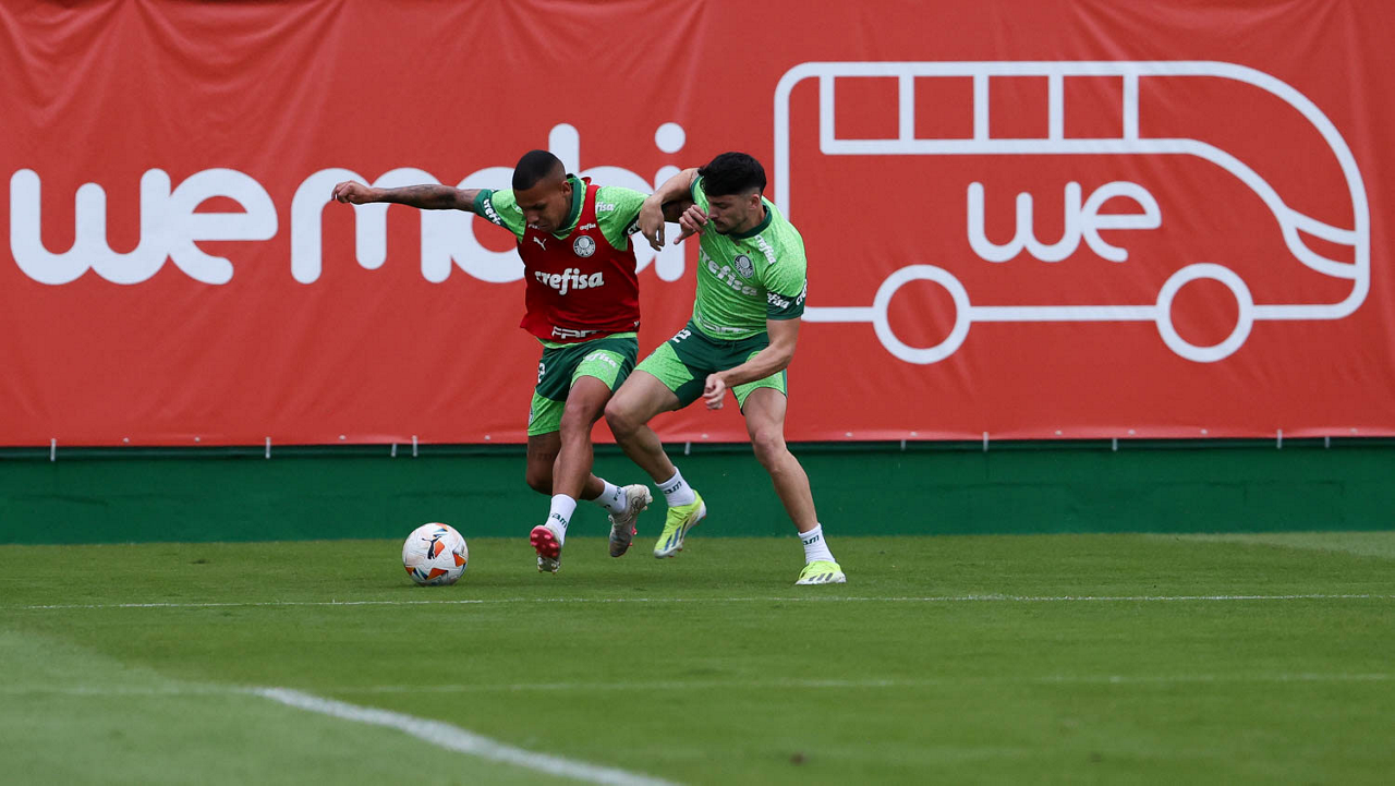 Os jogadores Gabriel Menino e Richard Ríos (D), da SE Palmeiras, durante treinamento, na Academia de Futebol. (Foto: Cesar Greco/Palmeiras/by Canon)