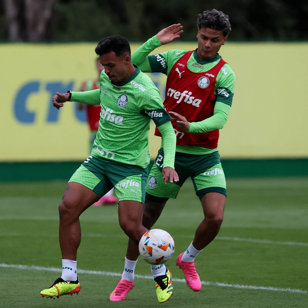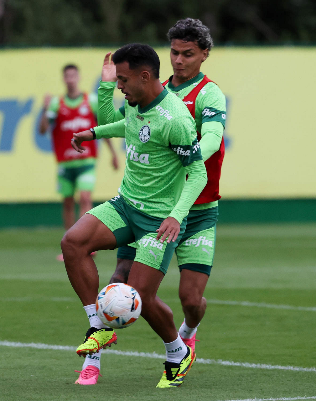 Os jogadores Richard Ríos e Gabriel Menino (D), da SE Palmeiras, durante treinamento, na Academia de Futebol. (Foto: Cesar Greco/Palmeiras/by Canon)