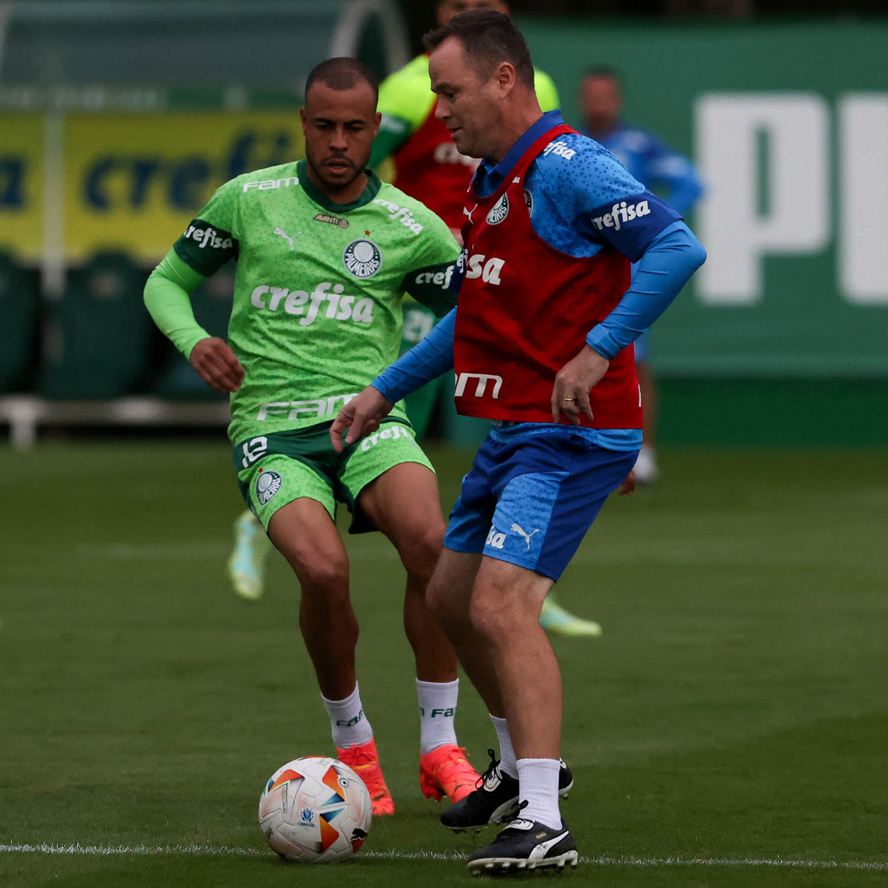 O jogador Mayke e o auxiliar técnico Andrey Lopes (D), da SE Palmeiras, durante treinamento, na Academia de Futebol. (Foto: Cesar Greco/Palmeiras/by Canon)