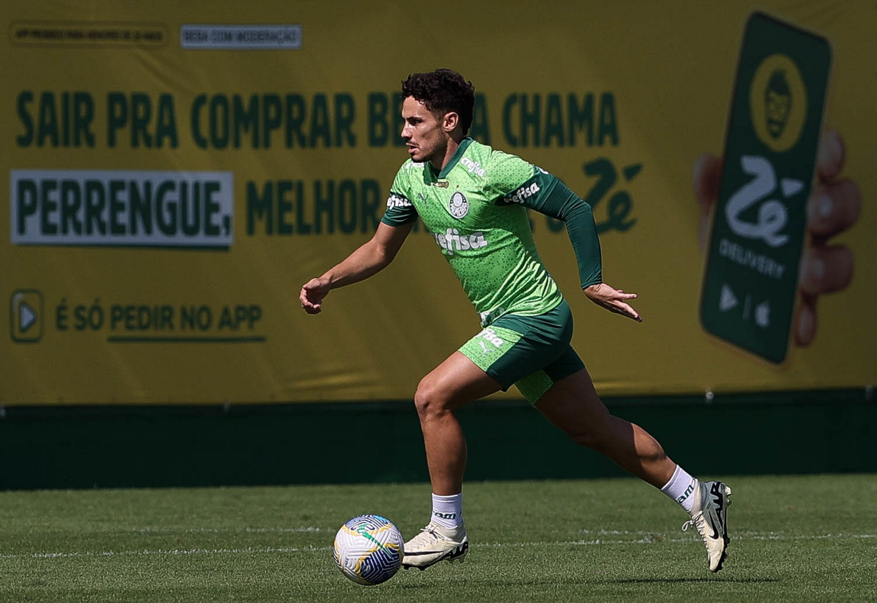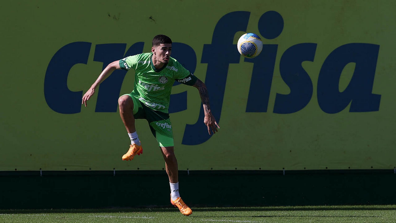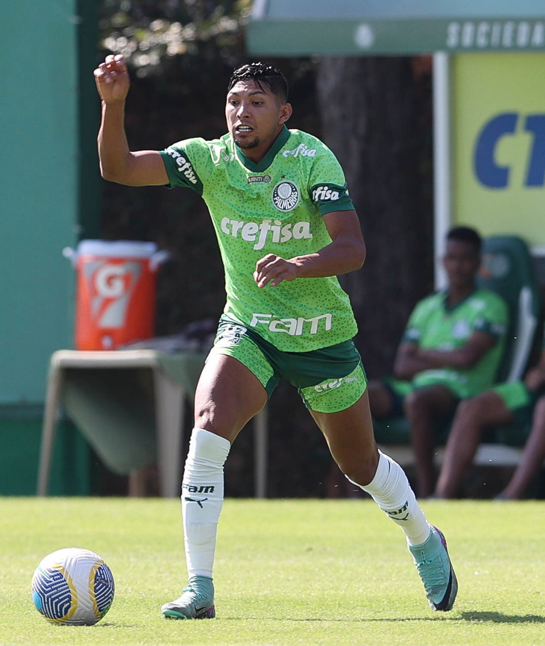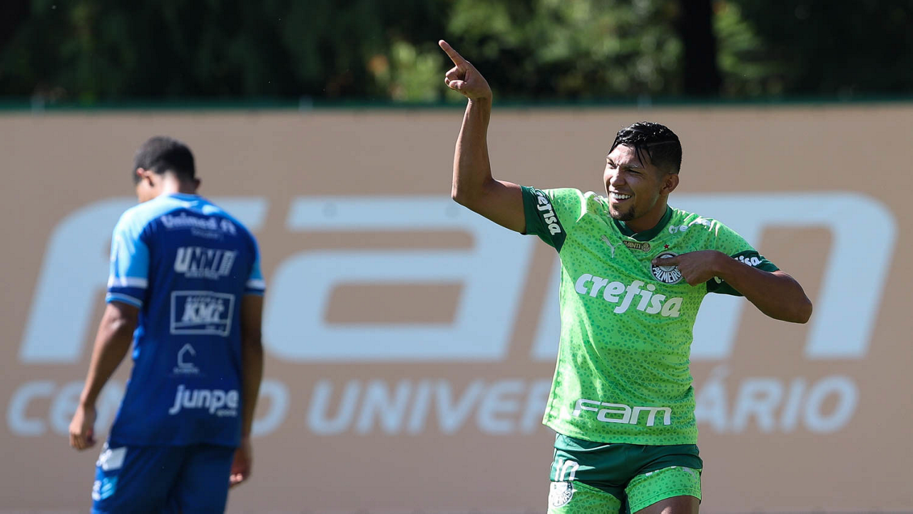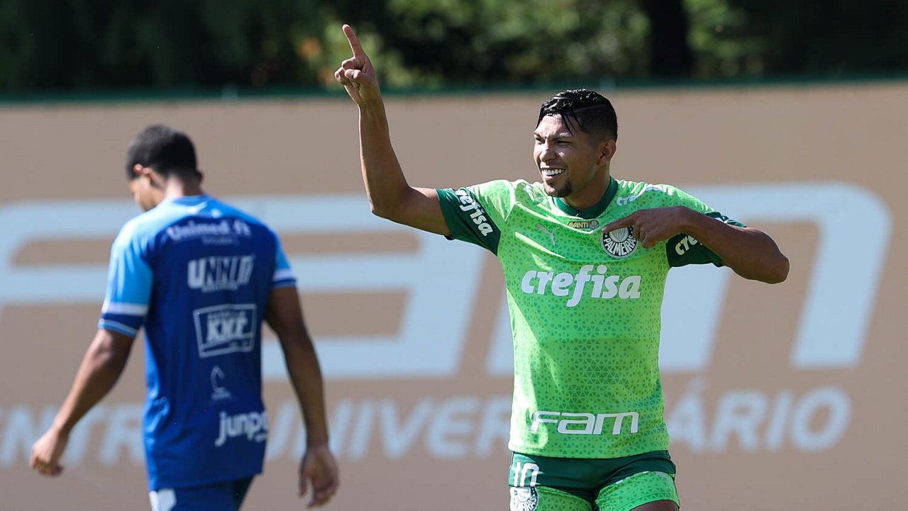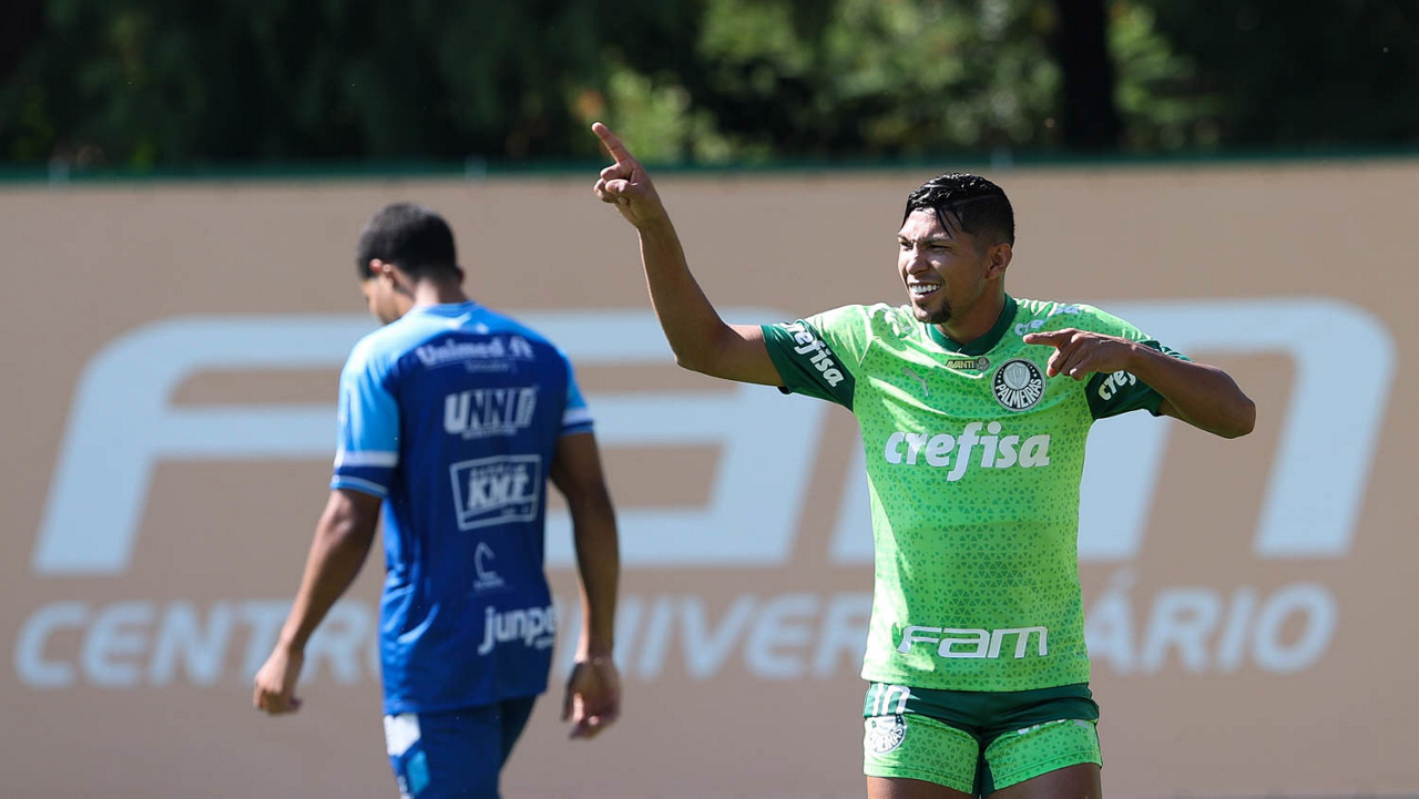 O jogador Richard Ríos, da SE Palmeiras, durante jogo-treino contra a equipe do São Bento, na Academia de Futebol. (Foto: Cesar Greco/Palmeiras/by Canon)