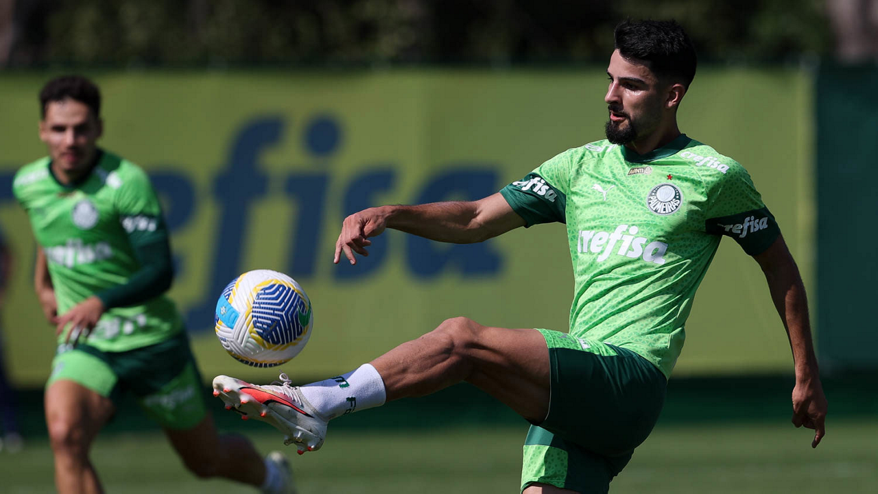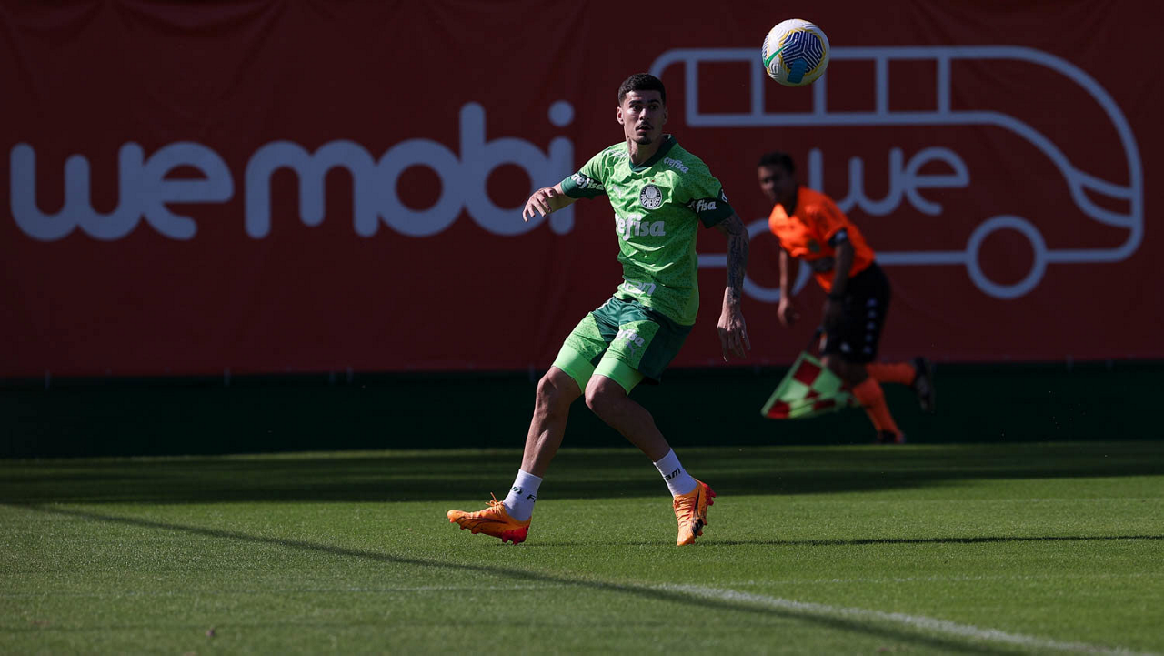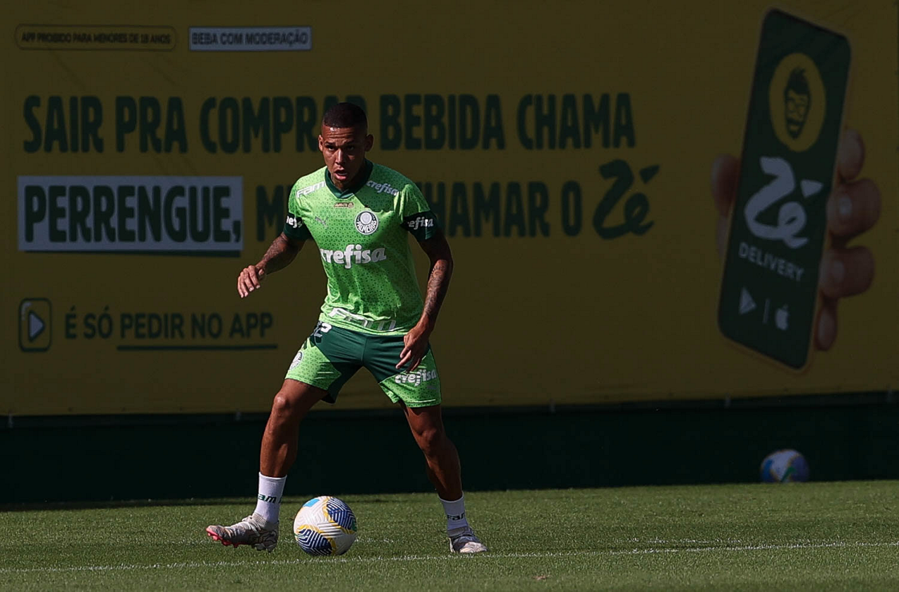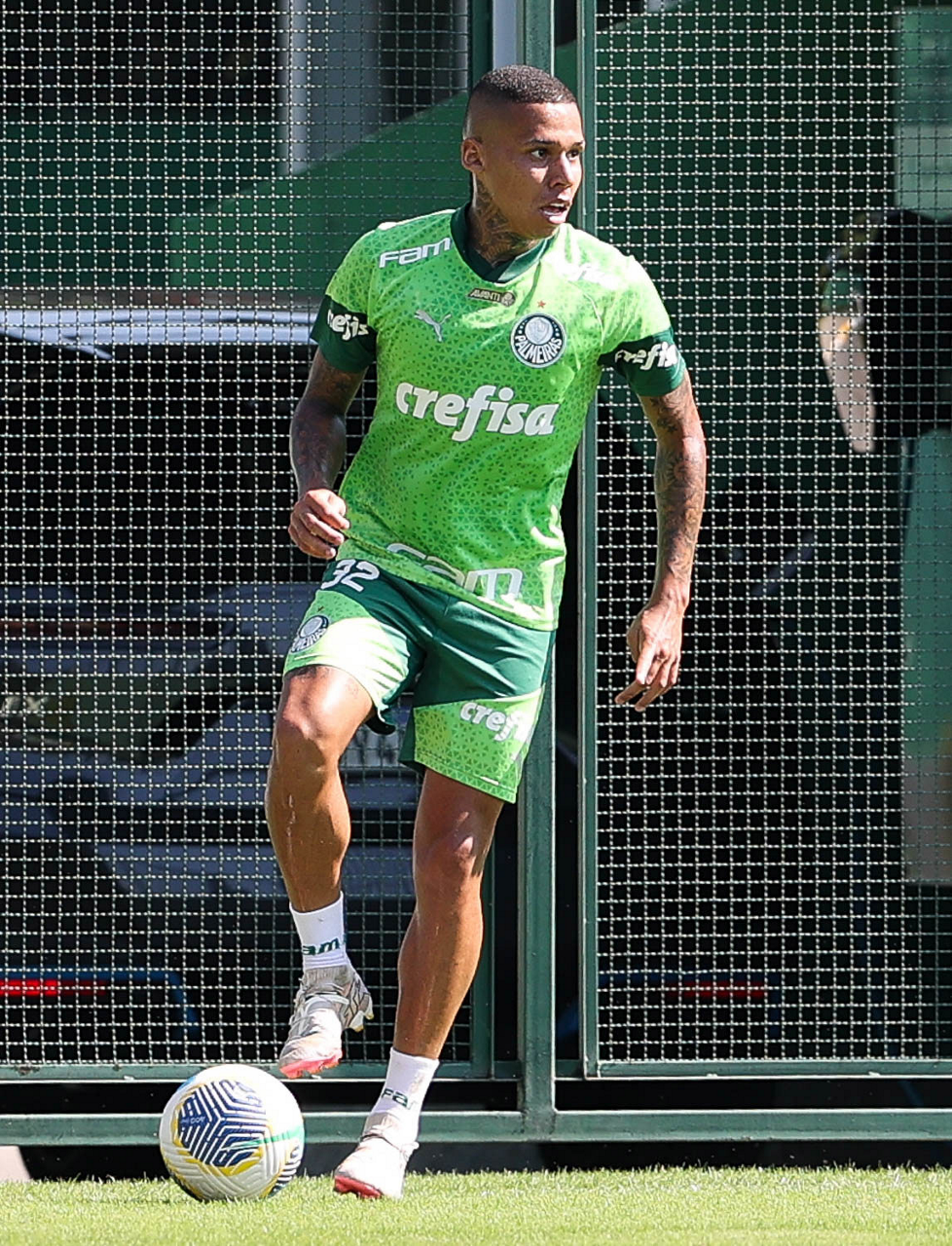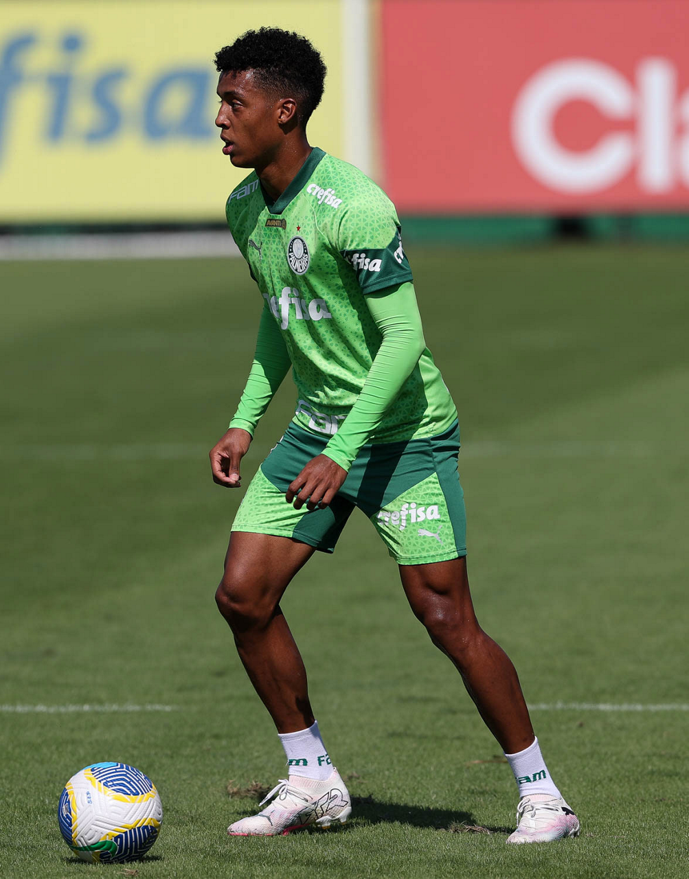 O jogador Richard Ríos, da SE Palmeiras, durante jogo-treino contra a equipe do São Bento, na Academia de Futebol. (Foto: Cesar Greco/Palmeiras/by Canon)