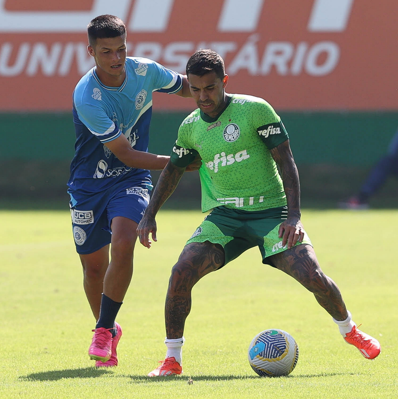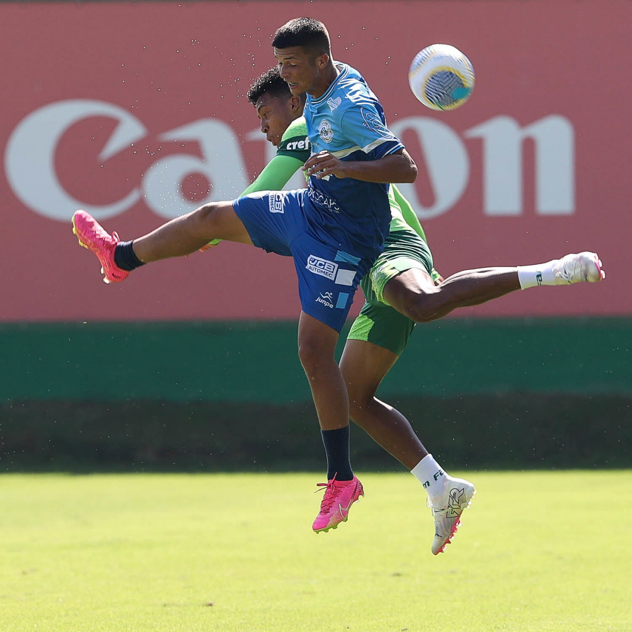 Os jogadores Gabriel Menino e Rômulo (D), da SE Palmeiras, durante jogo-treino contra a equipe do São Bento, na Academia de Futebol. (Foto: Cesar Greco/Palmeiras/by Canon)
