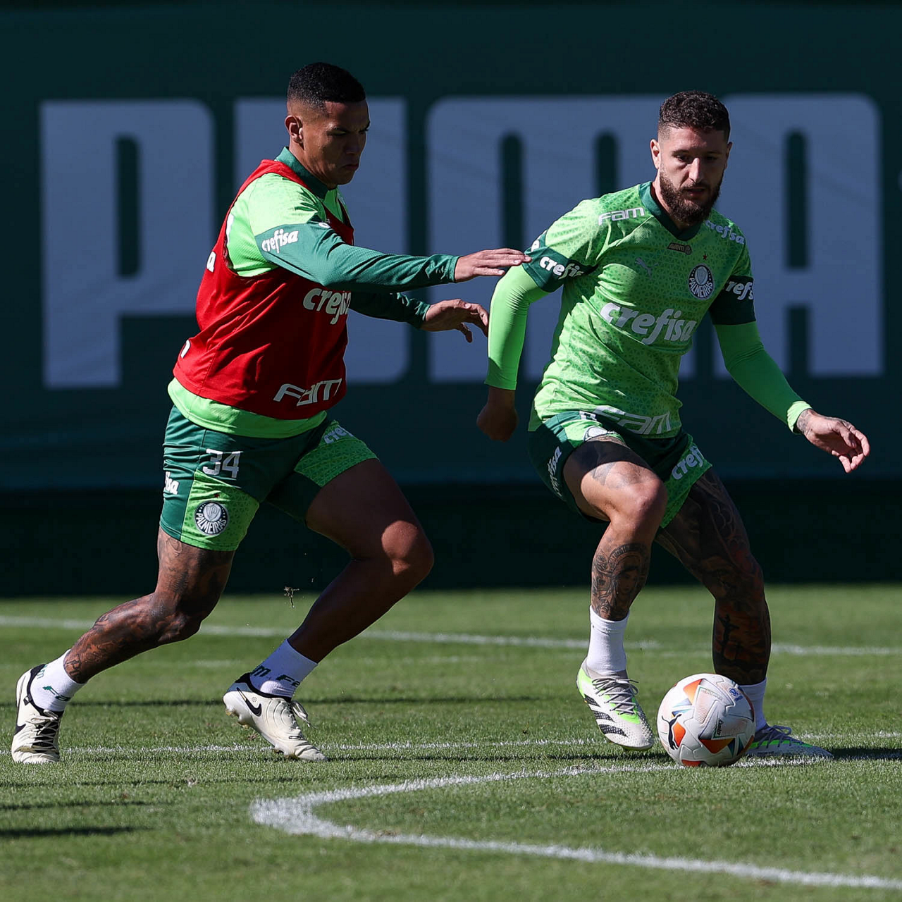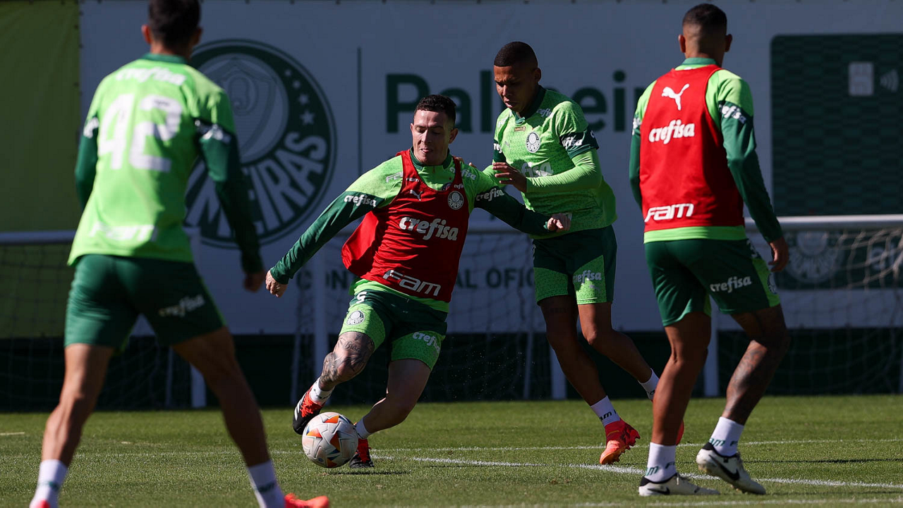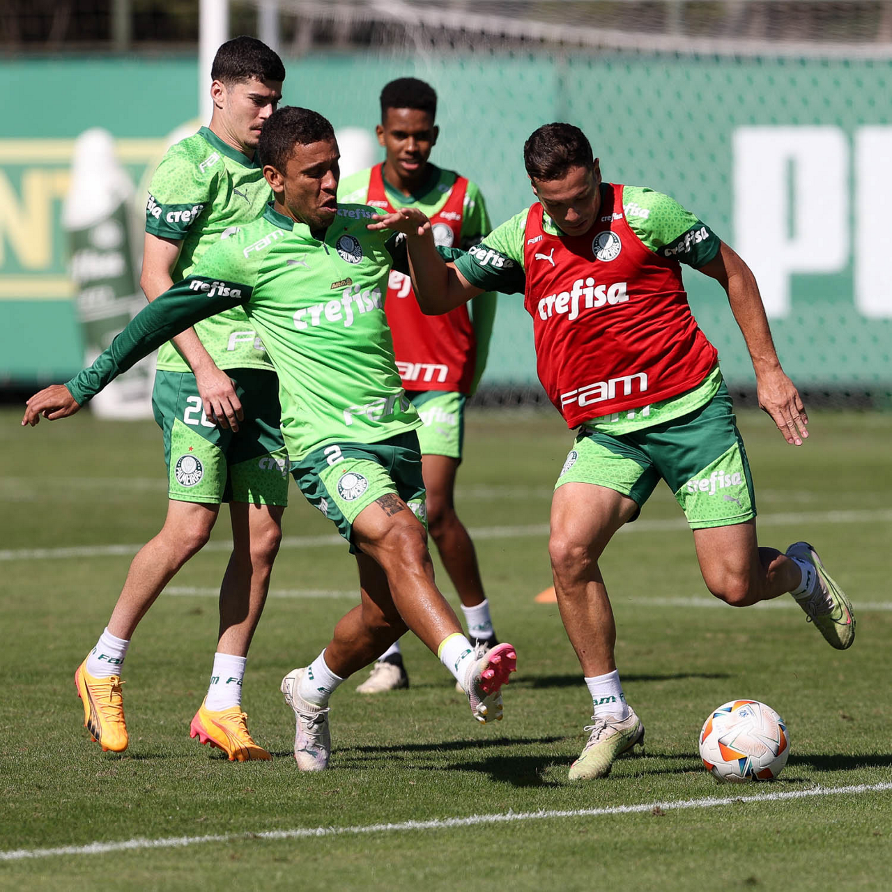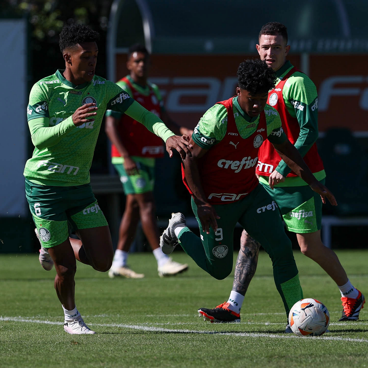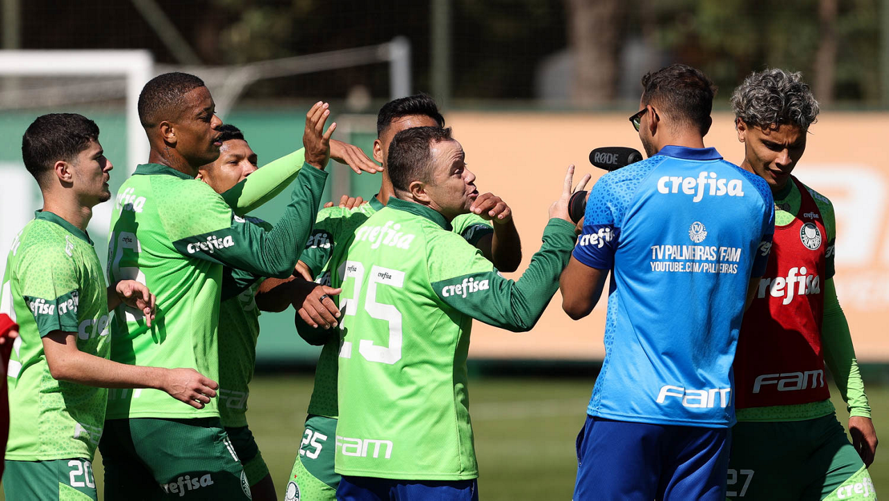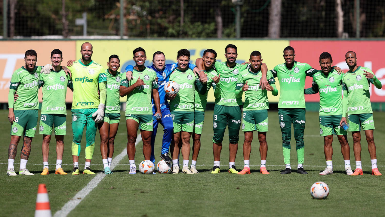 Os jogadores Zé Rafael, Rômulo, Marcelo Lomba, Rony, Gabriel Menino, Raphael Veiga, Lázaro, Luan, Garcia, Caio Paulista, Marcos Rocha e Mayke (E/D) e o auxiliar técnico Andrey Lopes (C), da SE Palmeiras, durante treinamento, na Academia de Futebol. (Foto: Cesar Greco/Palmeiras/by Canon)