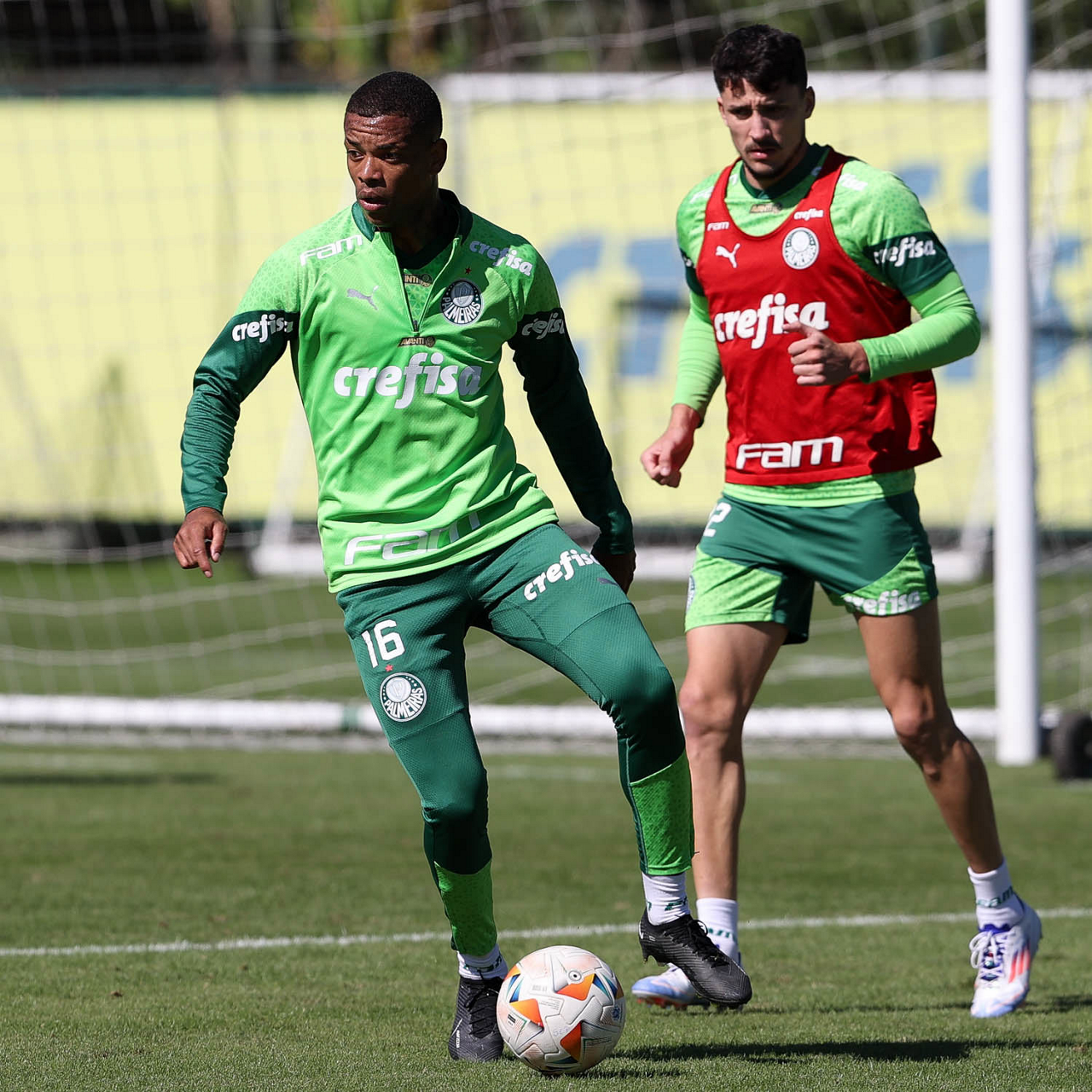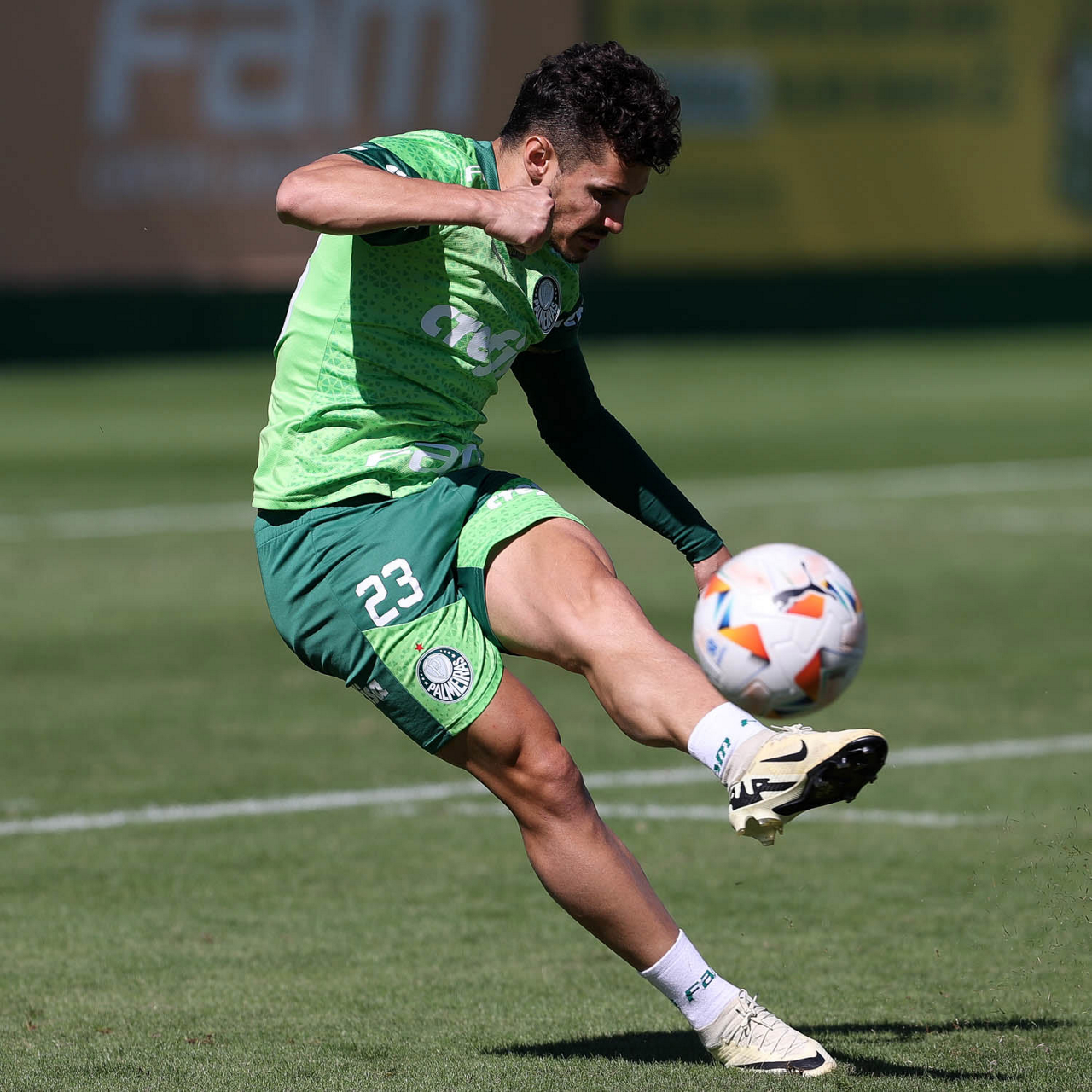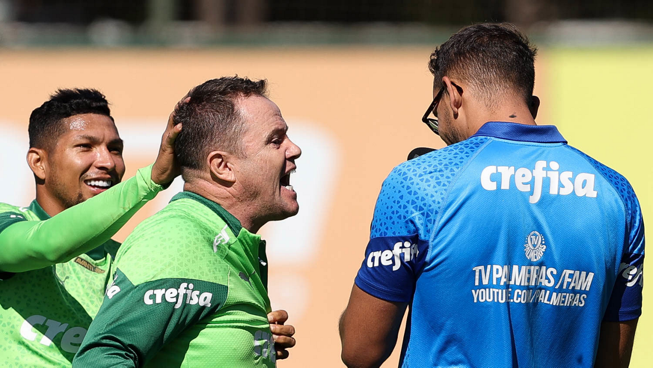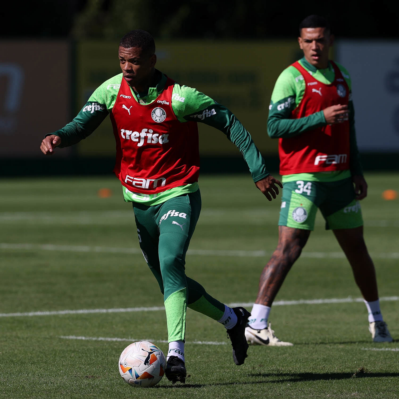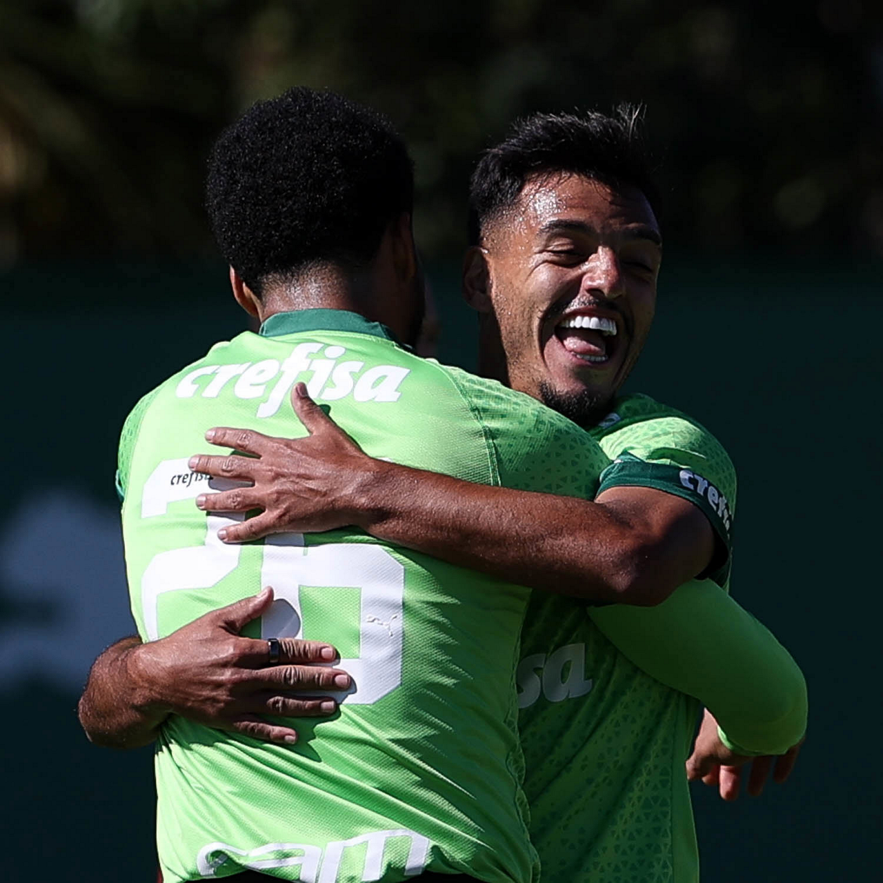 Os jogadores Zé Rafael, Rômulo, Marcelo Lomba, Rony, Gabriel Menino, Raphael Veiga, Lázaro, Luan, Garcia, Caio Paulista, Marcos Rocha e Mayke (E/D) e o auxiliar técnico Andrey Lopes (C), da SE Palmeiras, durante treinamento, na Academia de Futebol. (Foto: Cesar Greco/Palmeiras/by Canon)