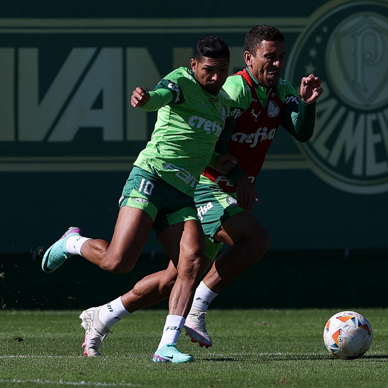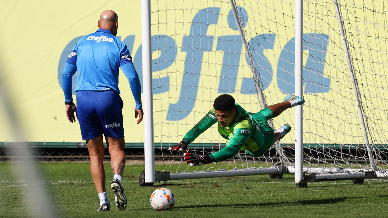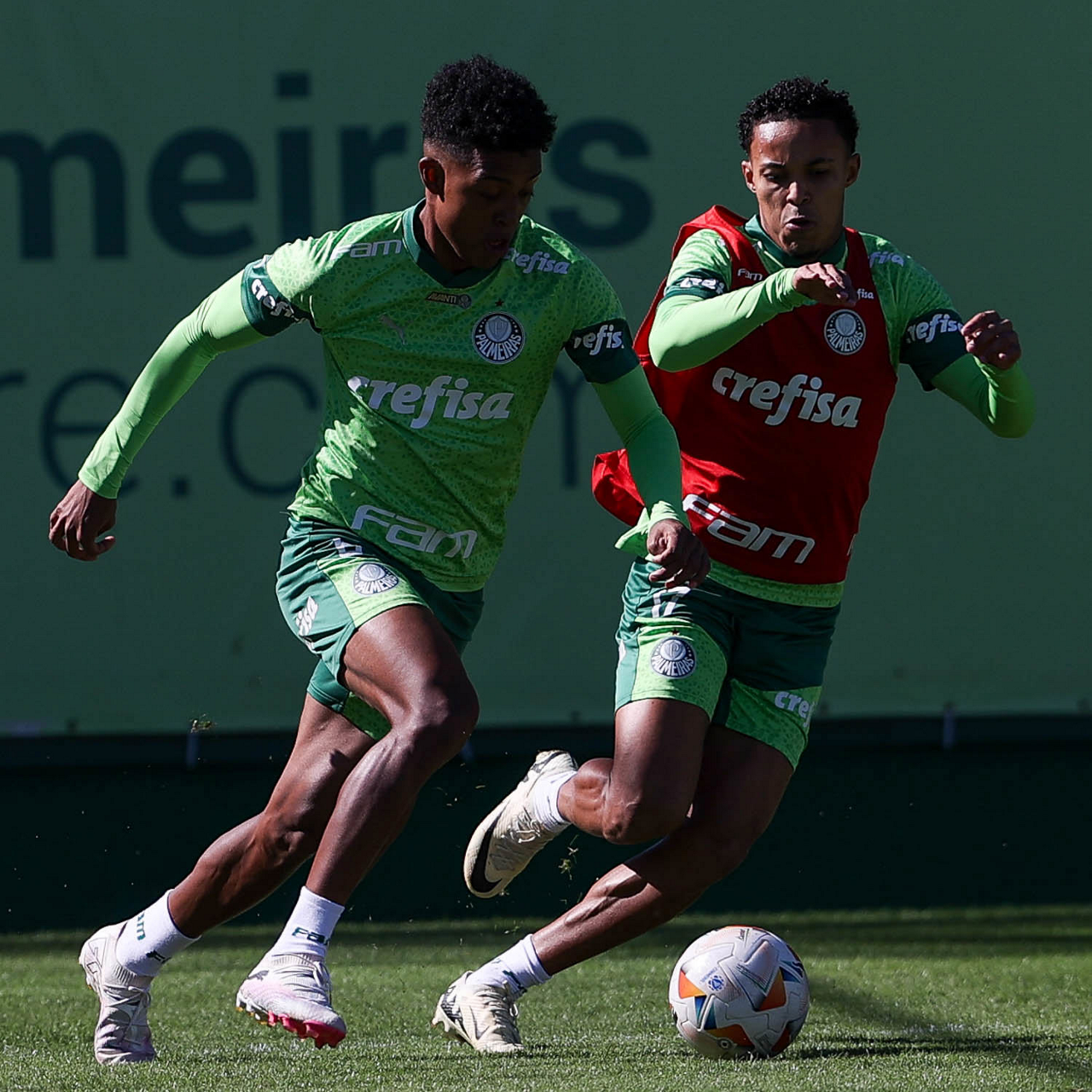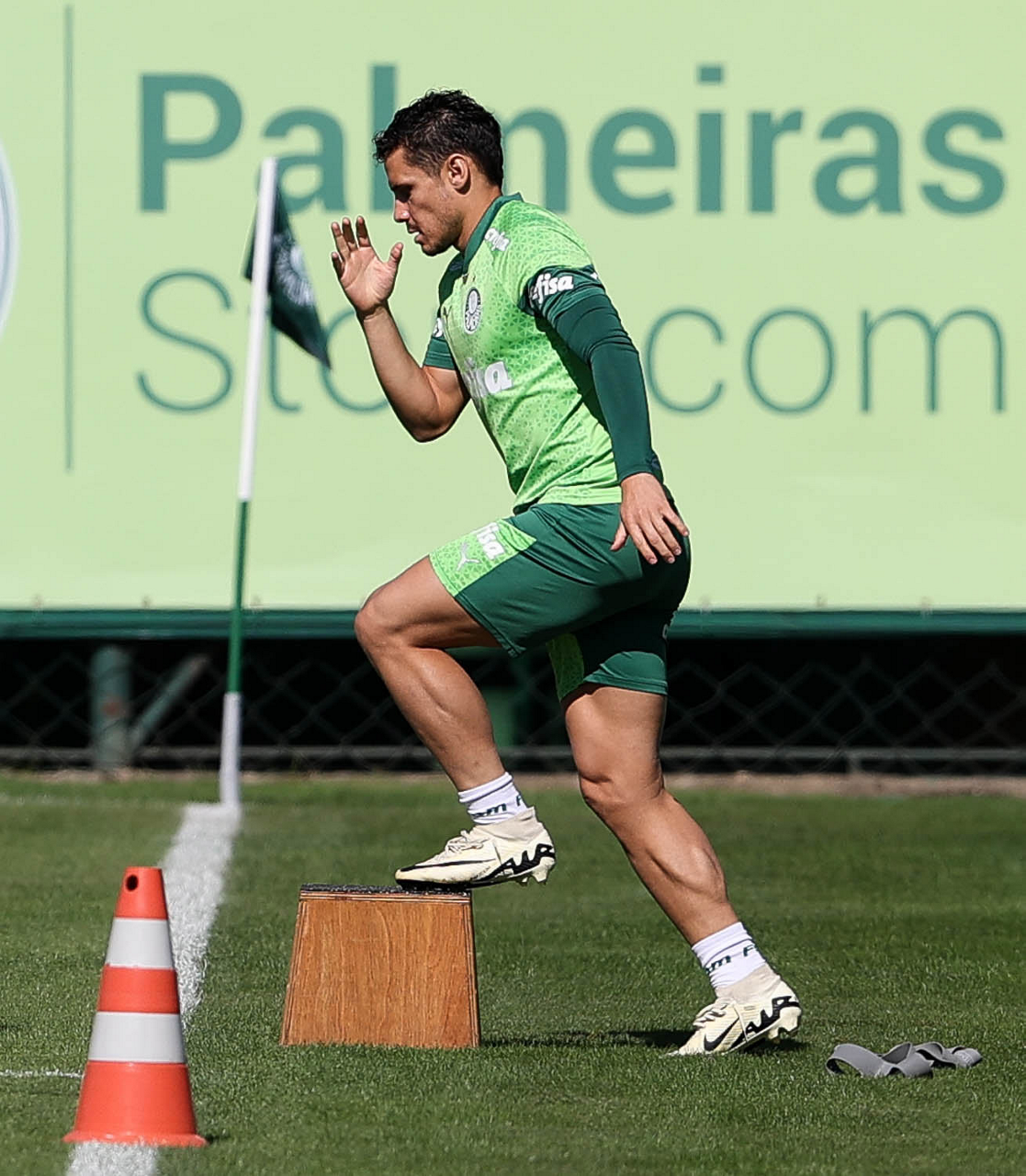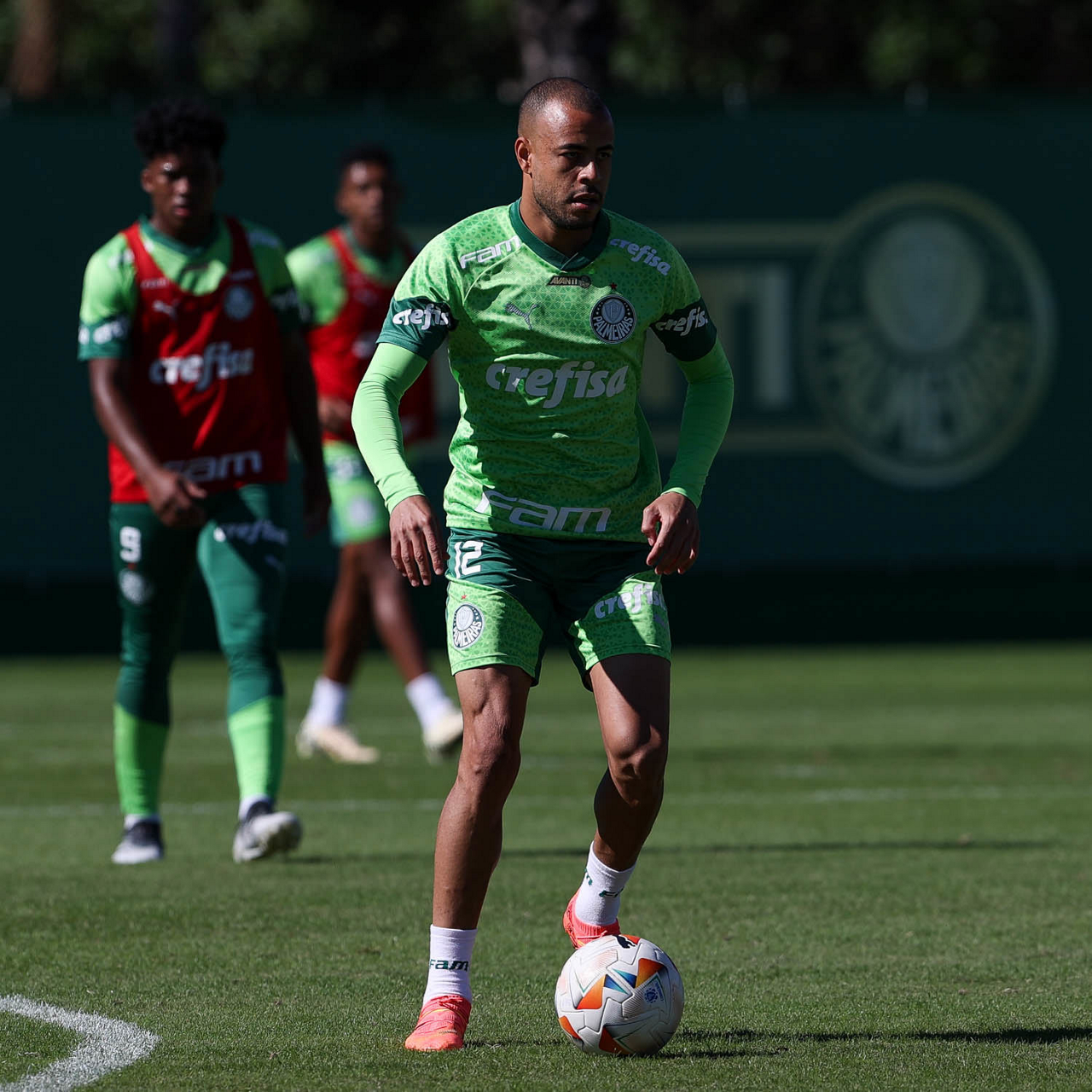 Os jogadores Zé Rafael, Rômulo, Marcelo Lomba, Rony, Gabriel Menino, Raphael Veiga, Lázaro, Luan, Garcia, Caio Paulista, Marcos Rocha e Mayke (E/D) e o auxiliar técnico Andrey Lopes (C), da SE Palmeiras, durante treinamento, na Academia de Futebol. (Foto: Cesar Greco/Palmeiras/by Canon)