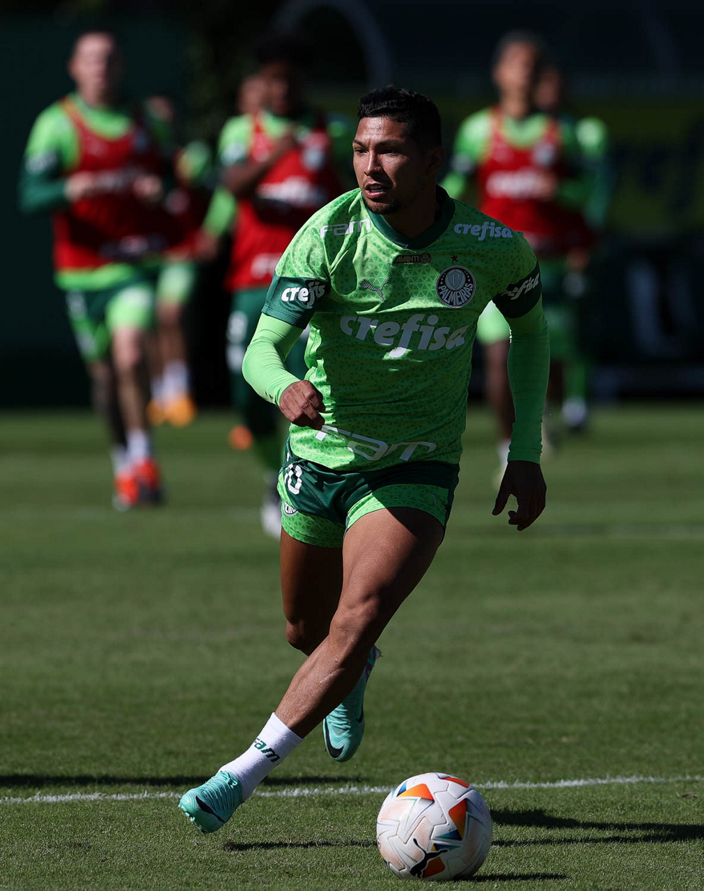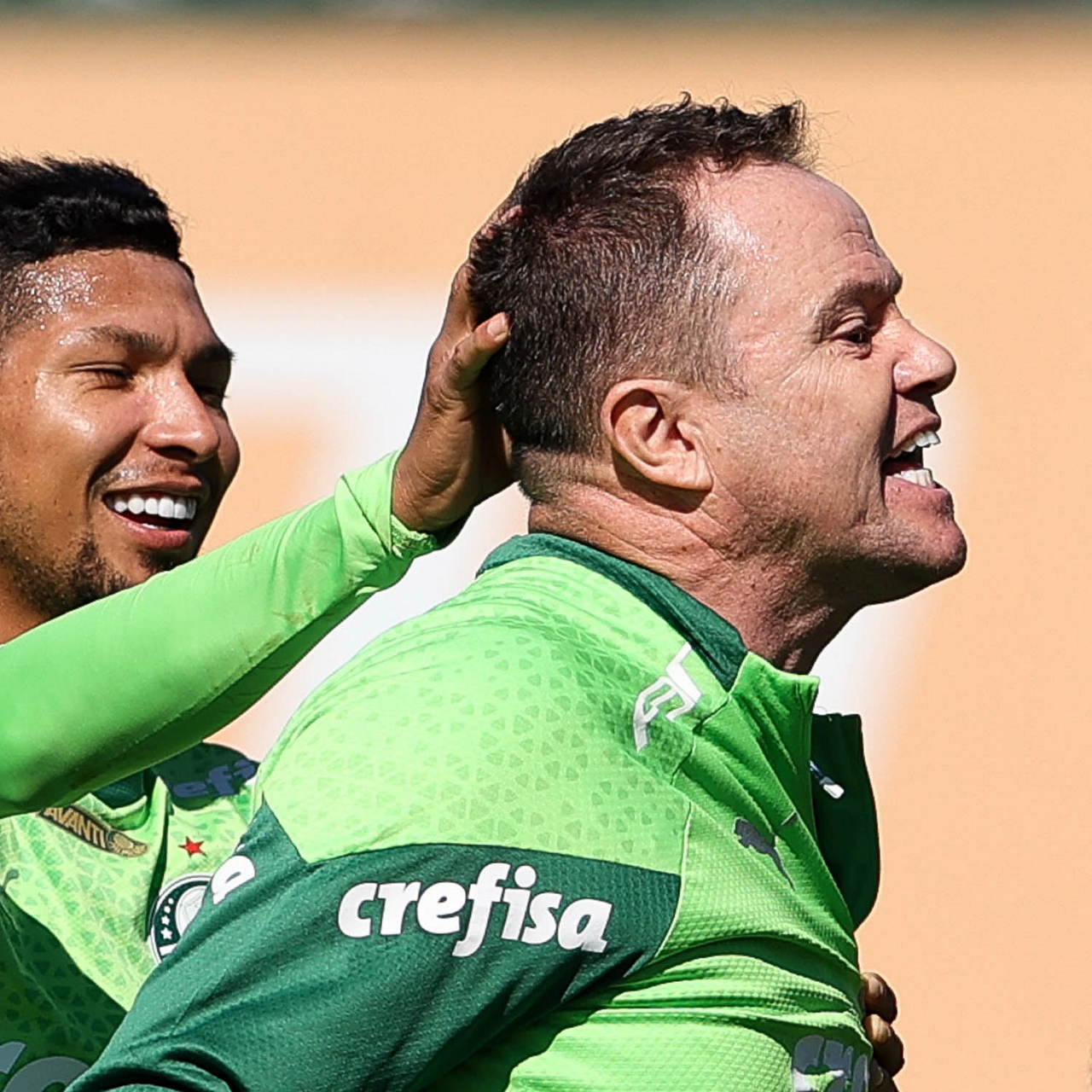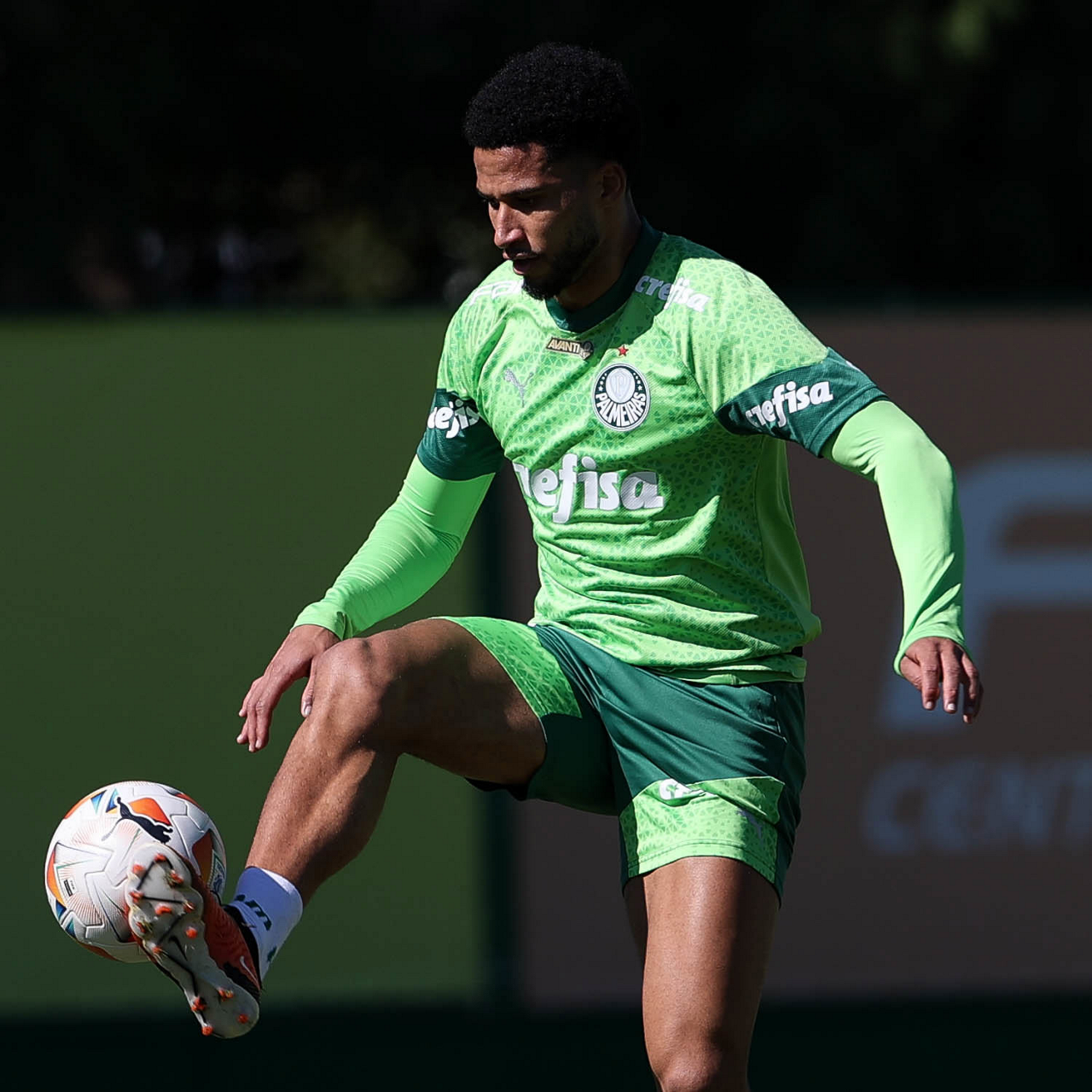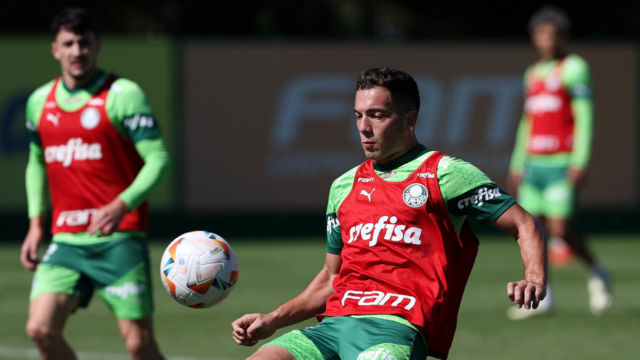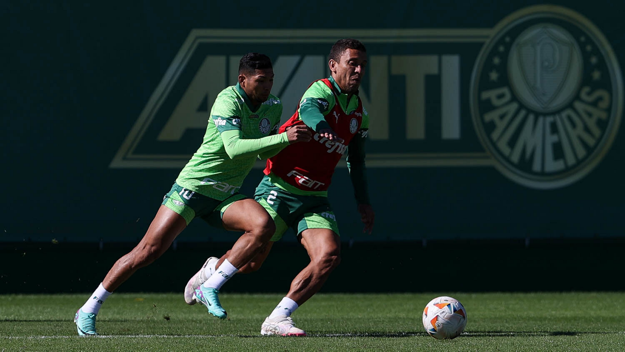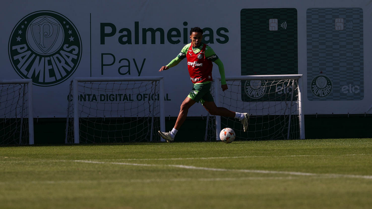 Os jogadores Zé Rafael, Rômulo, Marcelo Lomba, Rony, Gabriel Menino, Raphael Veiga, Lázaro, Luan, Garcia, Caio Paulista, Marcos Rocha e Mayke (E/D) e o auxiliar técnico Andrey Lopes (C), da SE Palmeiras, durante treinamento, na Academia de Futebol. (Foto: Cesar Greco/Palmeiras/by Canon)