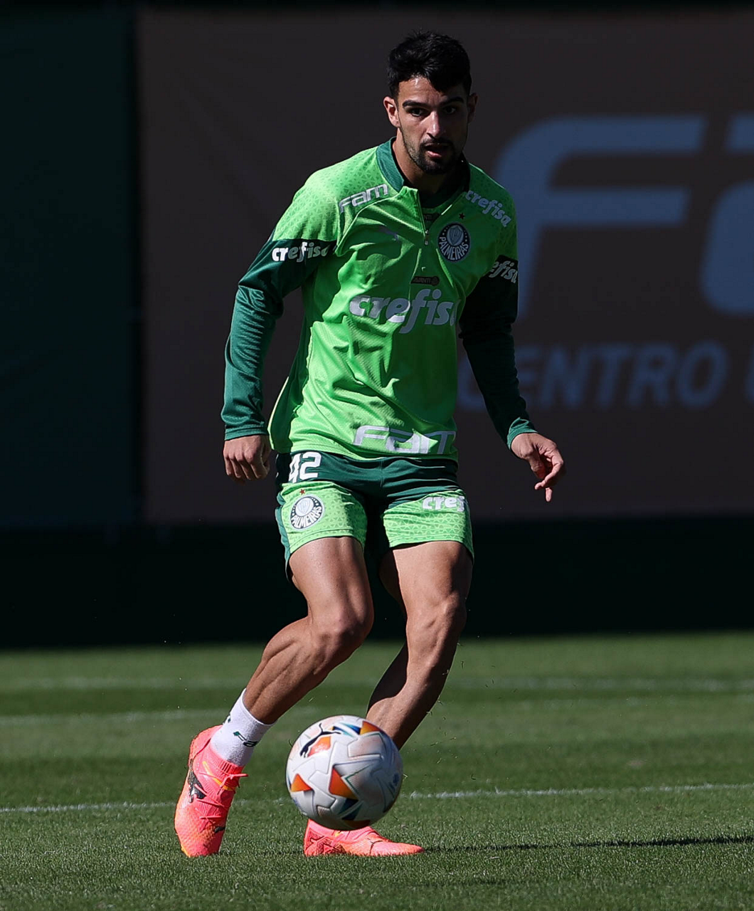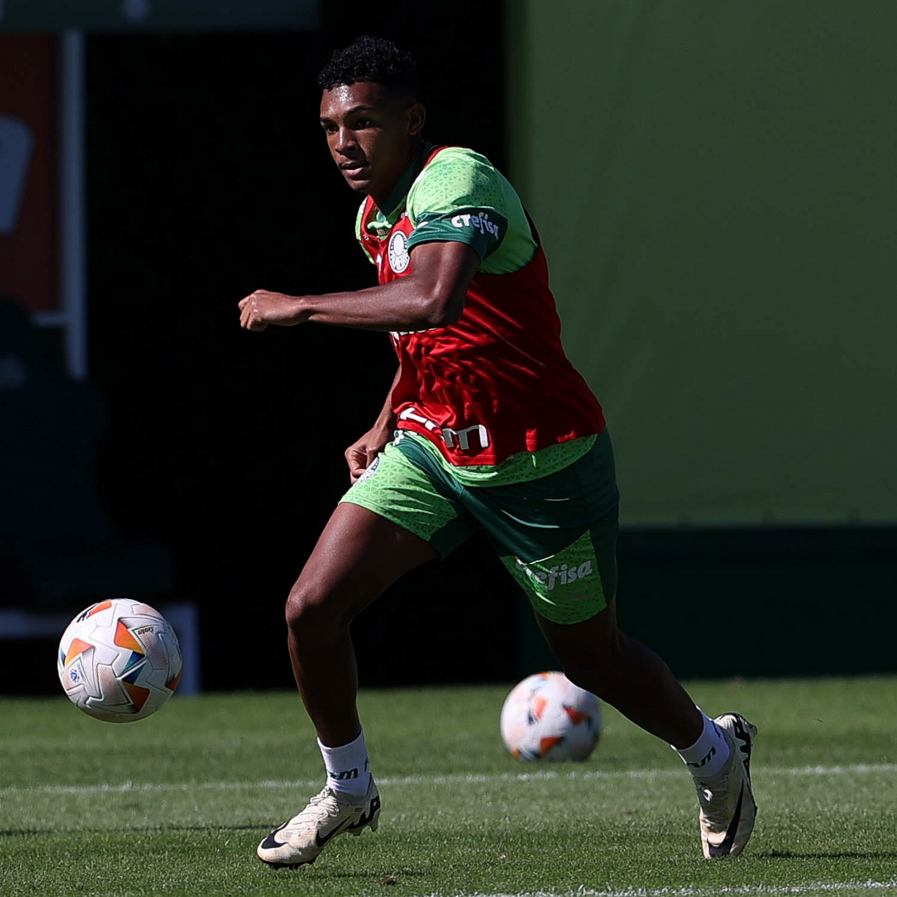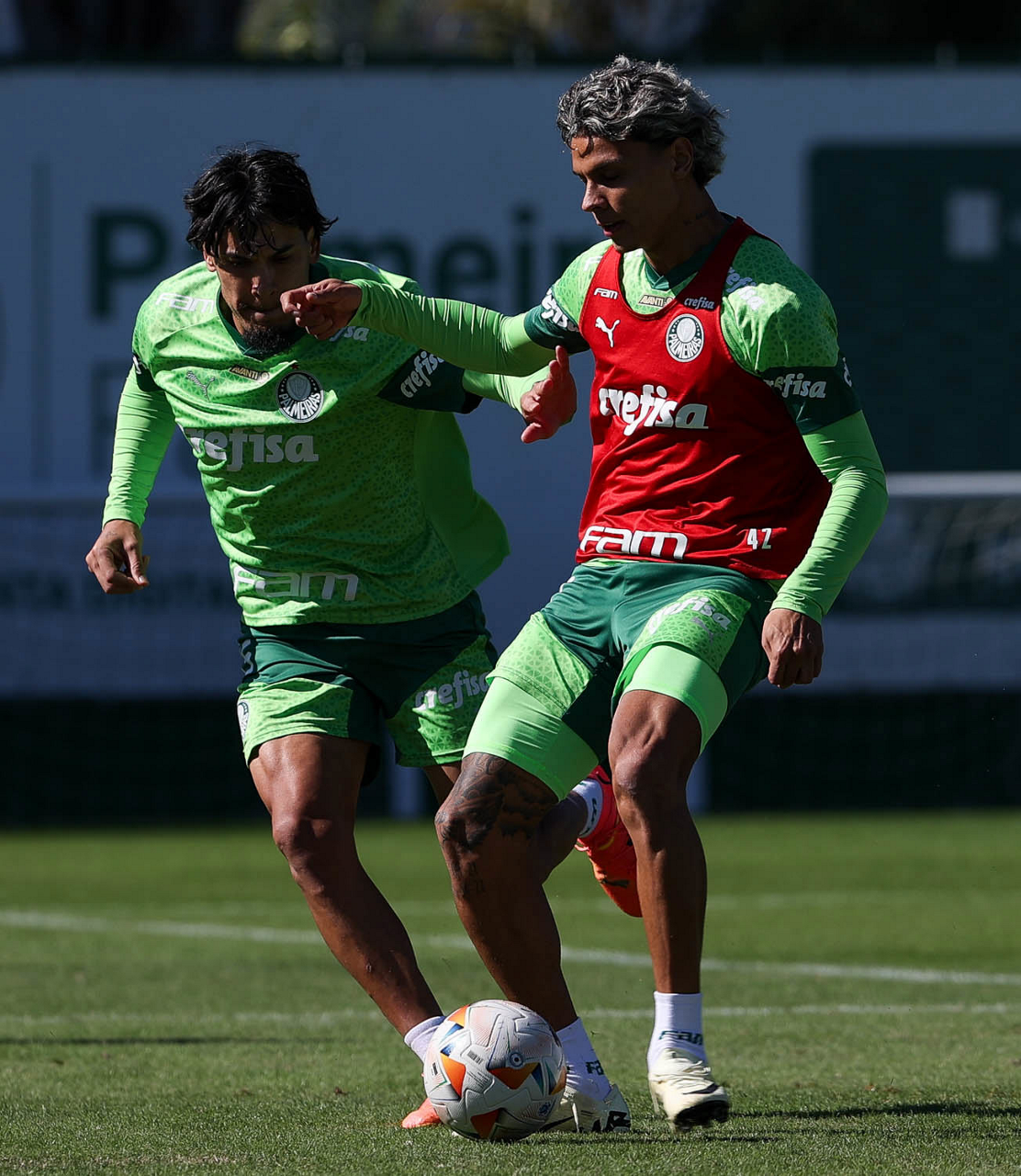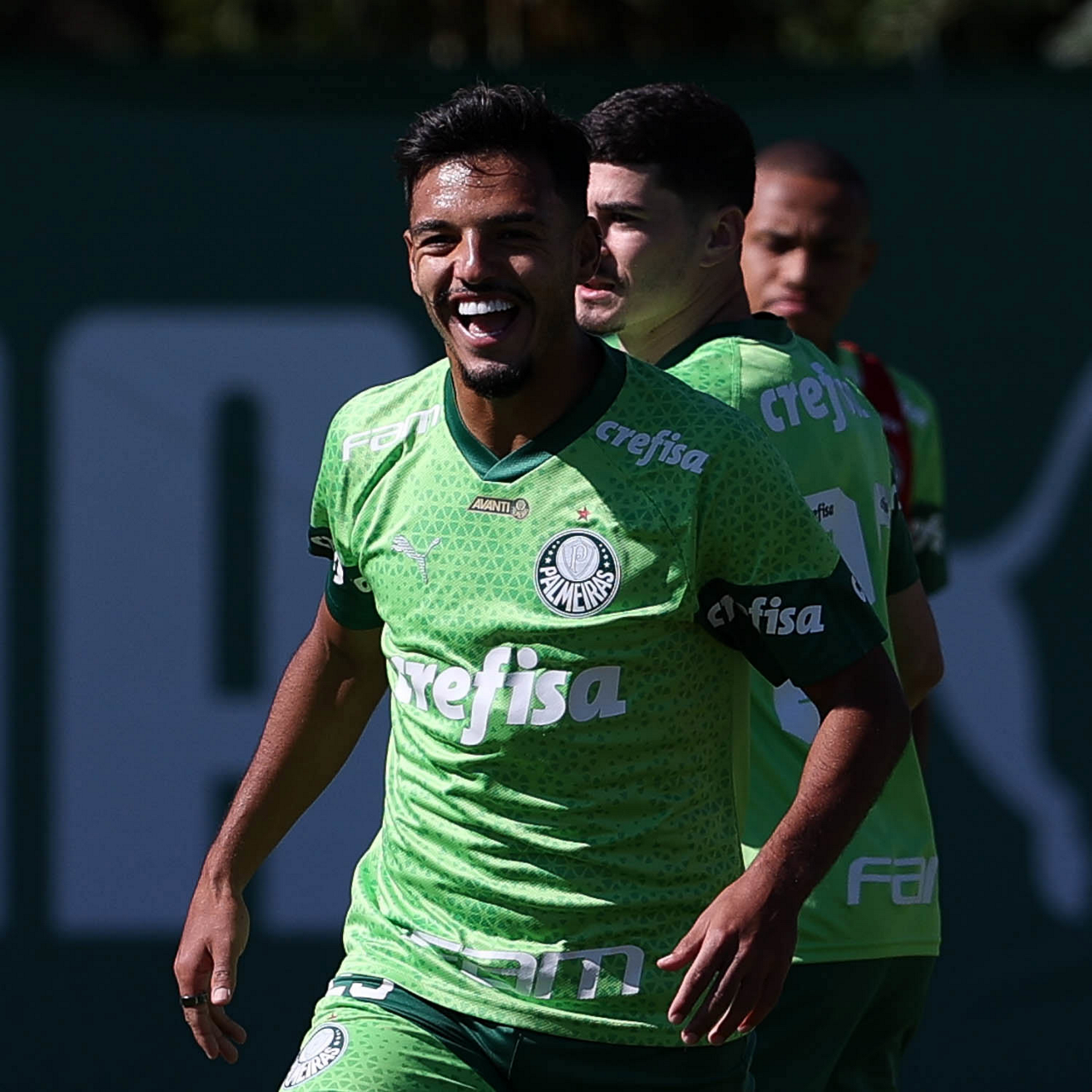 Os jogadores Zé Rafael, Rômulo, Marcelo Lomba, Rony, Gabriel Menino, Raphael Veiga, Lázaro, Luan, Garcia, Caio Paulista, Marcos Rocha e Mayke (E/D) e o auxiliar técnico Andrey Lopes (C), da SE Palmeiras, durante treinamento, na Academia de Futebol. (Foto: Cesar Greco/Palmeiras/by Canon)