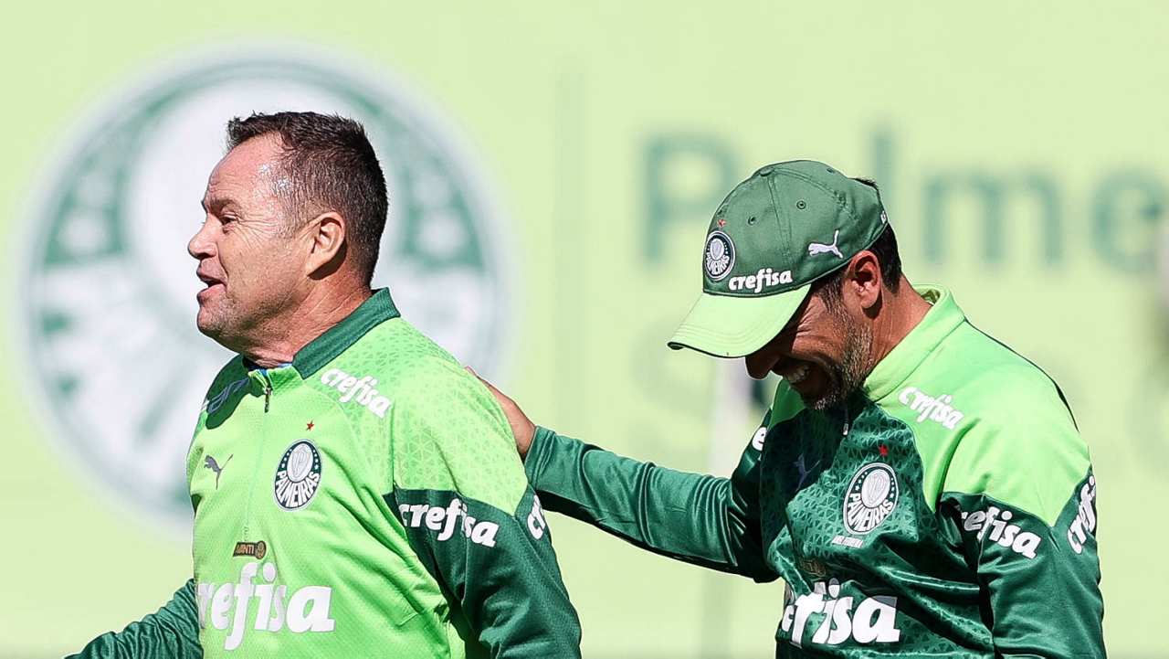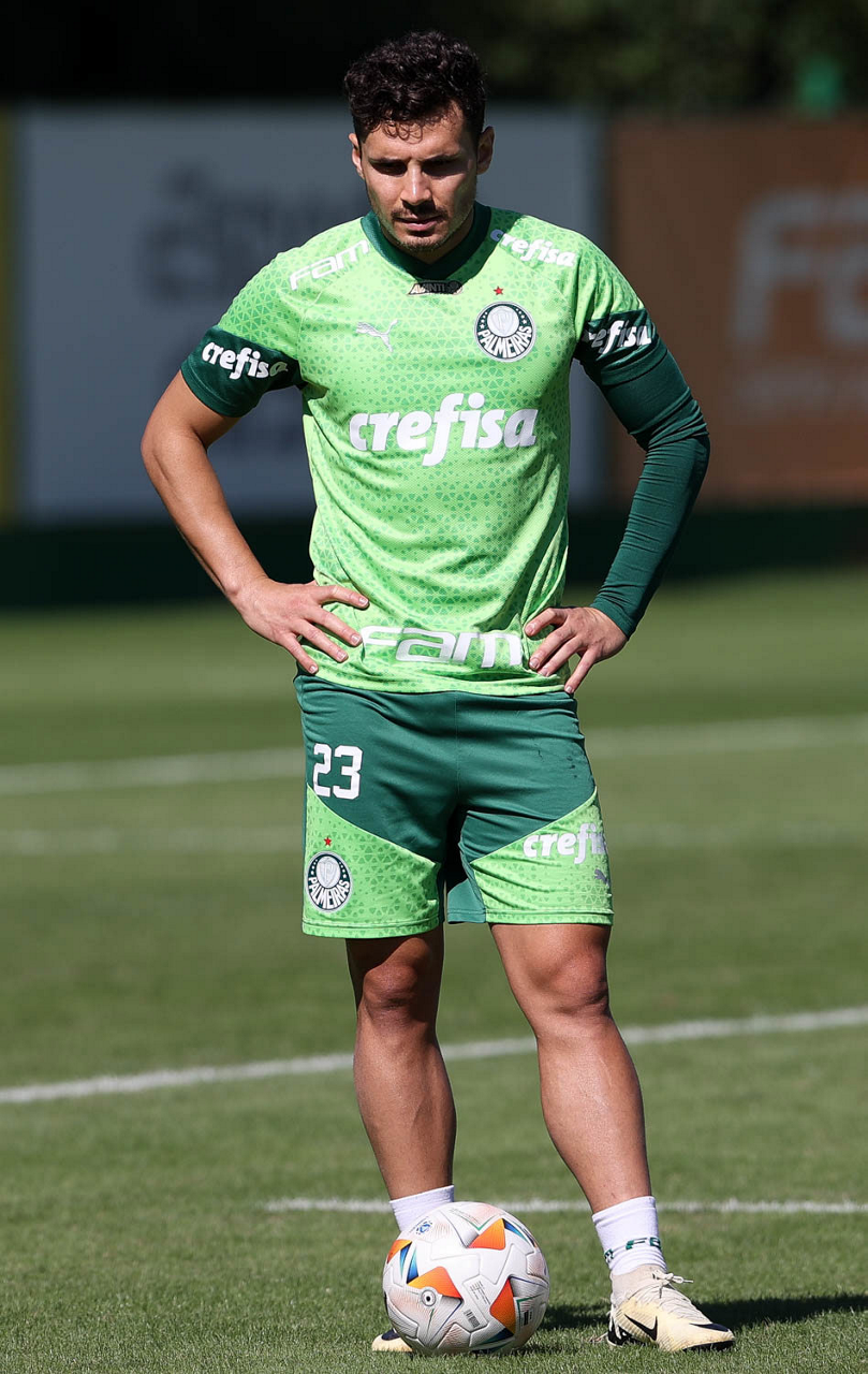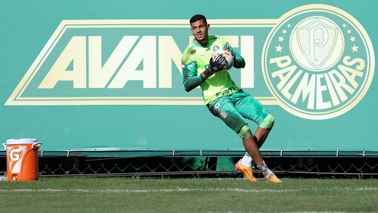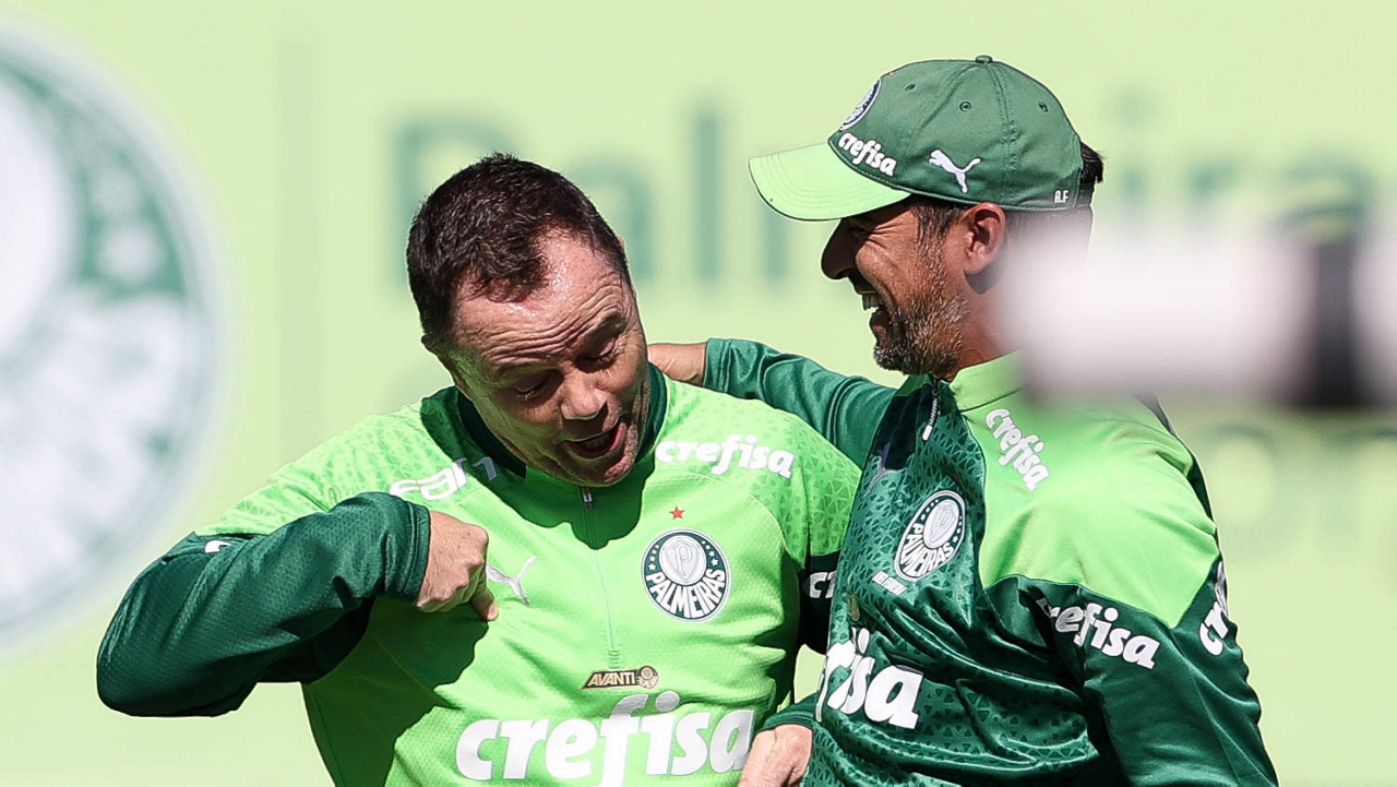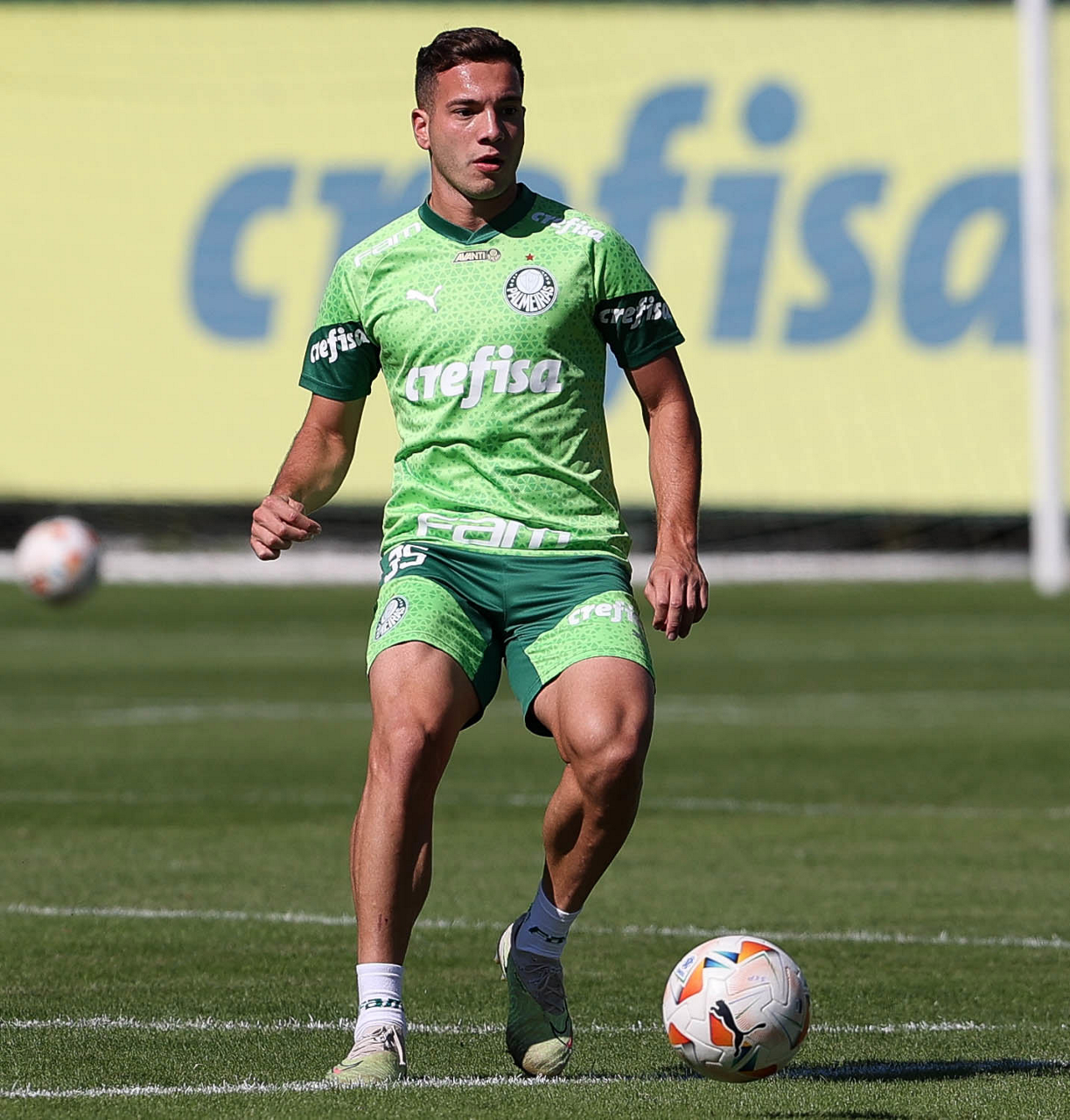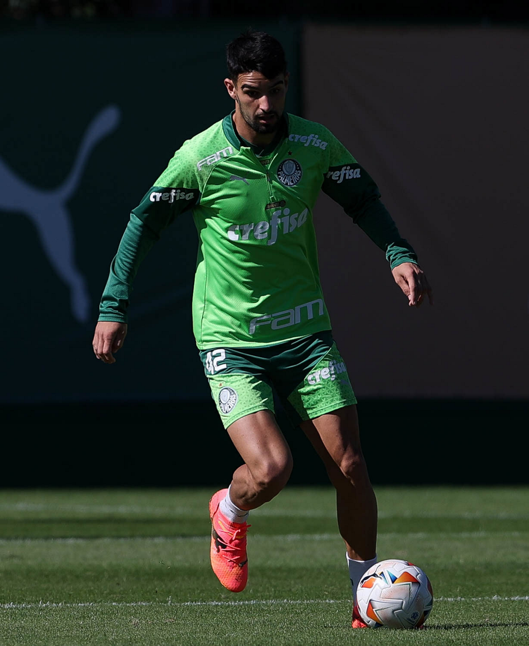 Os jogadores Zé Rafael, Rômulo, Marcelo Lomba, Rony, Gabriel Menino, Raphael Veiga, Lázaro, Luan, Garcia, Caio Paulista, Marcos Rocha e Mayke (E/D) e o auxiliar técnico Andrey Lopes (C), da SE Palmeiras, durante treinamento, na Academia de Futebol. (Foto: Cesar Greco/Palmeiras/by Canon)