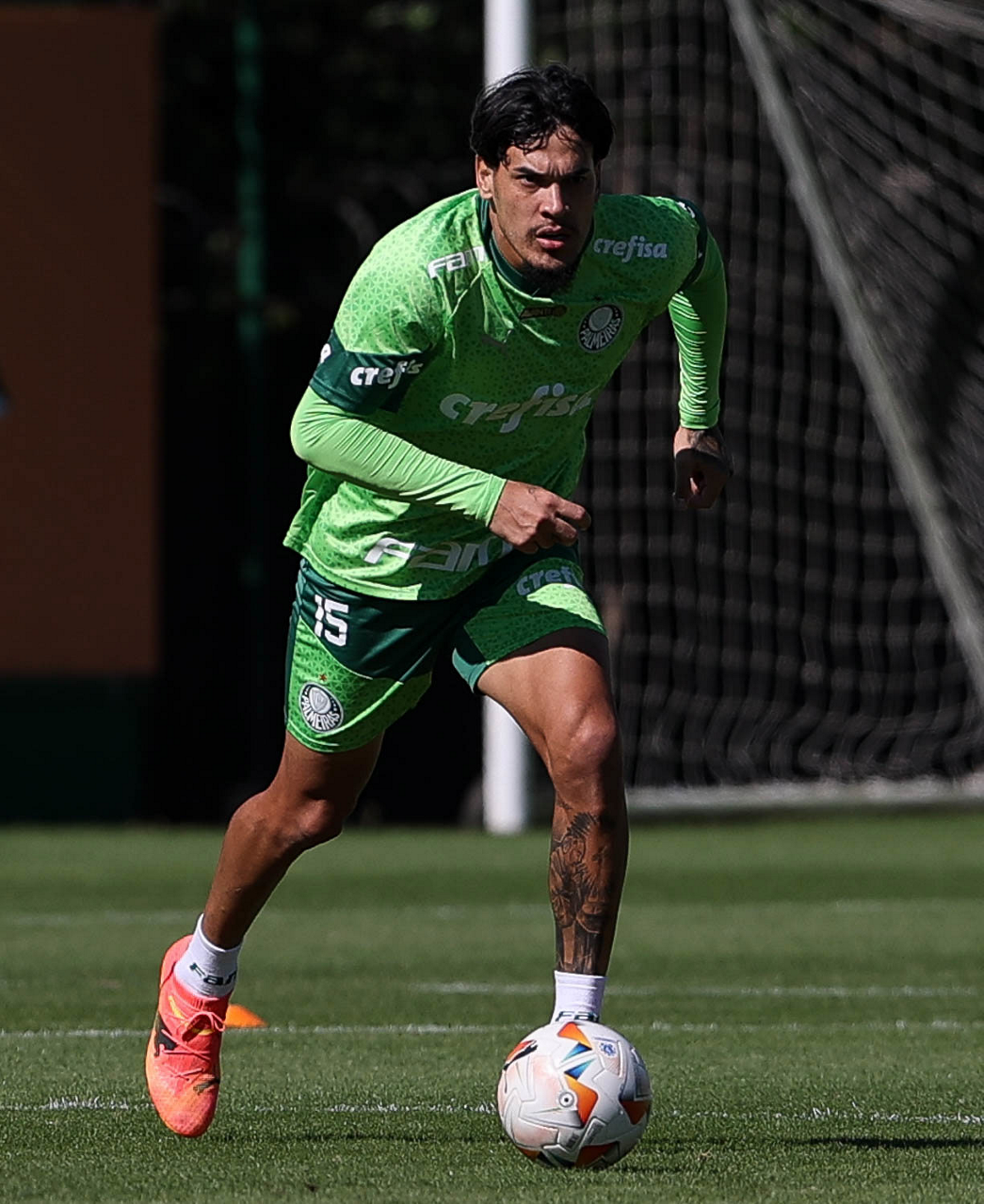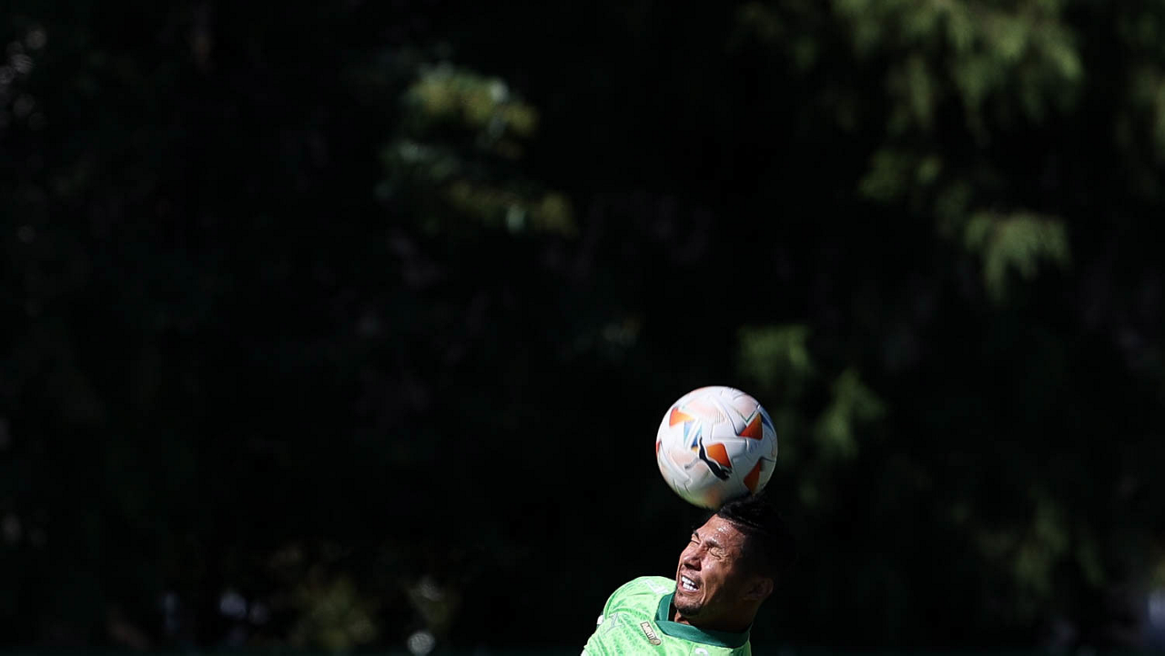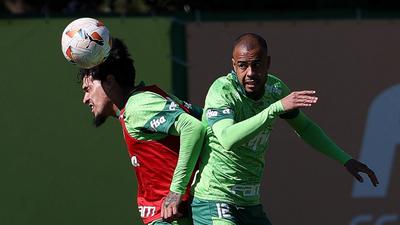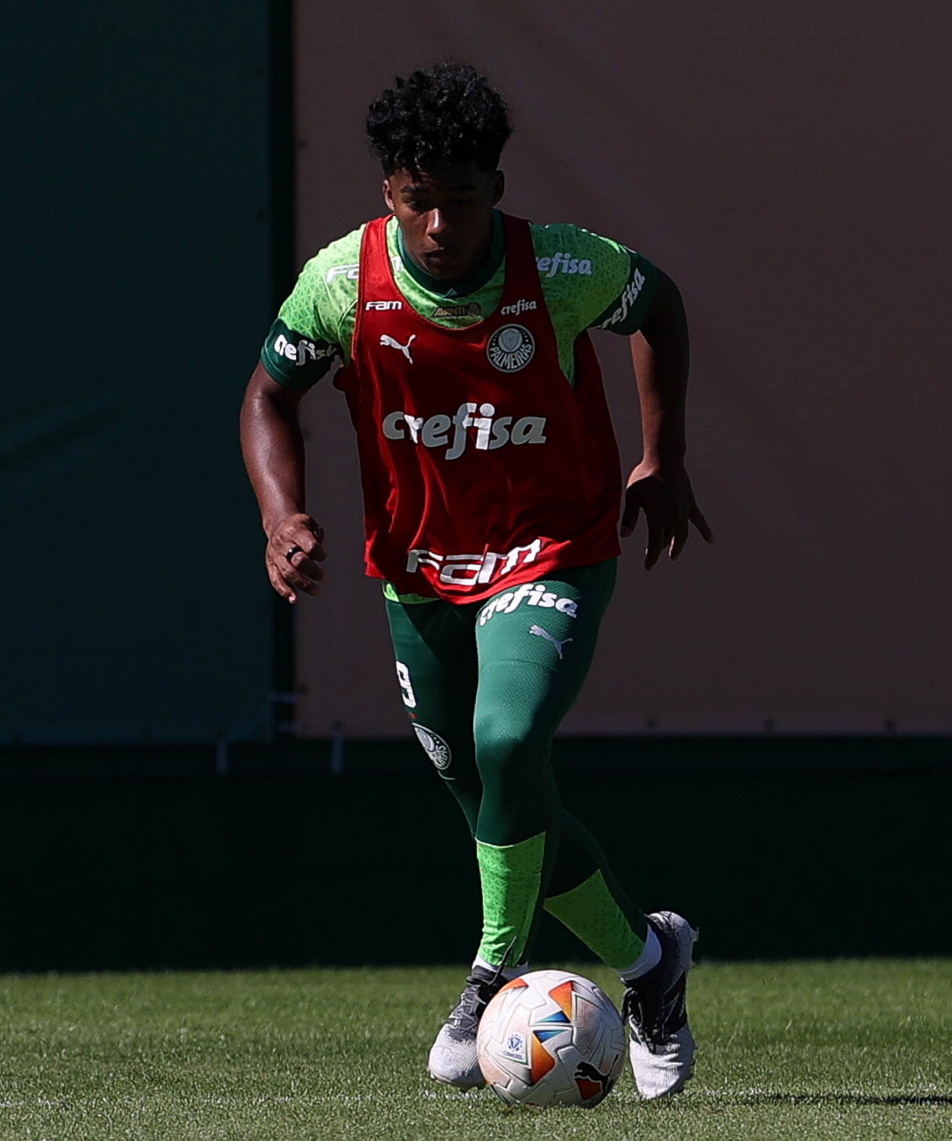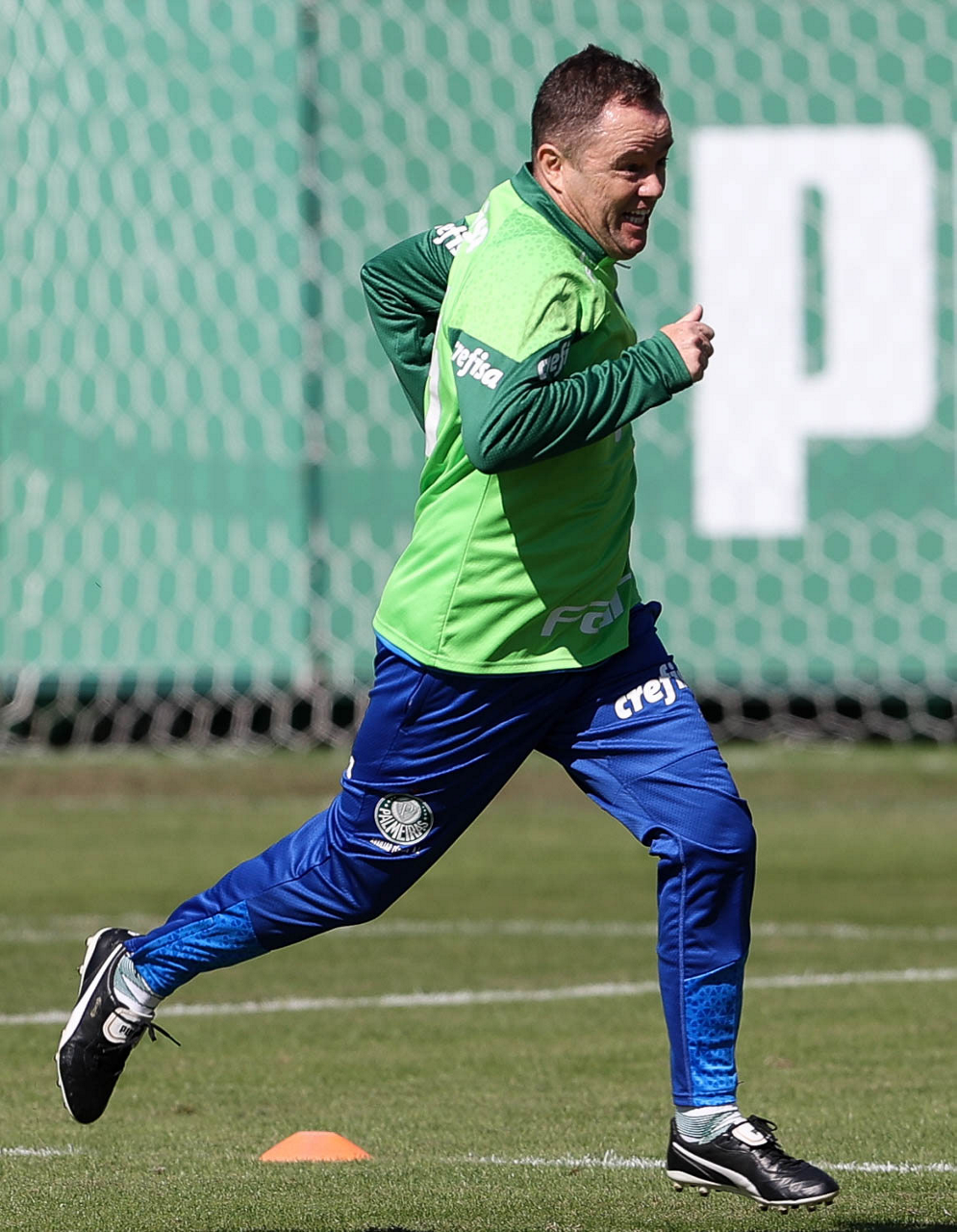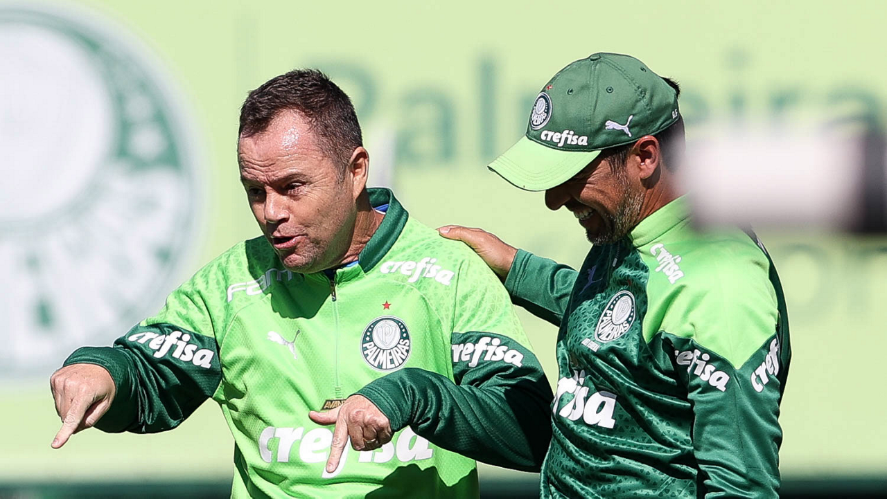 Os jogadores Zé Rafael, Rômulo, Marcelo Lomba, Rony, Gabriel Menino, Raphael Veiga, Lázaro, Luan, Garcia, Caio Paulista, Marcos Rocha e Mayke (E/D) e o auxiliar técnico Andrey Lopes (C), da SE Palmeiras, durante treinamento, na Academia de Futebol. (Foto: Cesar Greco/Palmeiras/by Canon)