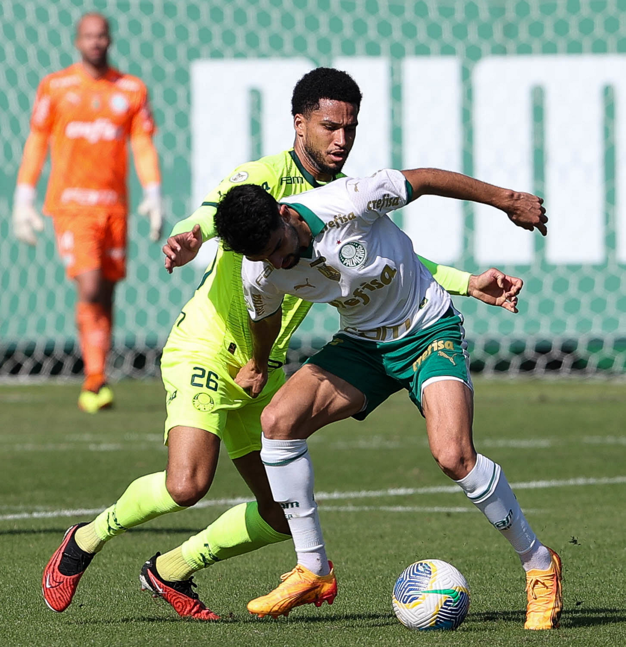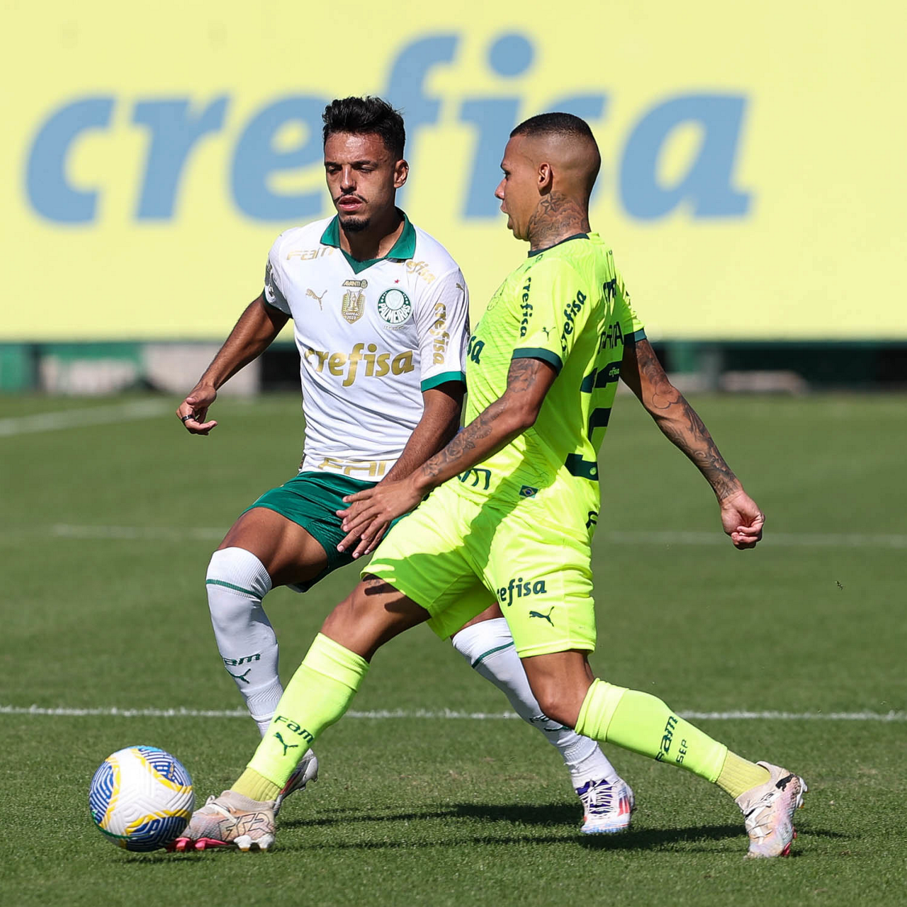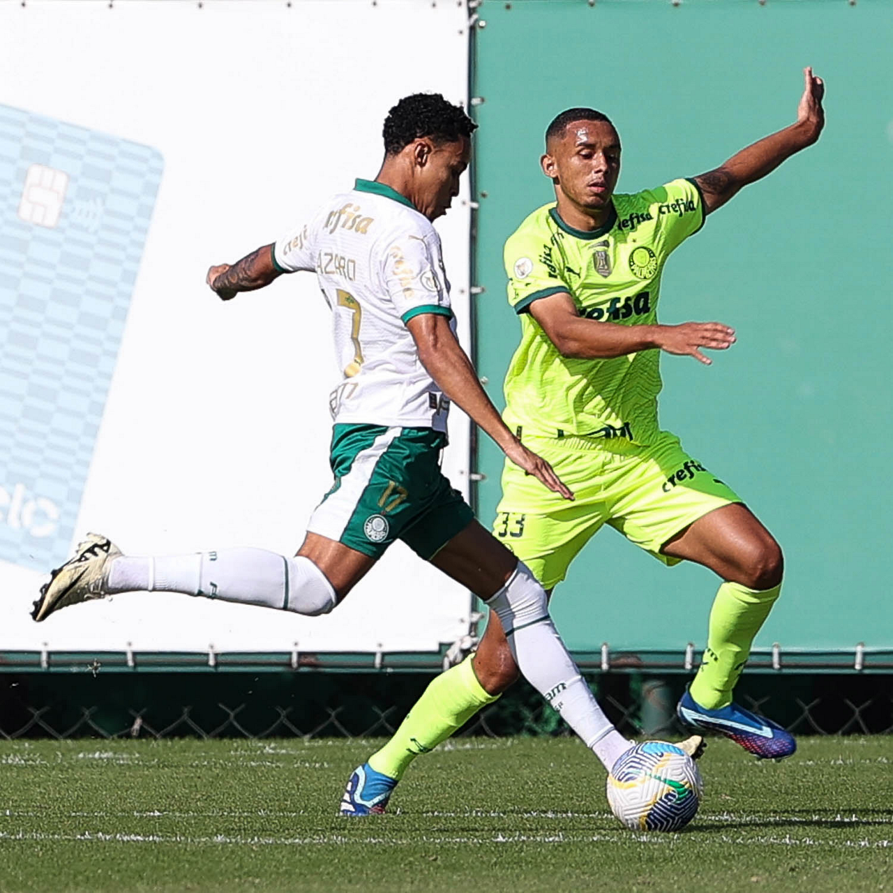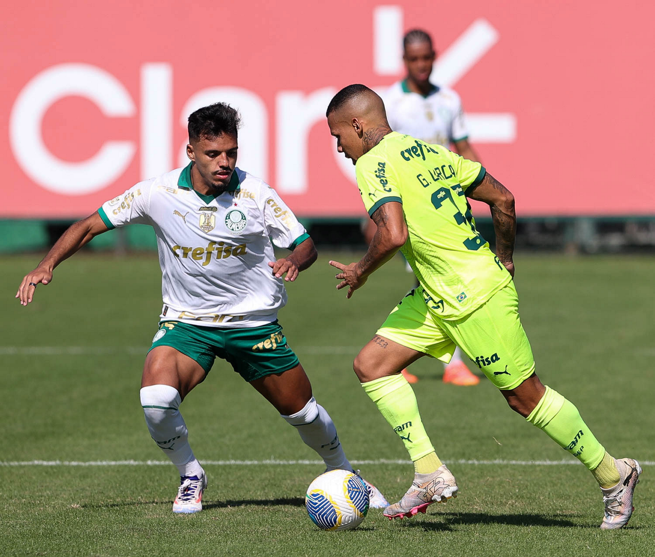 Os jogadores Gabriel Menino e Garcia (D), da SE Palmeiras, durante jogo-treino, na Academia de Futebol. (Foto: Cesar Greco/Palmeiras/by Canon)