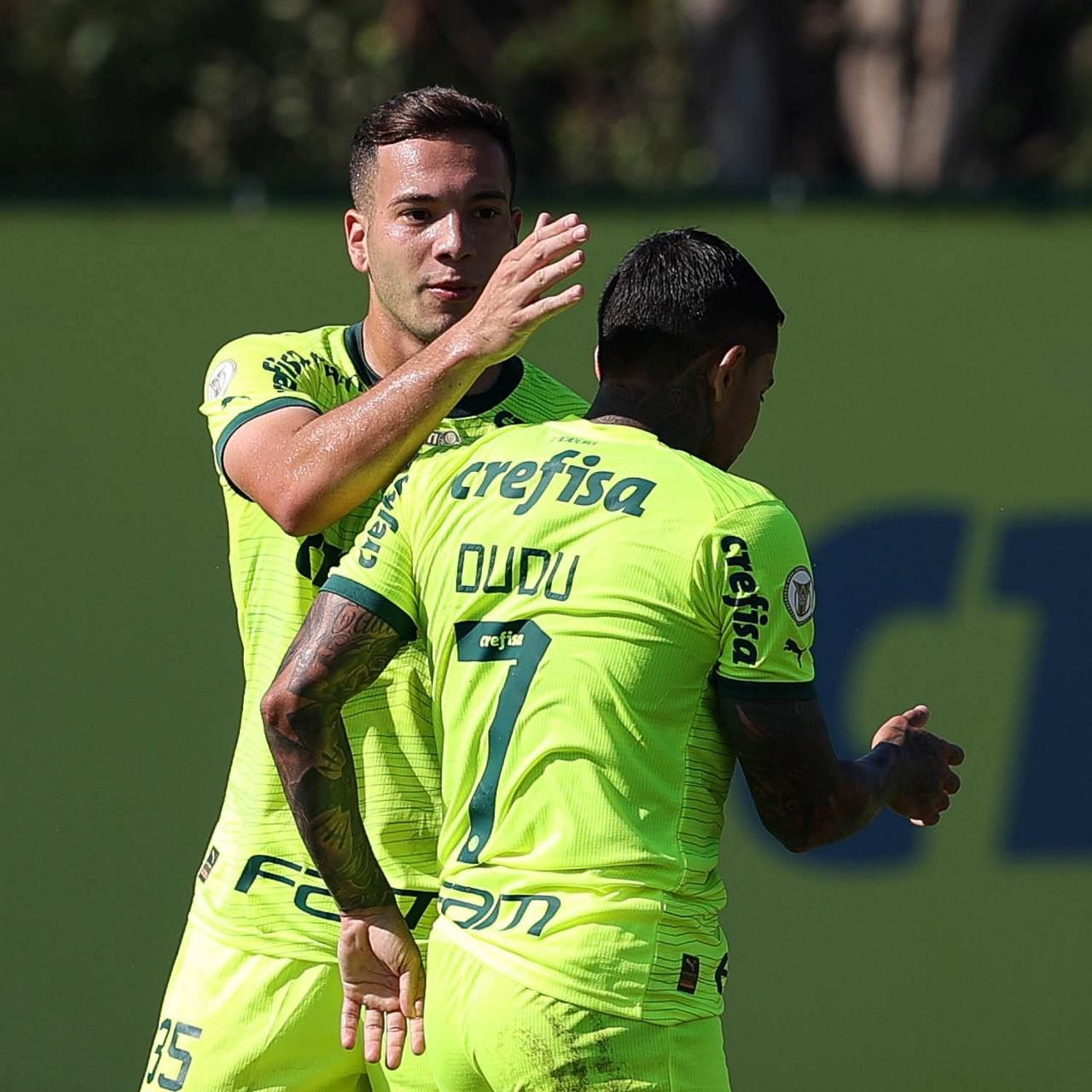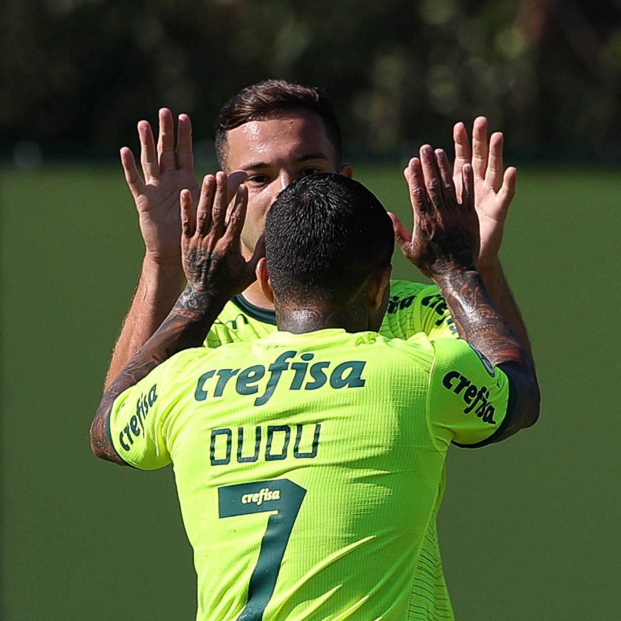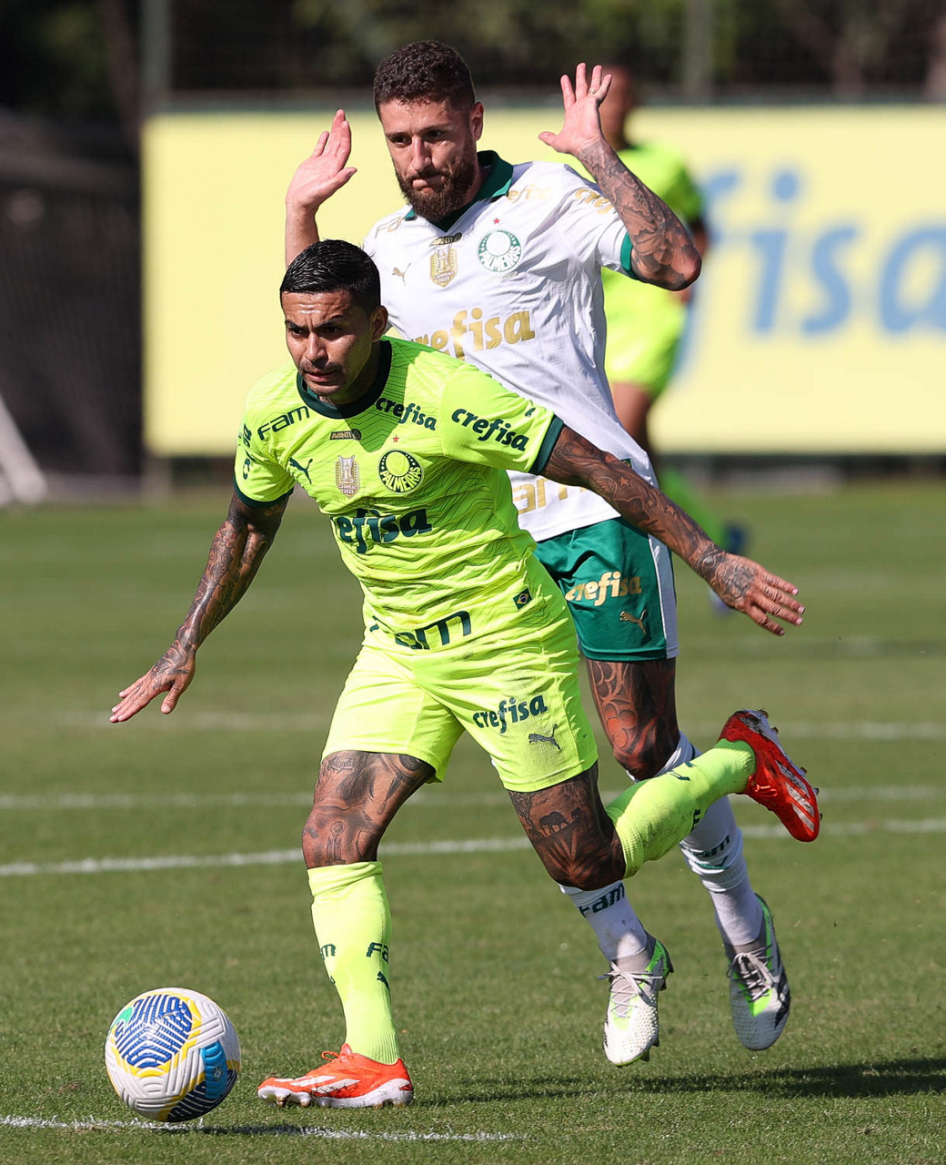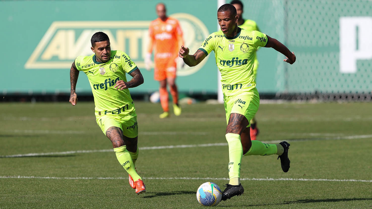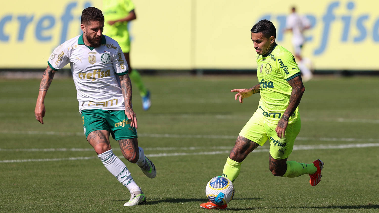 Os jogadores Raphael Veiga e Dudu (D), da SE Palmeiras, durante jogo-treino, na Academia de Futebol. (Foto: Cesar Greco/Palmeiras/by Canon)