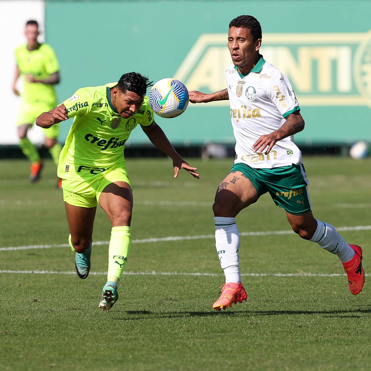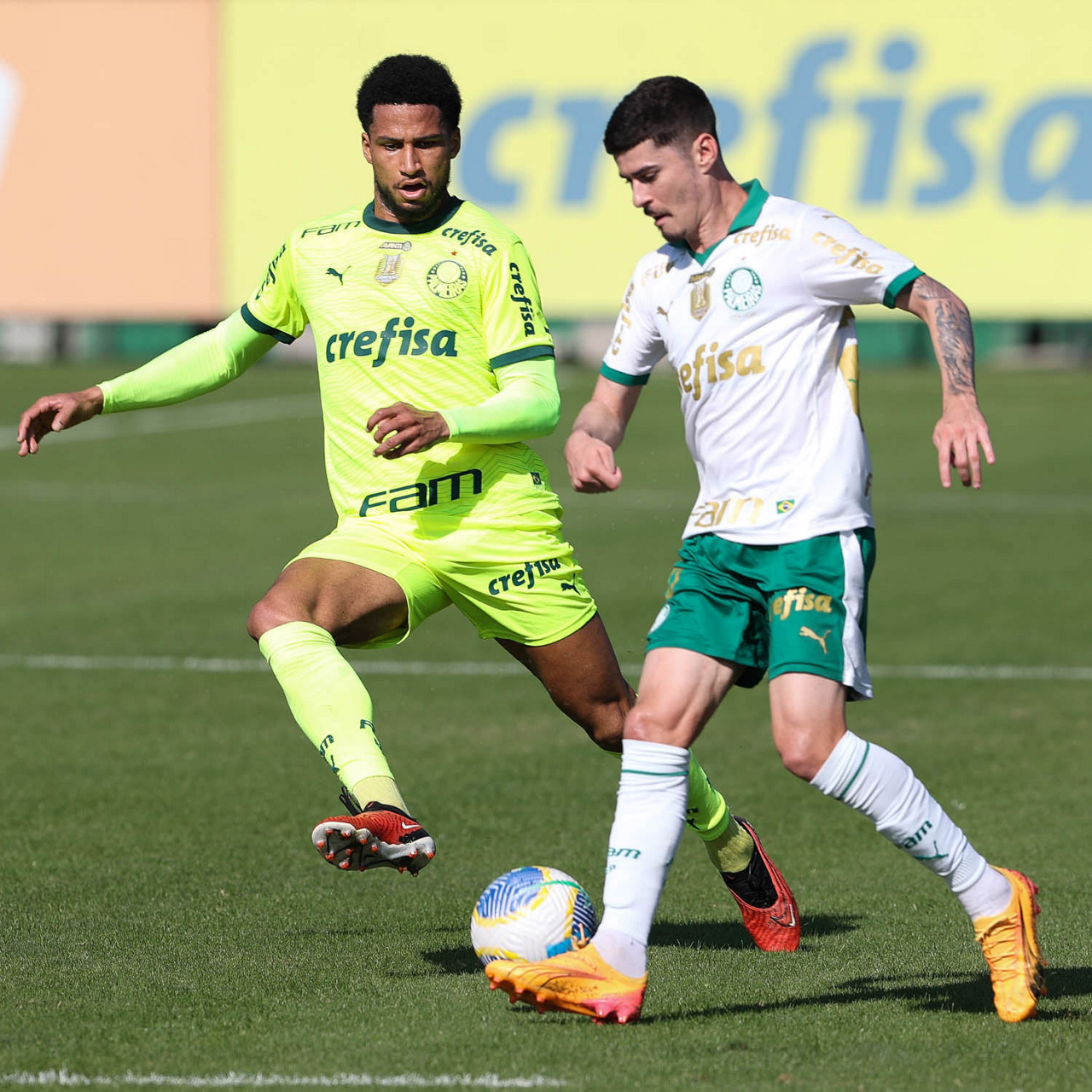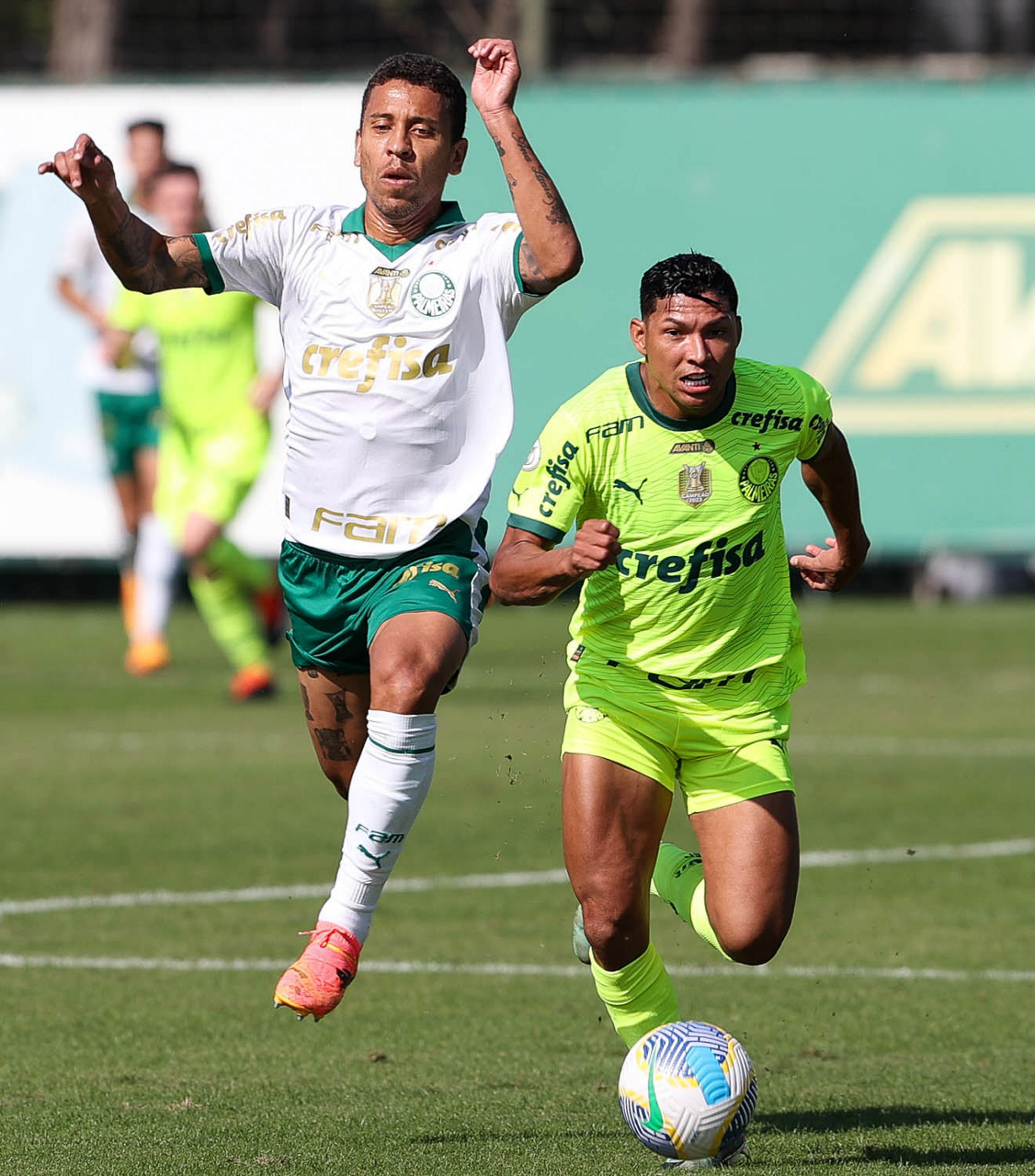 Os jogadores Anibal Moreno e Raphael Veiga (D), da SE Palmeiras, durante jogo-treino, na Academia de Futebol. (Foto: Cesar Greco/Palmeiras/by Canon)
