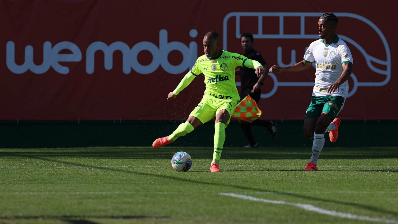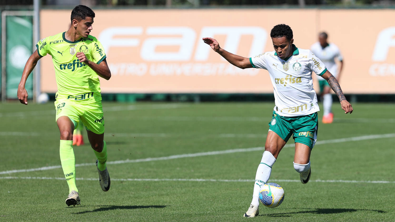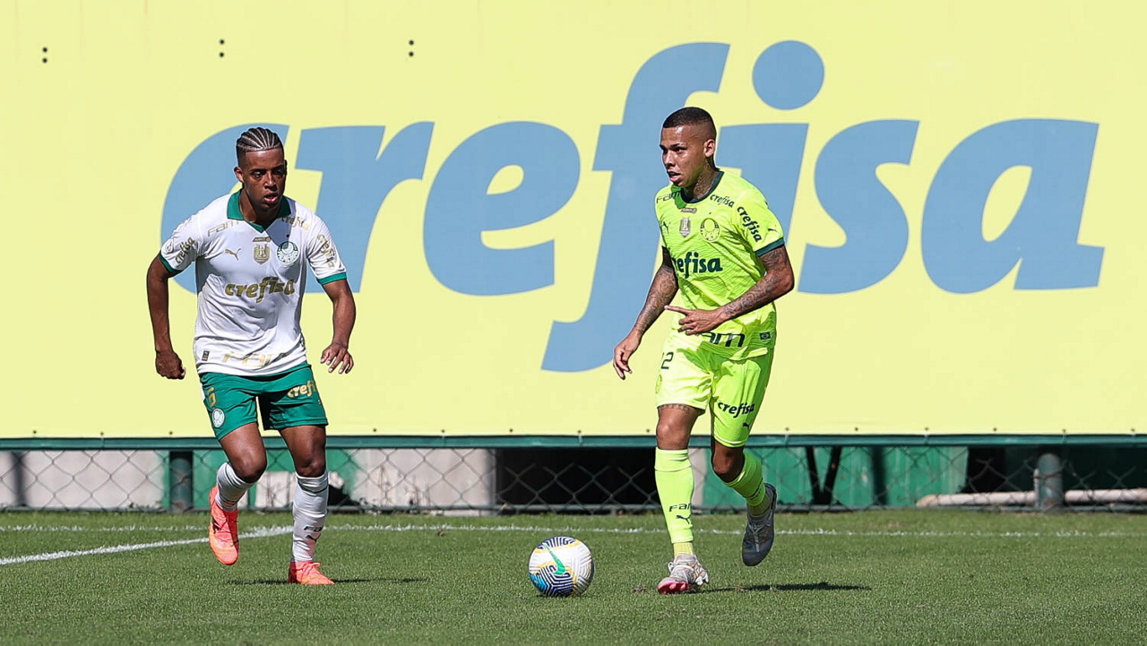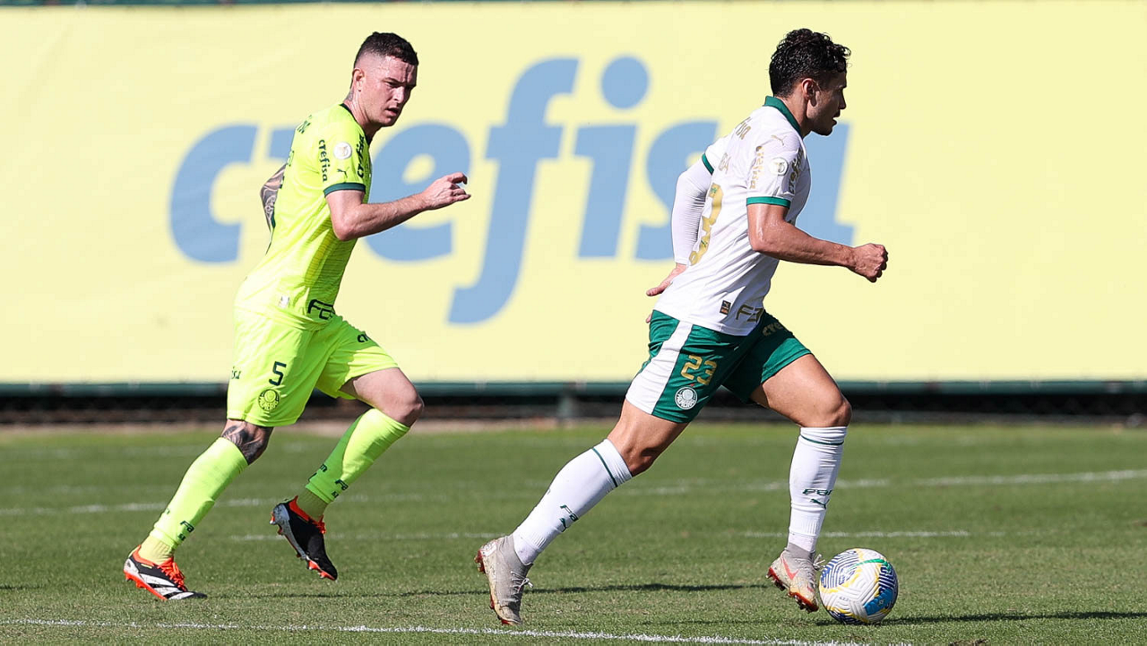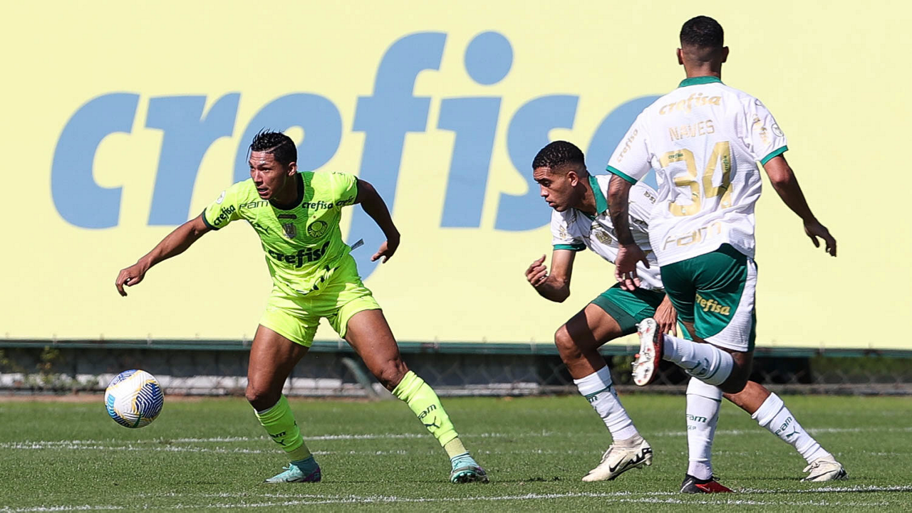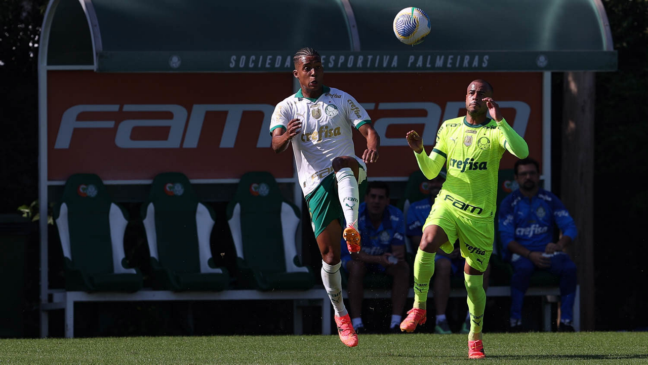 O jogador Gabriel Menino, da SE Palmeiras, durante jogo-treino, na Academia de Futebol. (Foto: Cesar Greco/Palmeiras/by Canon)