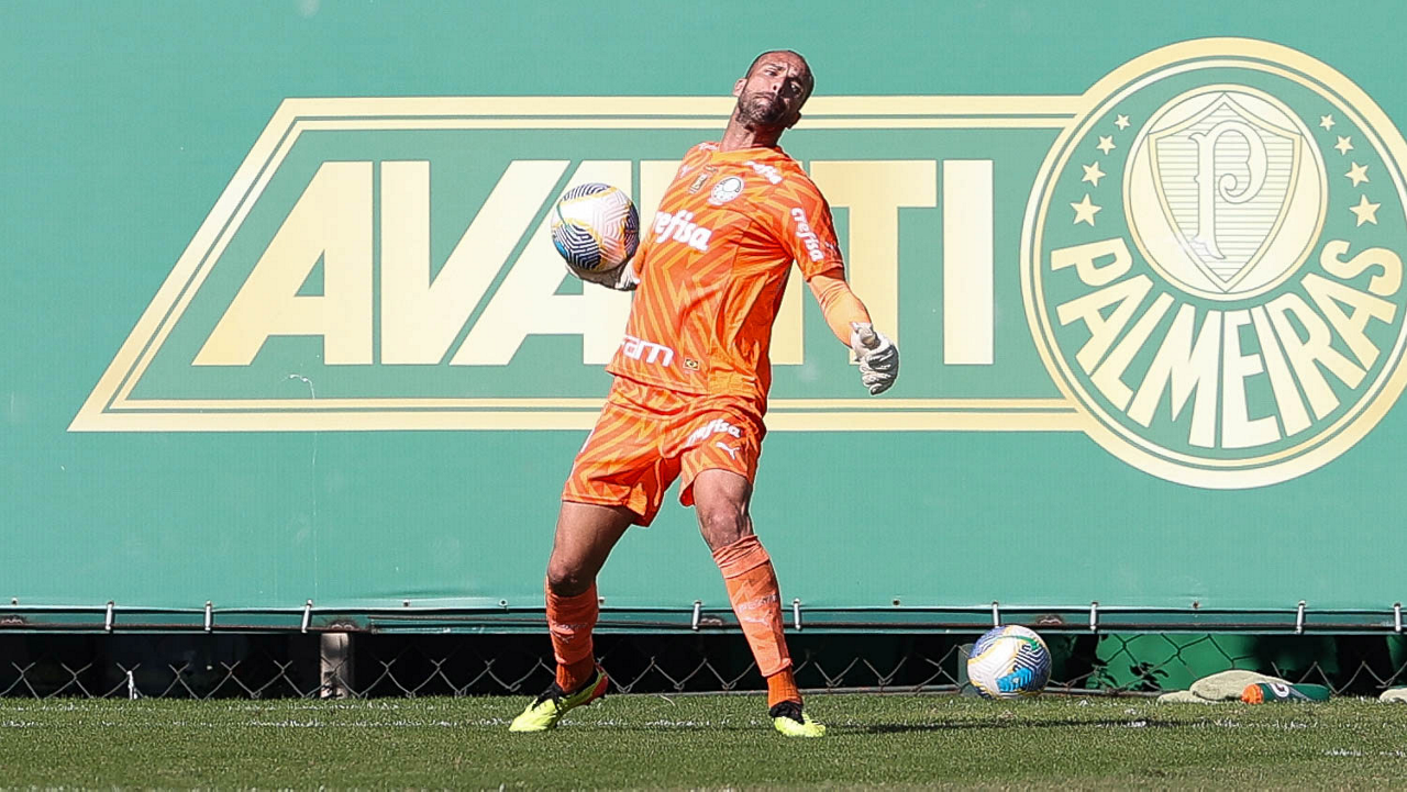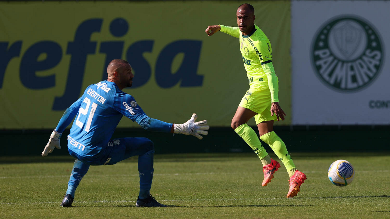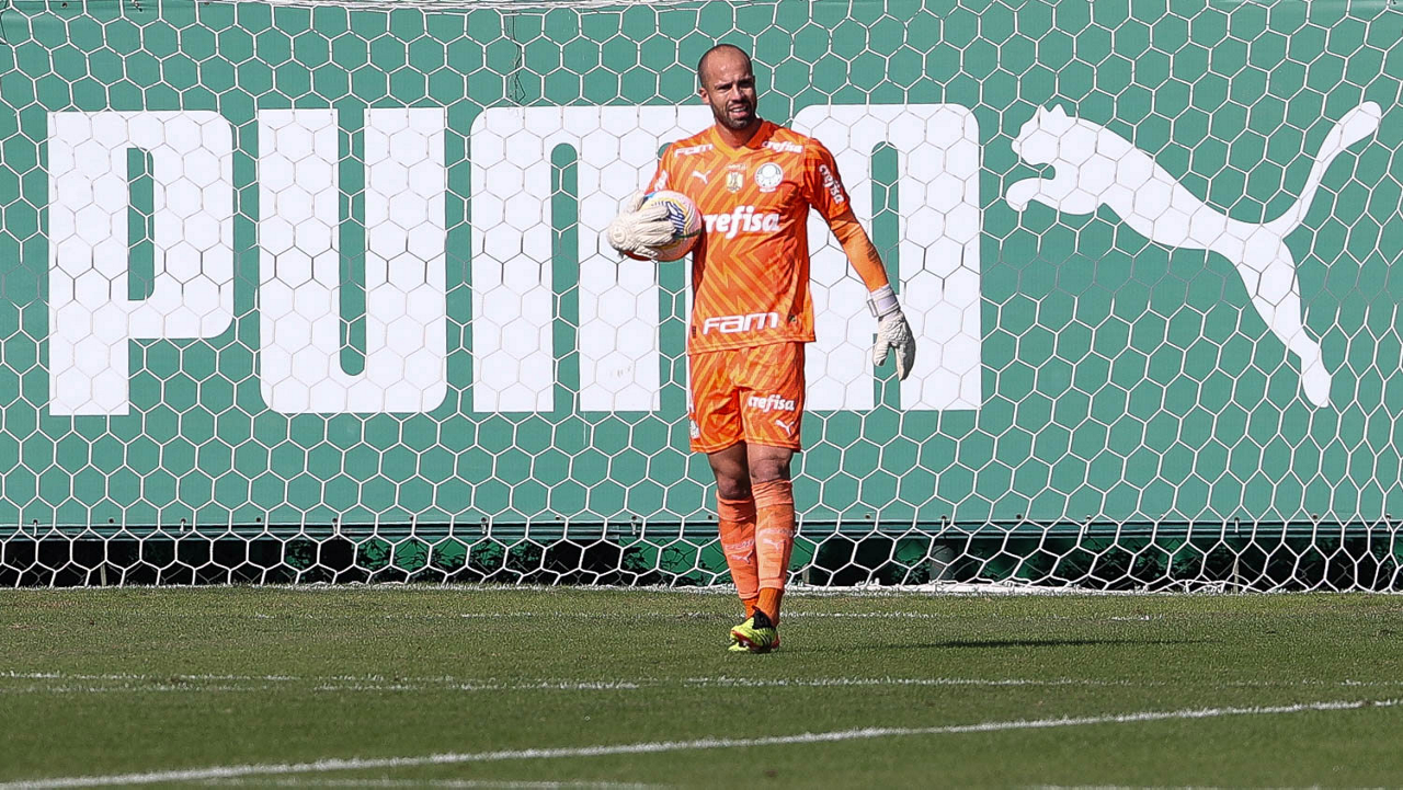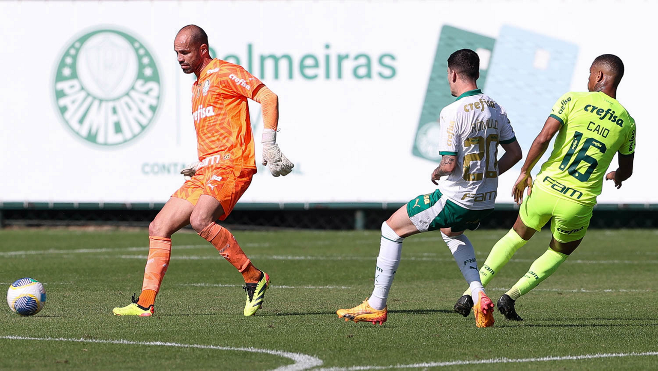 O goleiro Weverton, da SE Palmeiras, durante jogo-treino, na Academia de Futebol. (Foto: Cesar Greco/Palmeiras/by Canon)